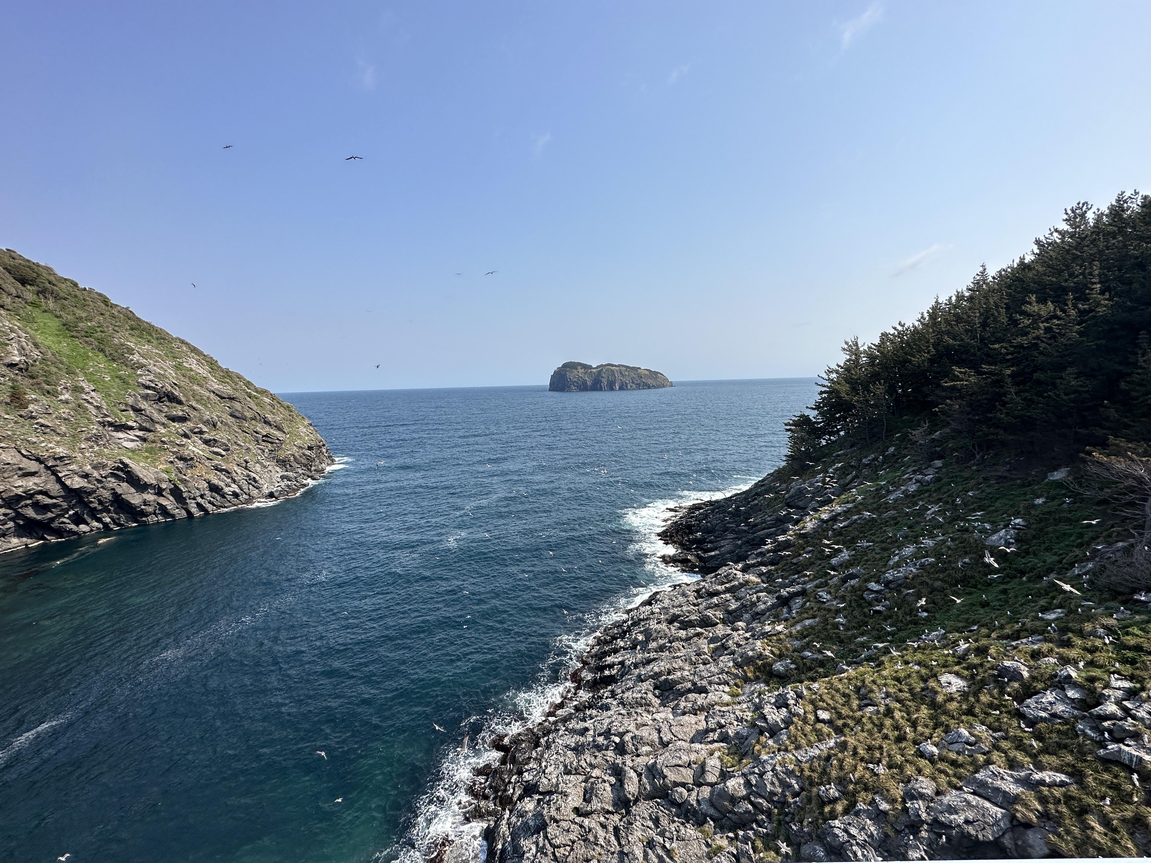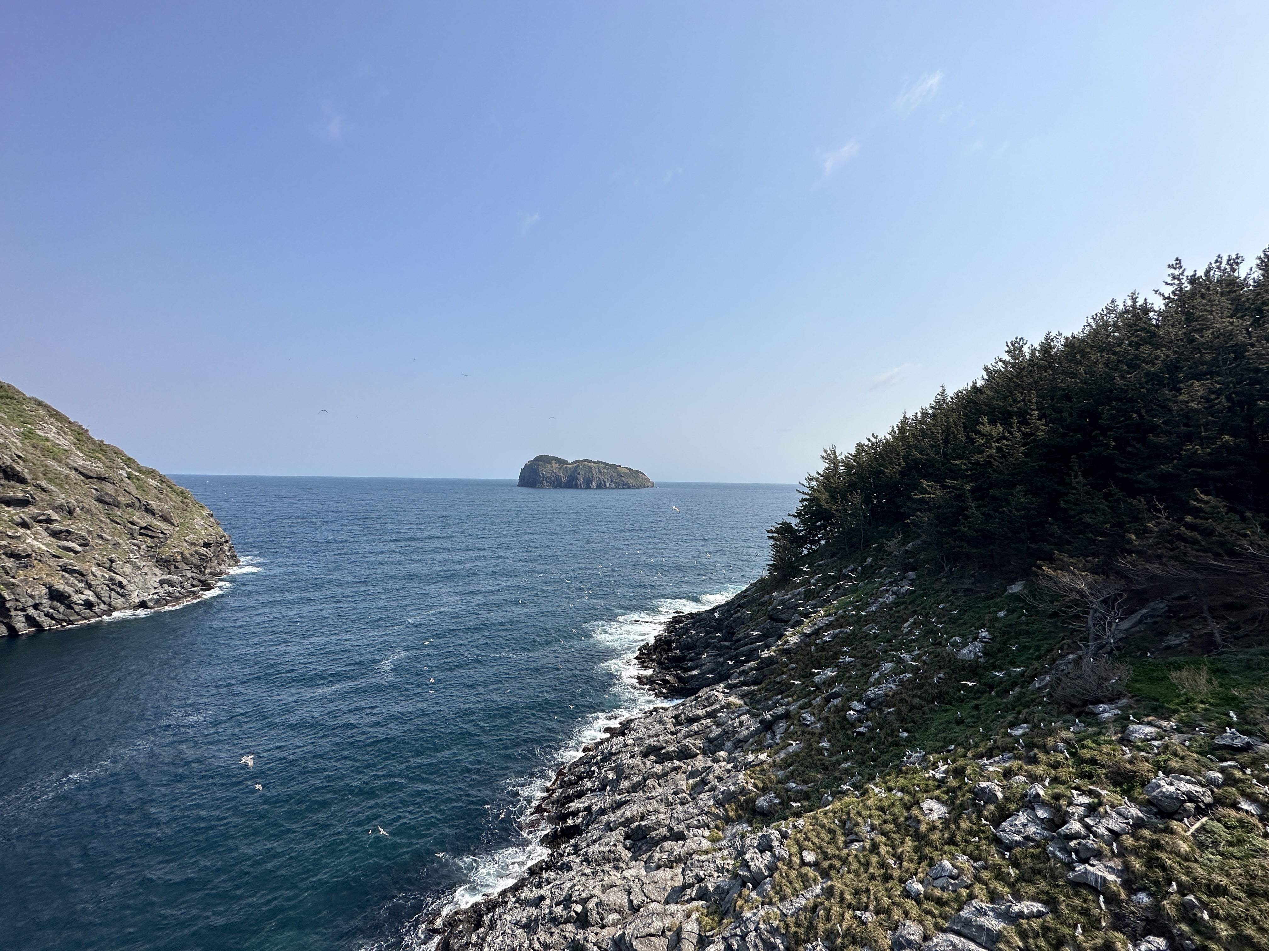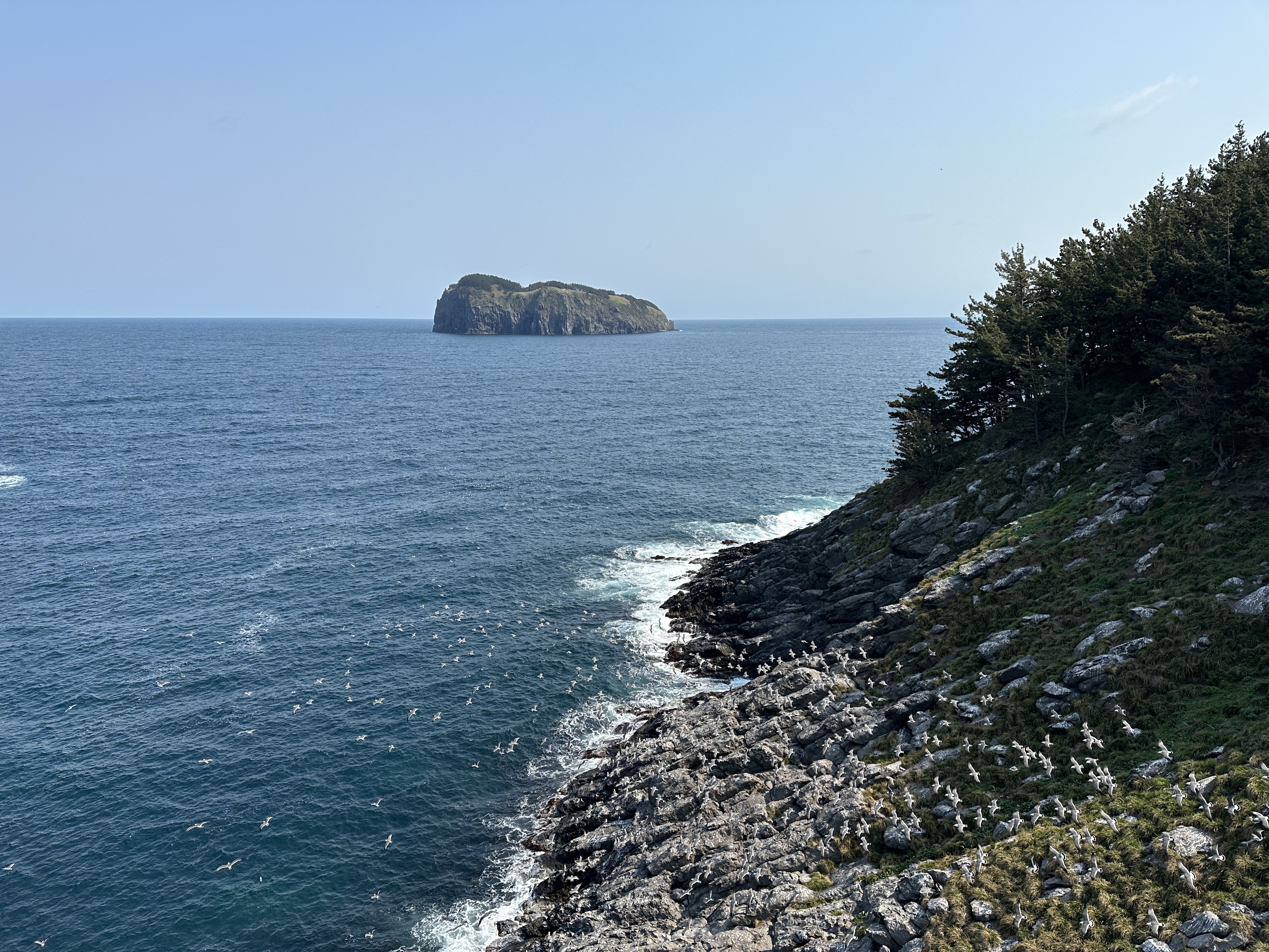 솔직히 처음에는 관음도 자체의 아름다움보다는 가늠할 수 없던 숫자의 갈매기가 눈길을 사로잡습니다. 바다에 있는 흰 점들이 모두 갈매기이고, 잠시 뒤에 있을 영상들에서도 갈매기 울음소리가 모든 사운드를 지배하다시피 합니다.