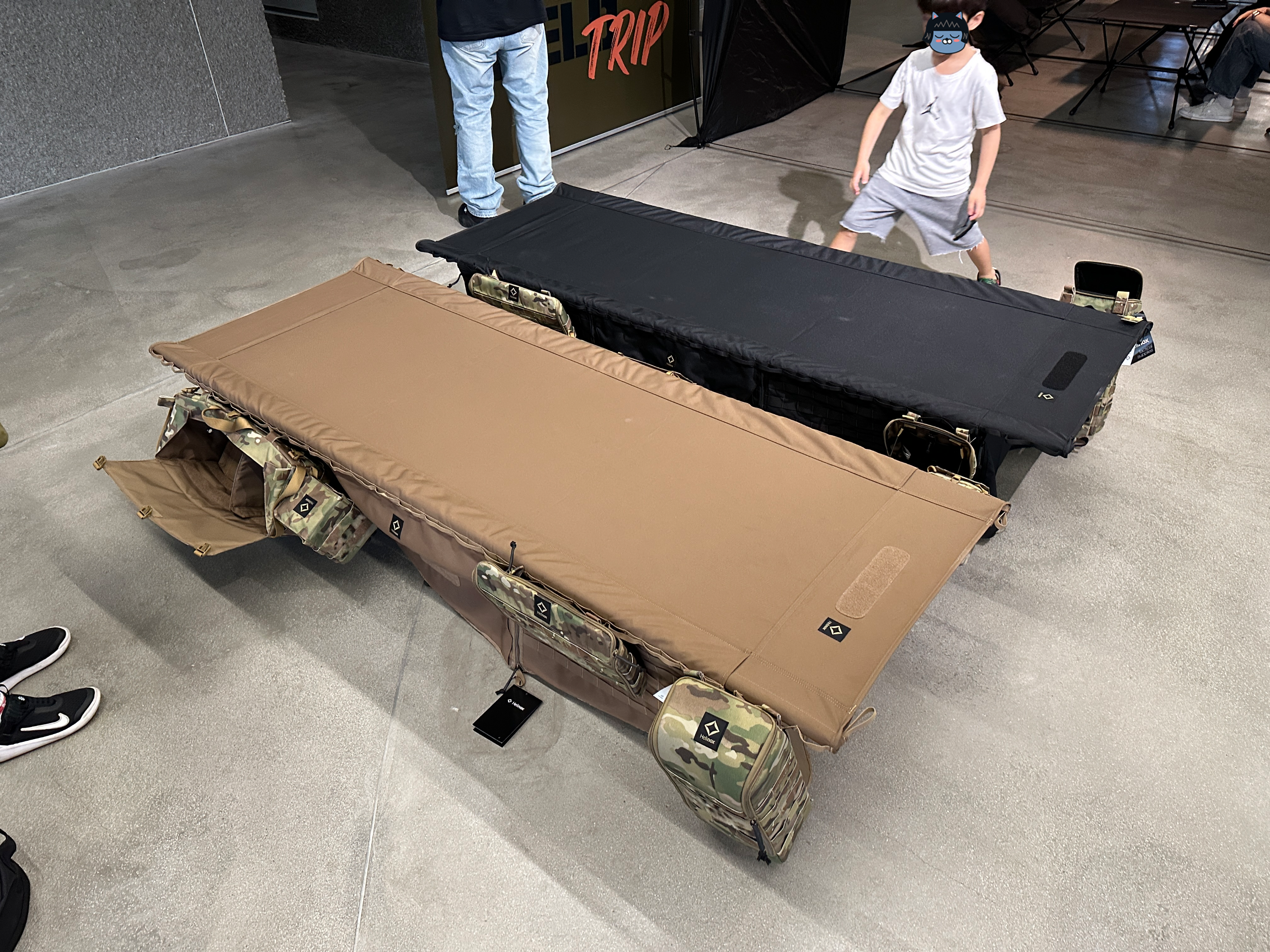 전시장 정 가운데는 이렇게 대형스크린 및 쉼터로 활용하고 계신 공간이 있어요. 아까 위에 본 택티컬 캠프 어드밴스드 제품들이 많이 있어요.