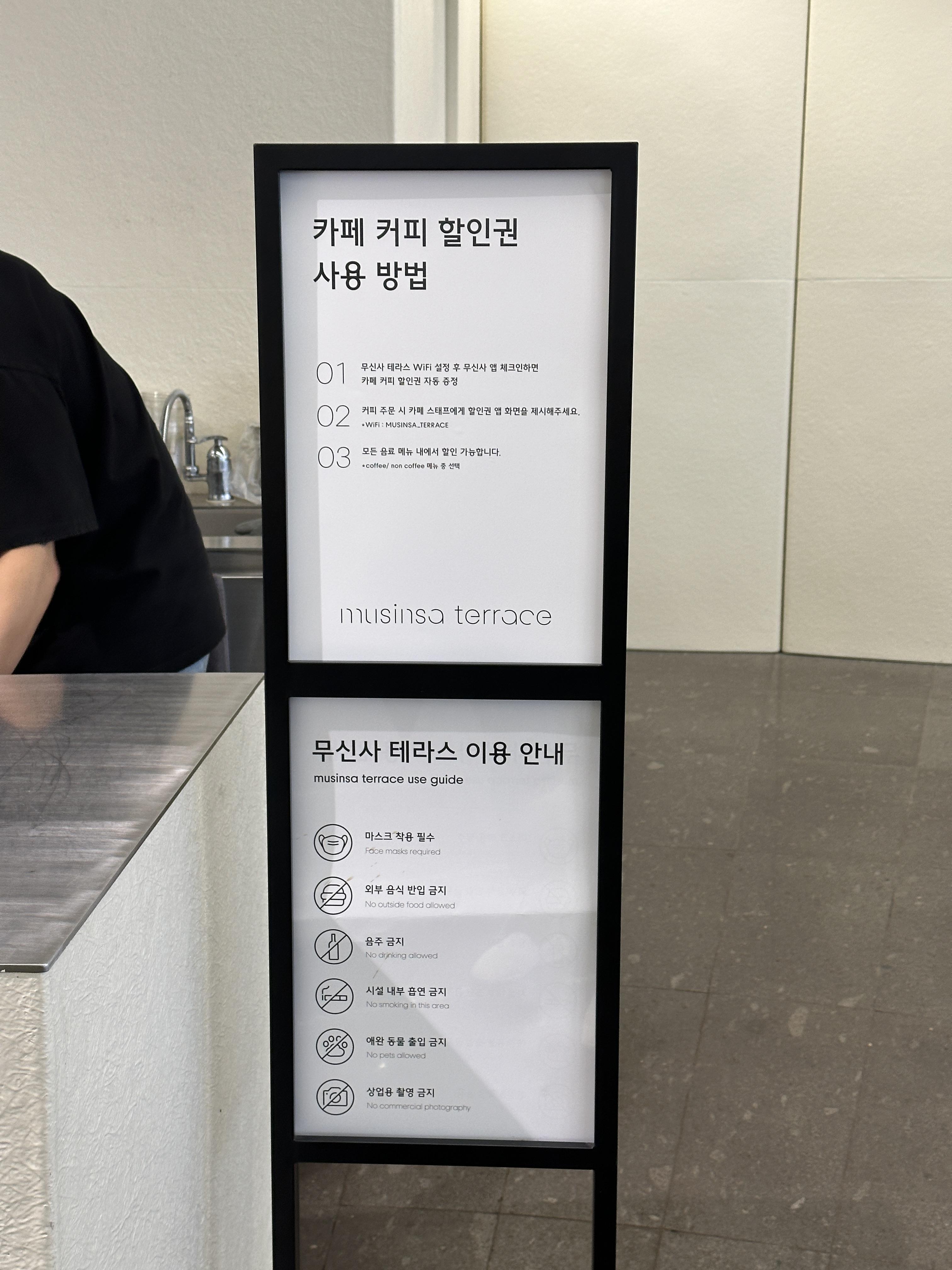 사용방법은, 주문 시 와이파이로 무신사 테라스에 접속 후 어플을 켜면 자동으로 커피쿠폰이 뜨니 직원분께 보여드리고 할인 받으세요!!