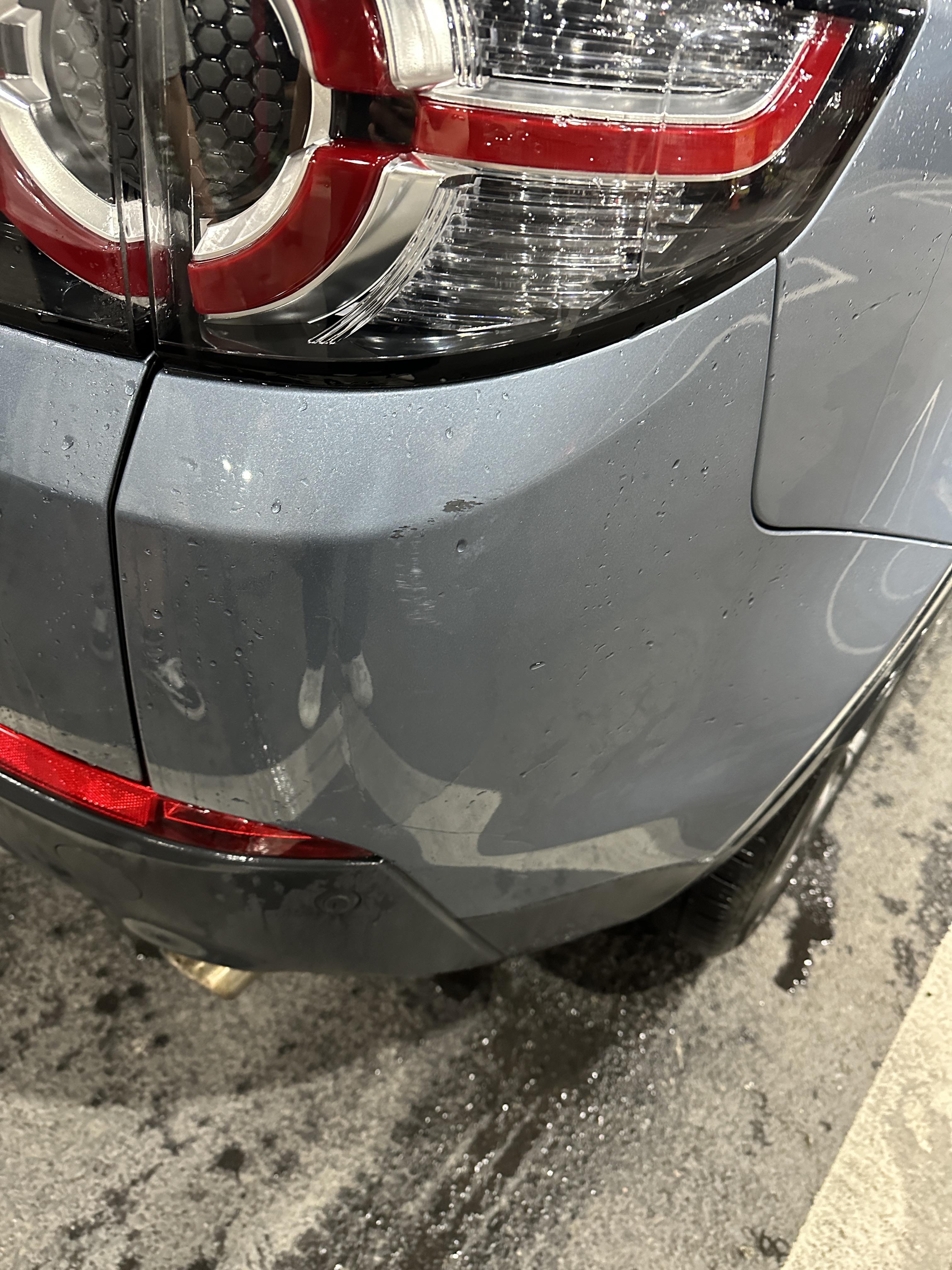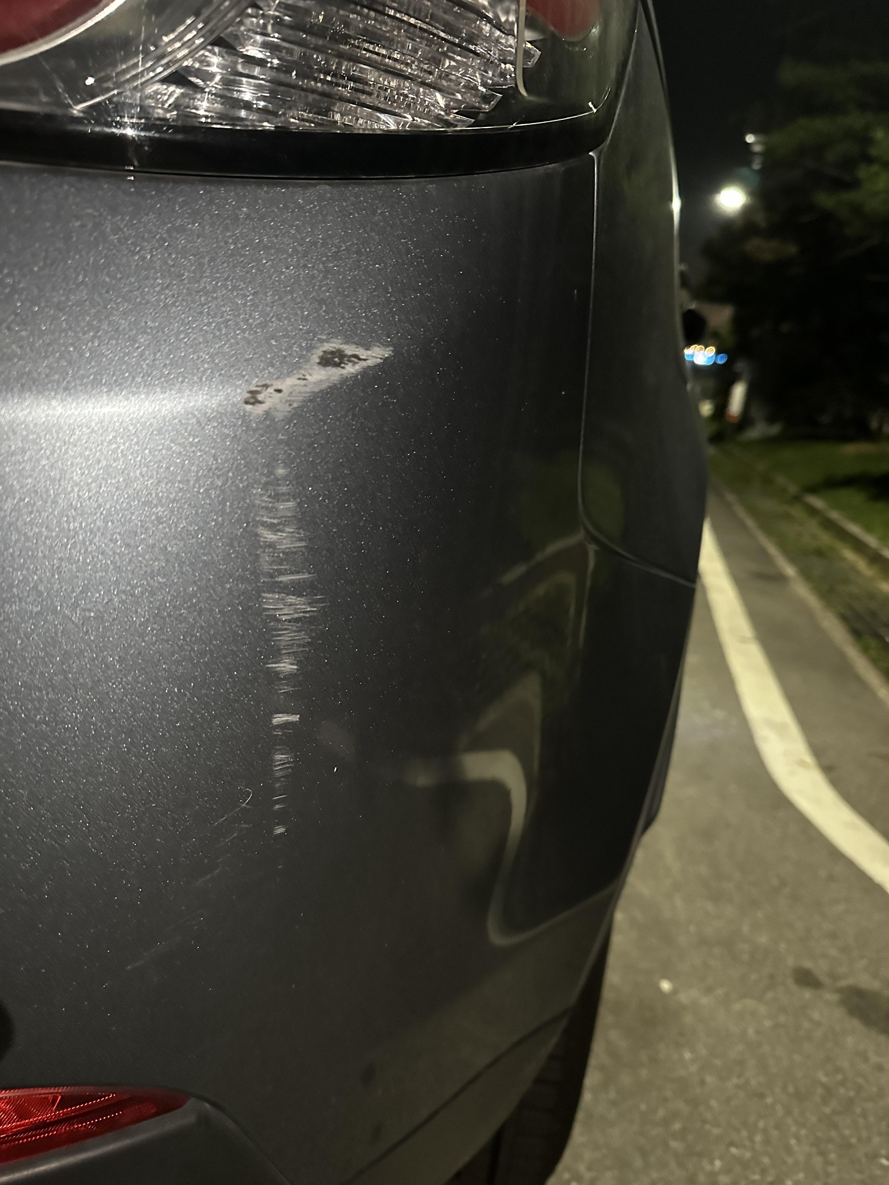 자 일단 제 차는 뒷 범퍼에 상처가 있습니다. 이 상처는 전봇대를 살포시 터치하고 생긴 상처인데요, 약간의 까짐과 스크래치가 있어요.