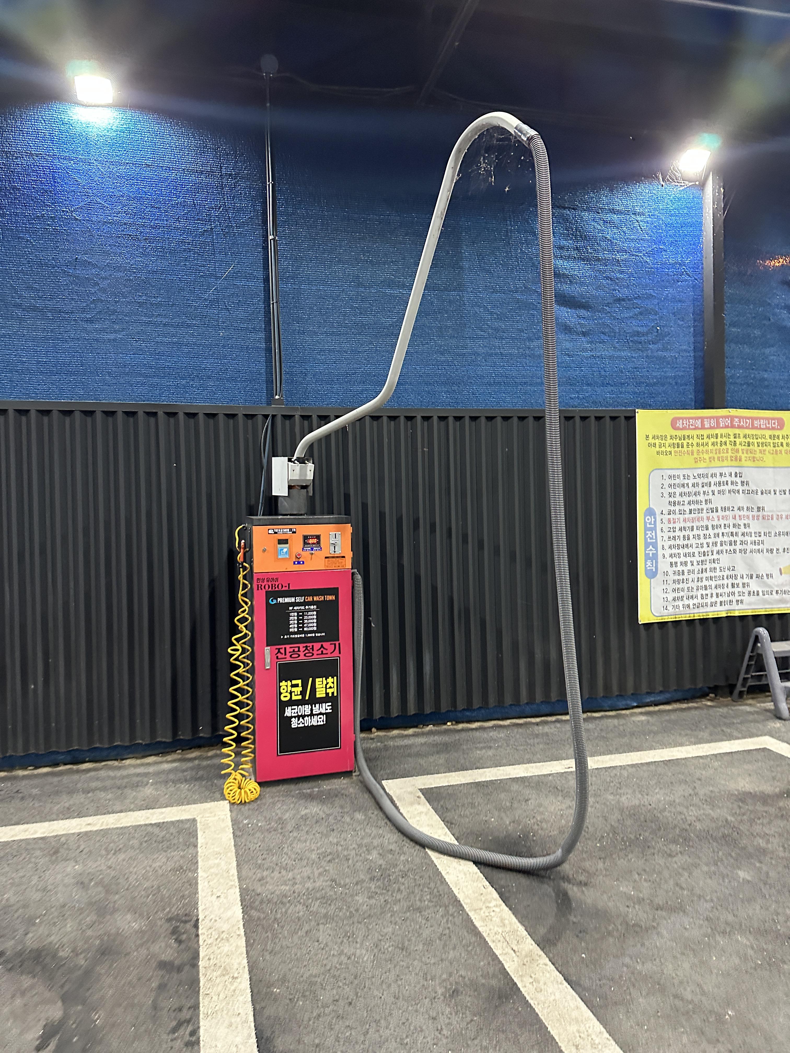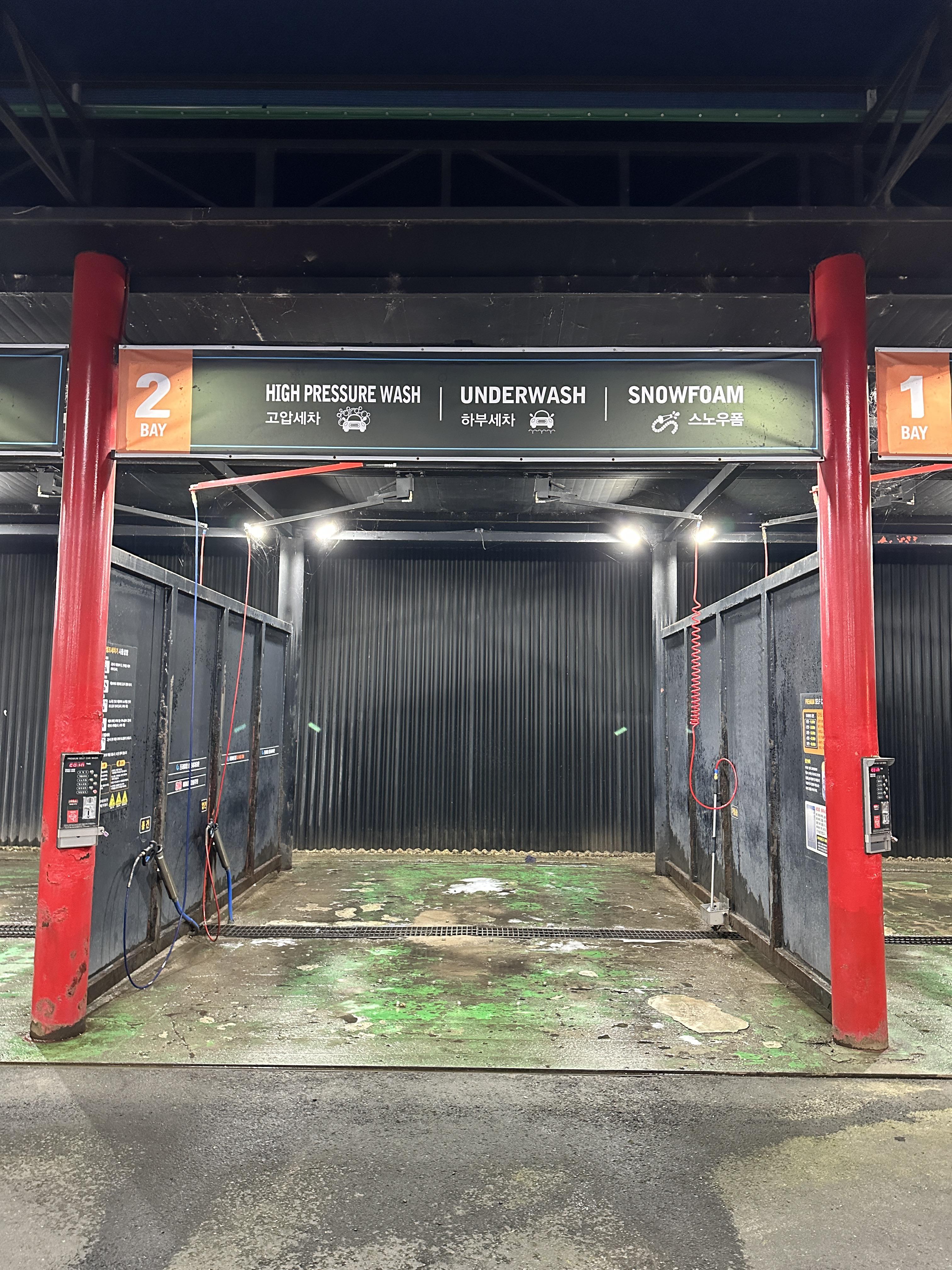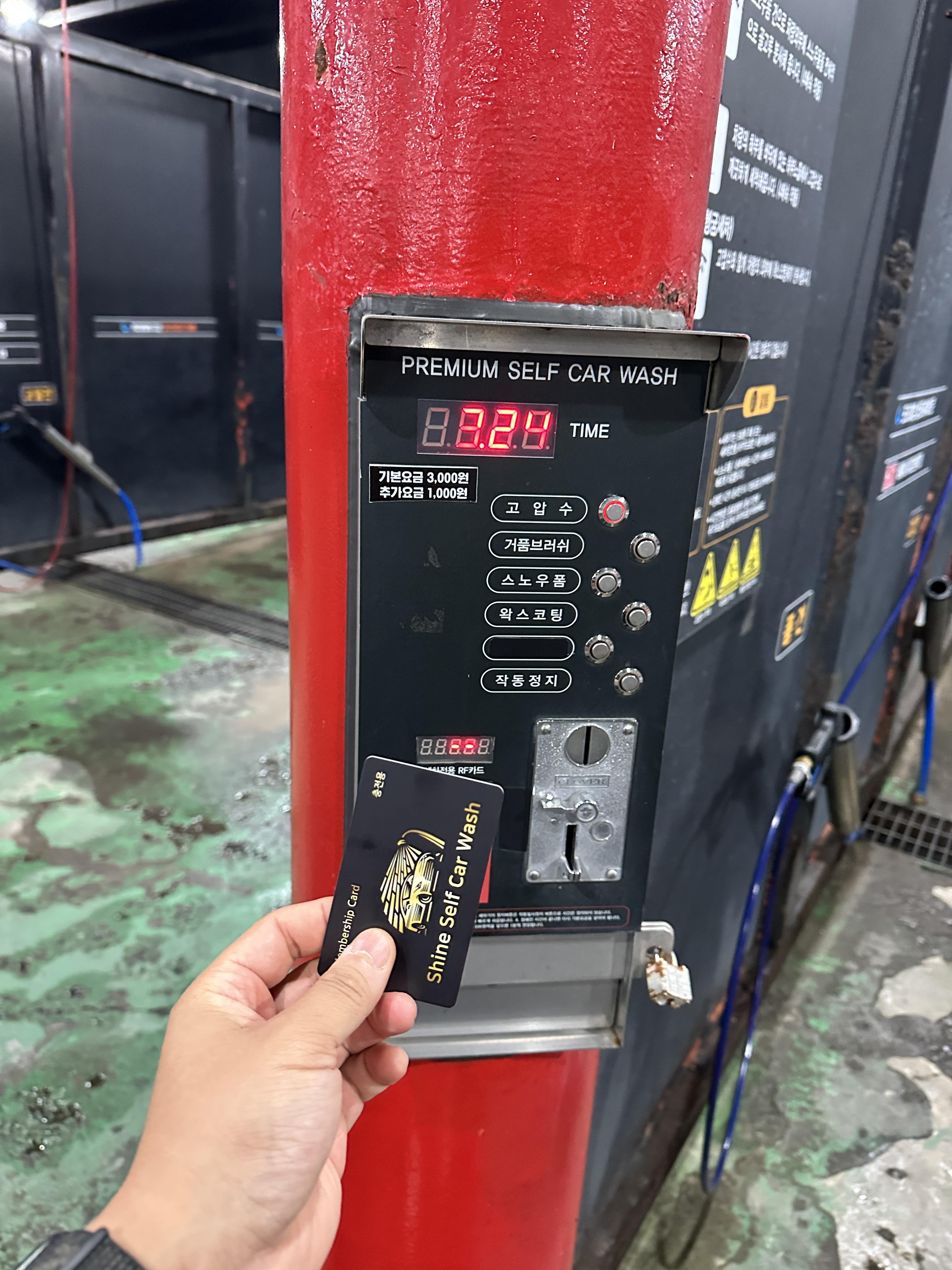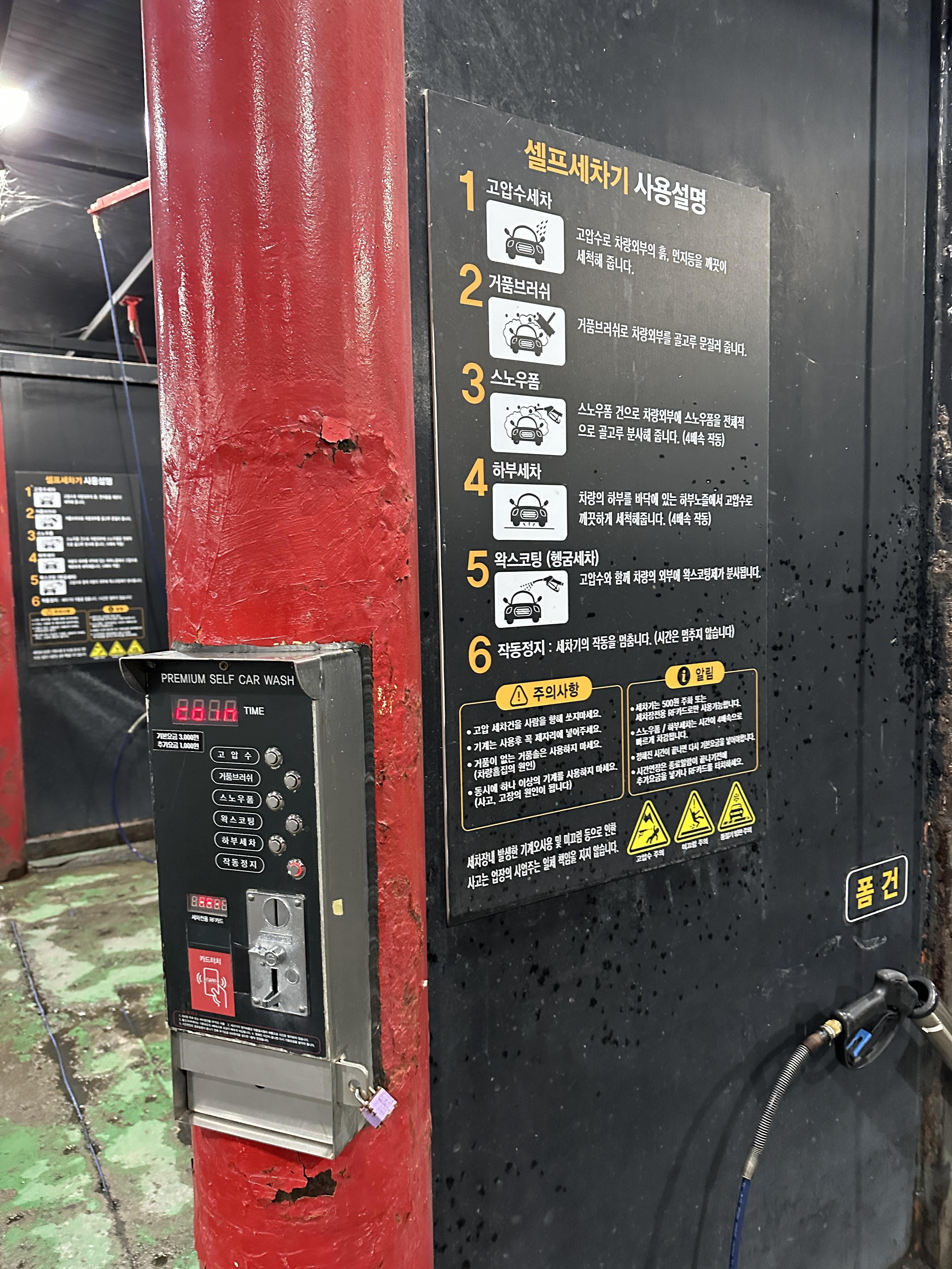 카드 충전을 마치면, 아까 그 고압살수기가 있는 장소에서 바로 이용이 가능합니다. 물론 동전으로 할 수도 있습니다. 그래서 동전 투입구도 보입니다.