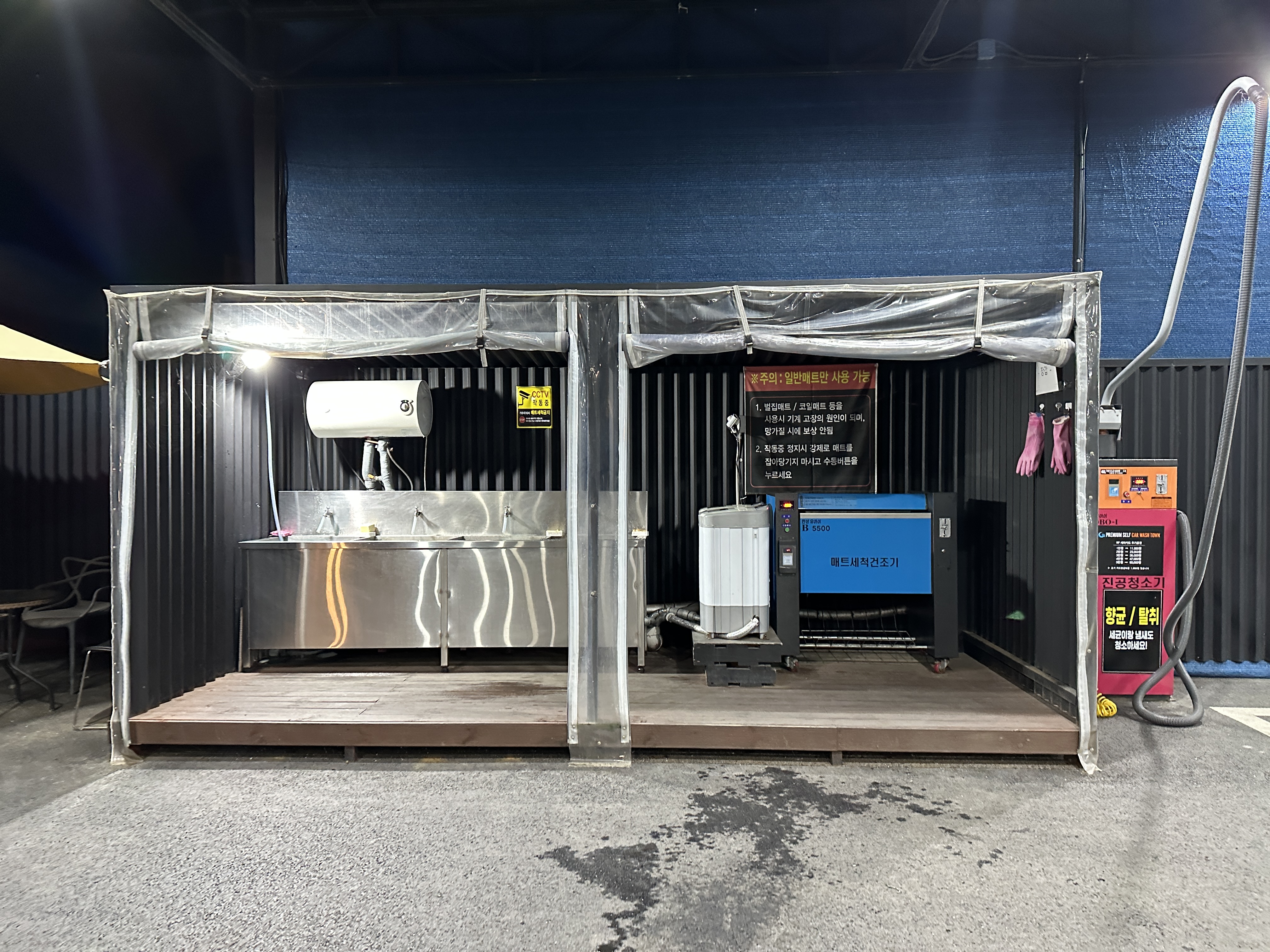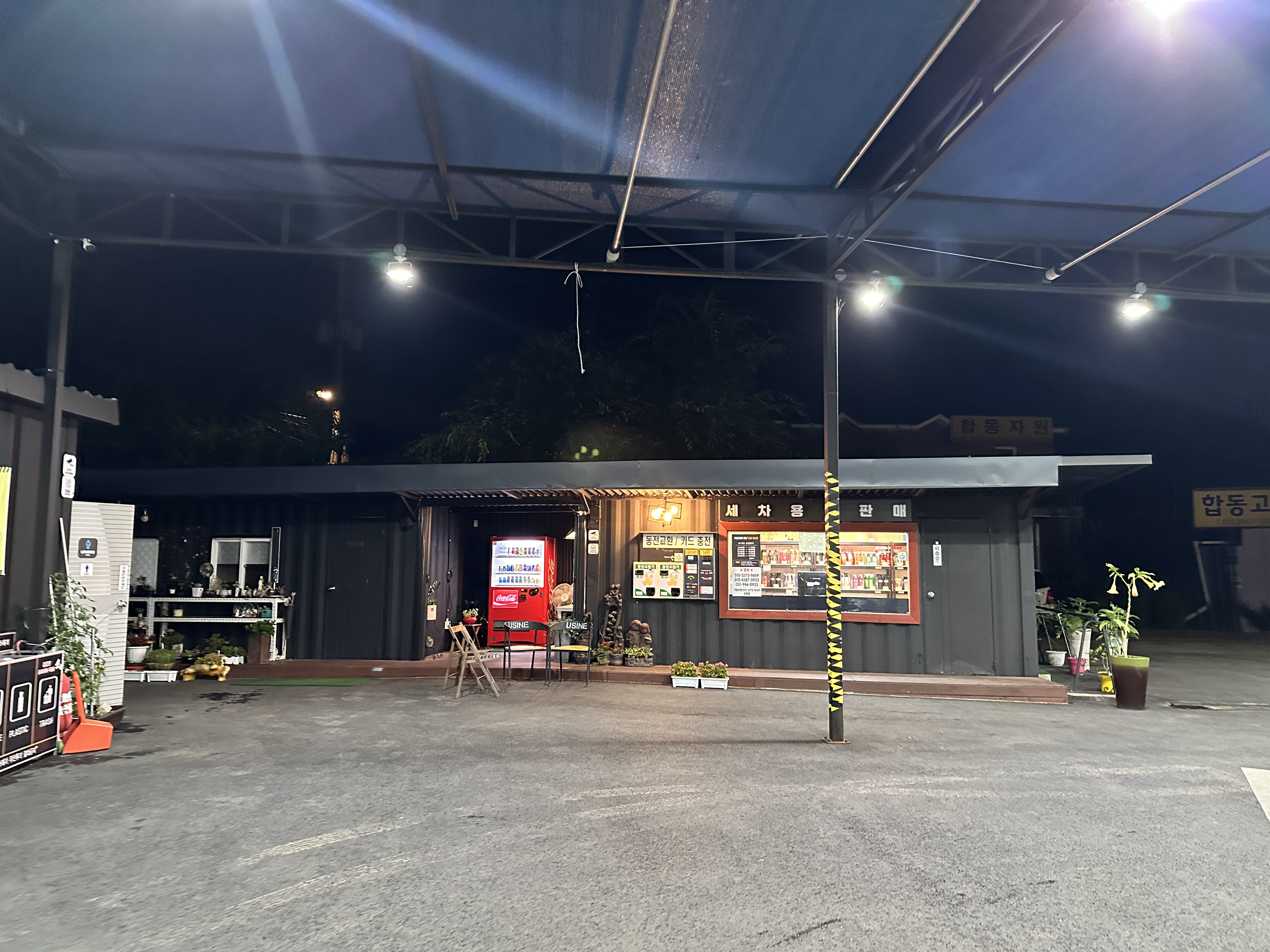 그리고 안쪽에서 입구쪽을 보면, 이렇게 세차용품 판매장 및 카드 충전 장소가 보입니다. 깔끔한 컨테이너 건물입니다. 늦은 시간에 가서 용품 판매소에 직원분이 계시지는 않았지만, 필요하다면 전화 드리시면 되겠습니다.