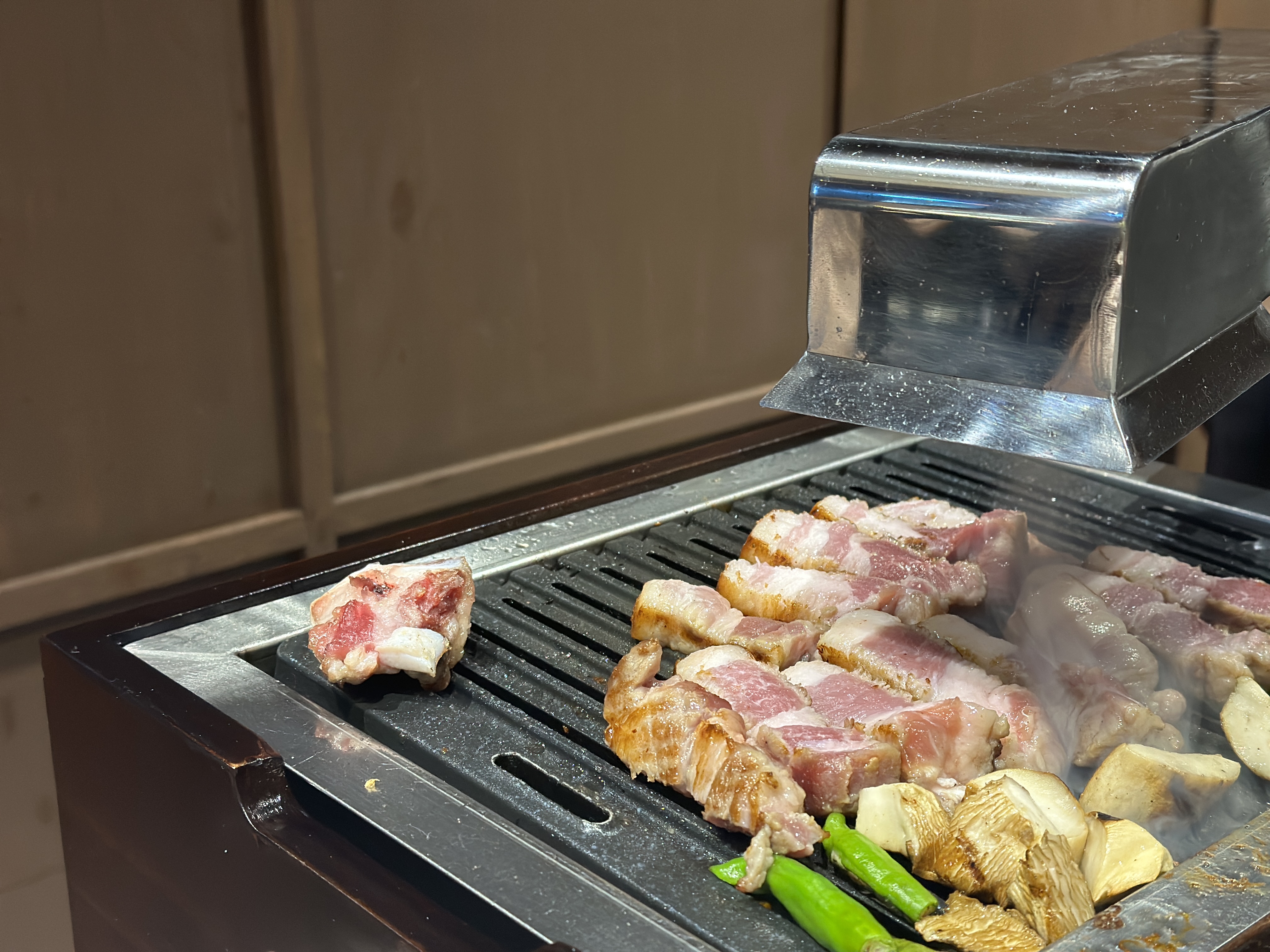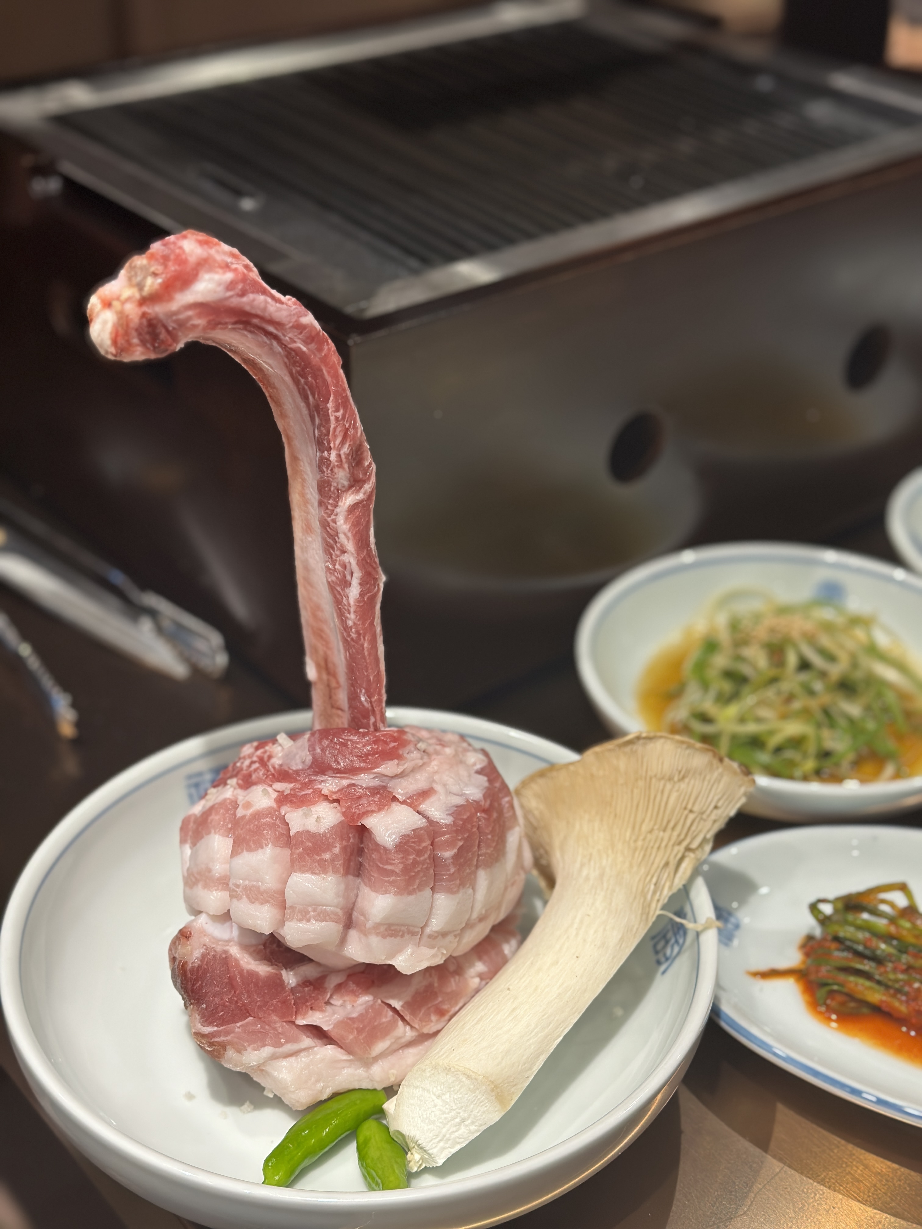 일단 통뼈 금겹살을 시켰습니다. 100g당 13,000원의 금액은, 뼈가 붙어 있는 채로 서빙되기 때문에 무게에 맞춰 가격이 매겨집니다. ^^