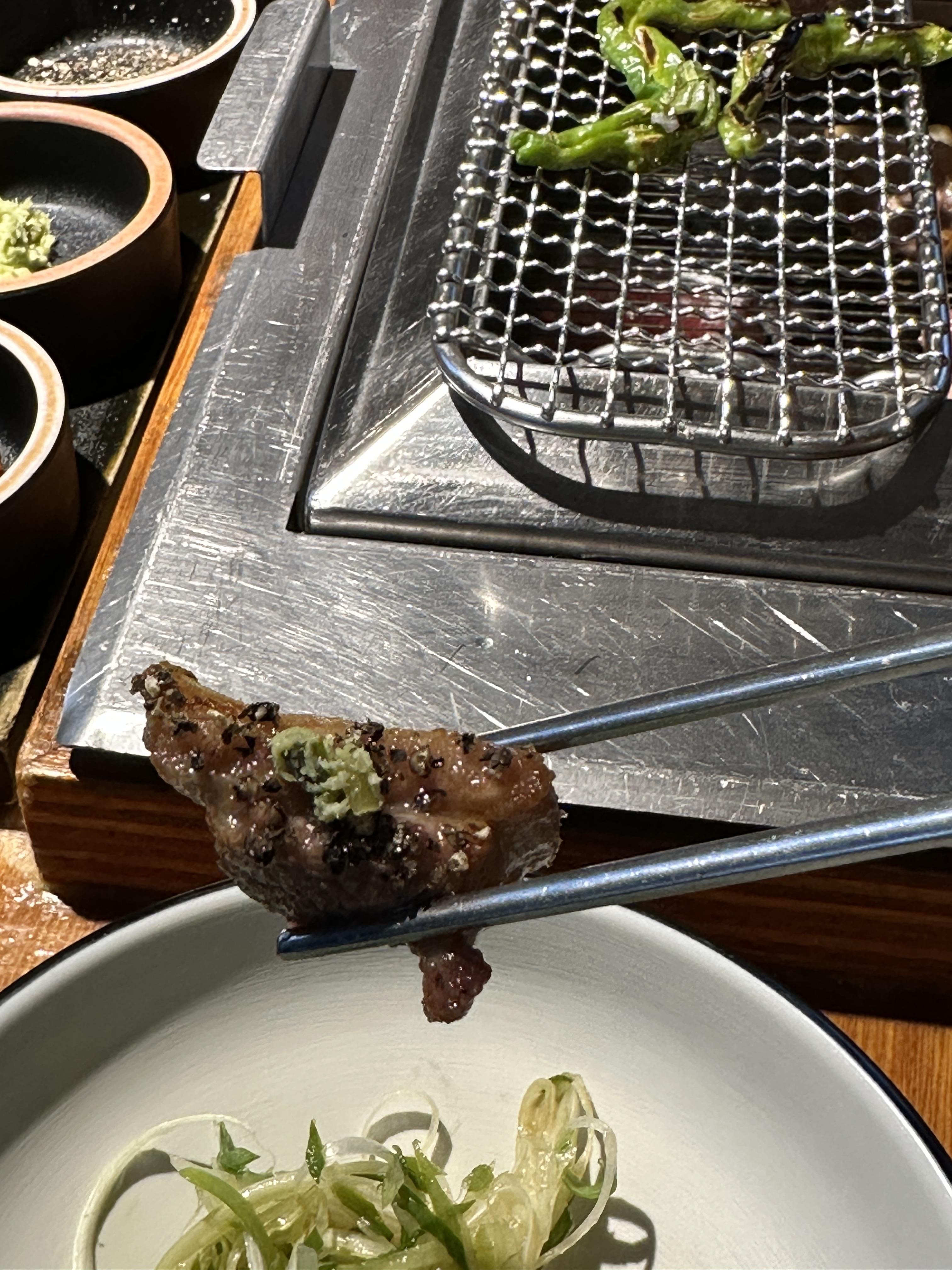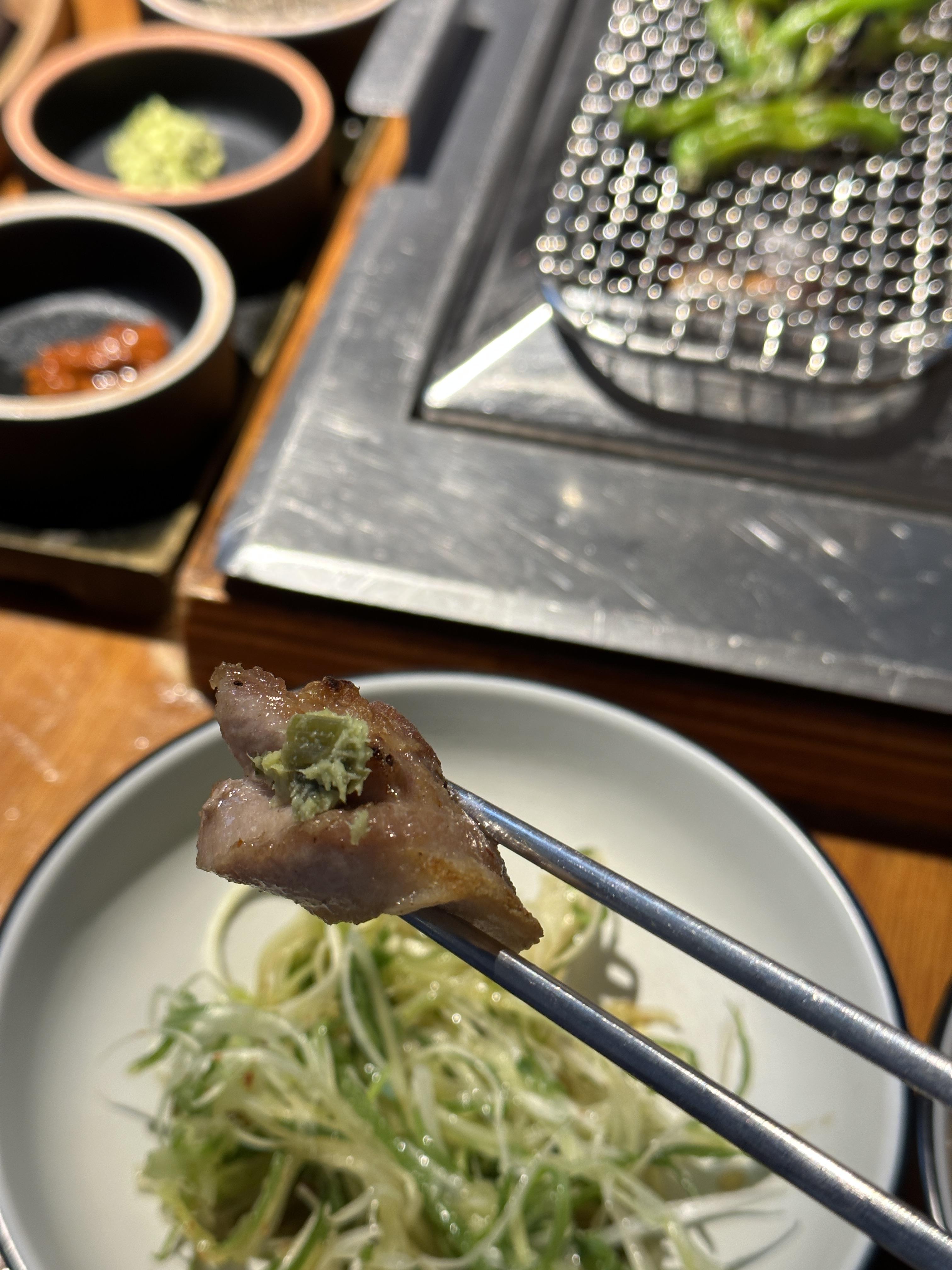 고기가 익으면 이렇게 옆으로 빼서 먹기 편하게 해 주십니다. 두근두근 ㅋㅋㅋ 와사비에도 찍어먹고, 소금도 찍어먹고, 다양한 방법으로 즐겨봅니다. 참고로 소금도 히말라야 소금이라고 갈아주시면서 엄청 강조하시더라구요 ㅋㅋㅋㅋㅋㅋㅋㅋㅋ 맛있었어요.