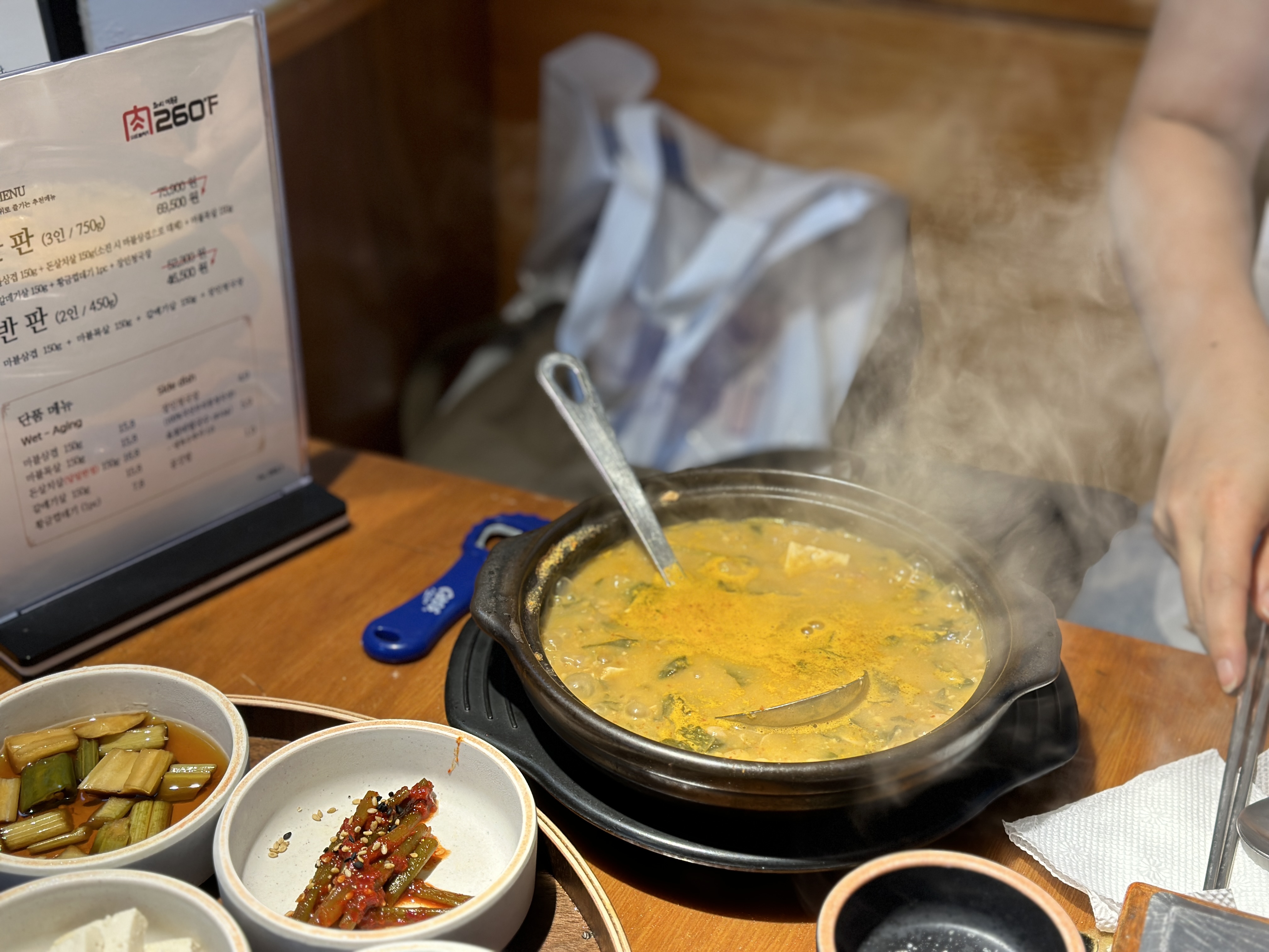 이육공만의 시그니쳐는 이렇게 청국장이 있다는 점입니다. ㅋㅋ 청국장의 냄새에 거부감이 있는 분들도 계시겠지만, 홍대입구역 경의선 숲길 옆 돼지고기 맛집 이육공 연남점의 청국장은 생각보다 더 고소하고 깊은 맛이 강했습니다. ^^ 물론 냄새가 안나는 것은 아닙니다. ㅋㅋㅋ 매장 전체에 청국장 스멜이 있습니다. ㅋㅋㅋ