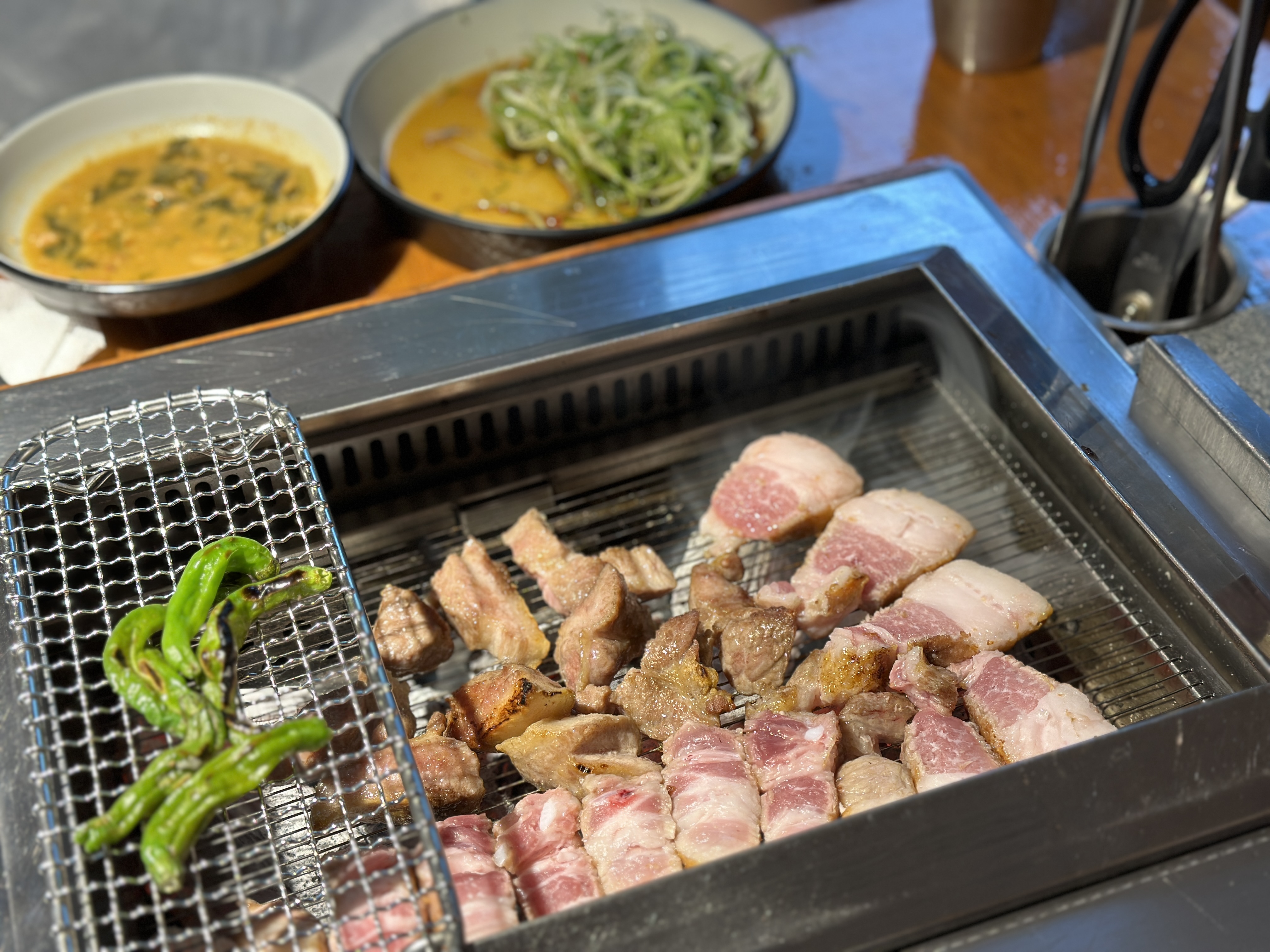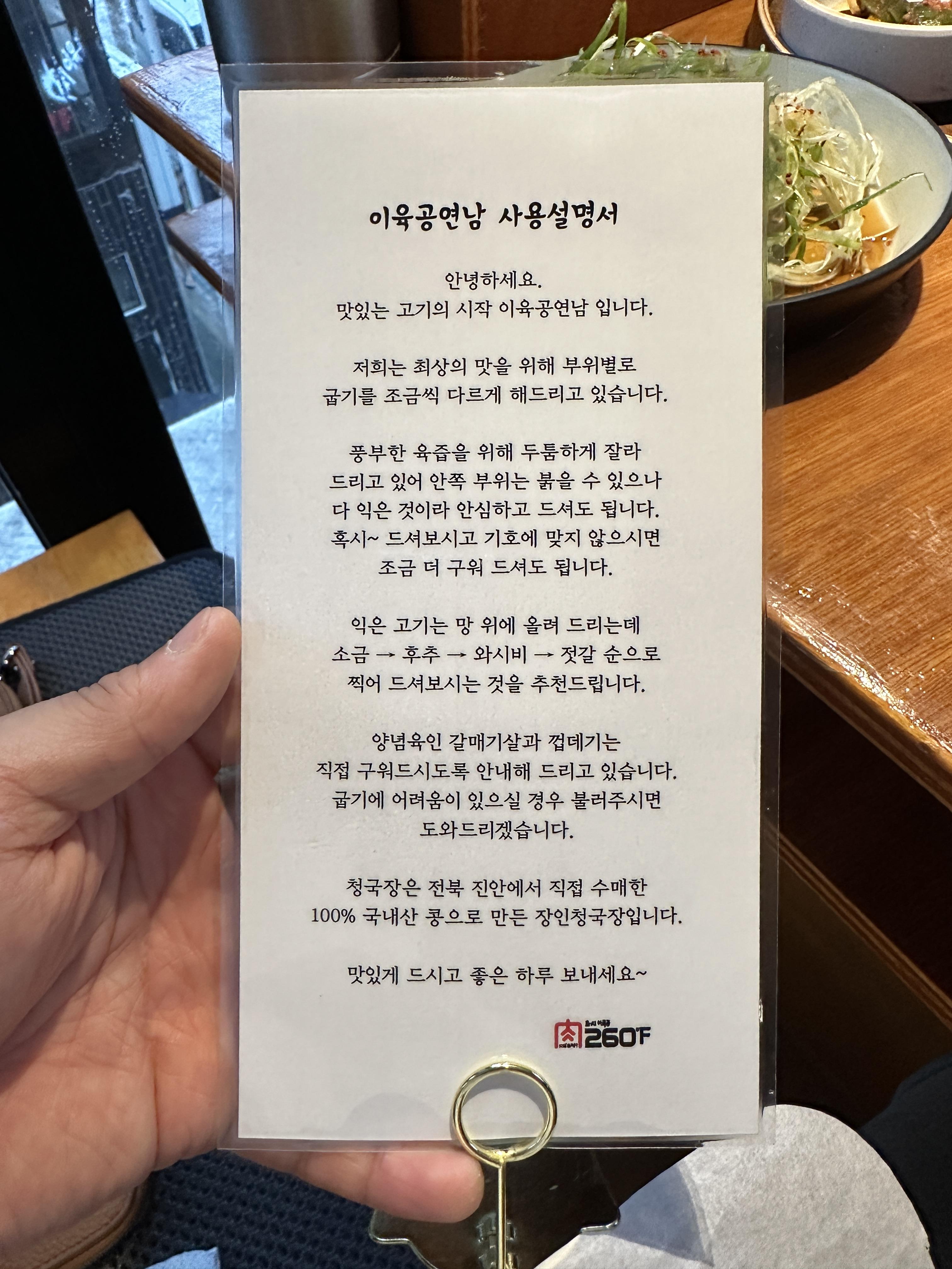 - 계획에 없던 식당을 방문했지만, 생각보다 더 맛있었어요. 고기의 질도 좋았고, 숯의 상태, 직원분이 열심히 맛있게 구워주는 것도 다 만족스러웠습니다.