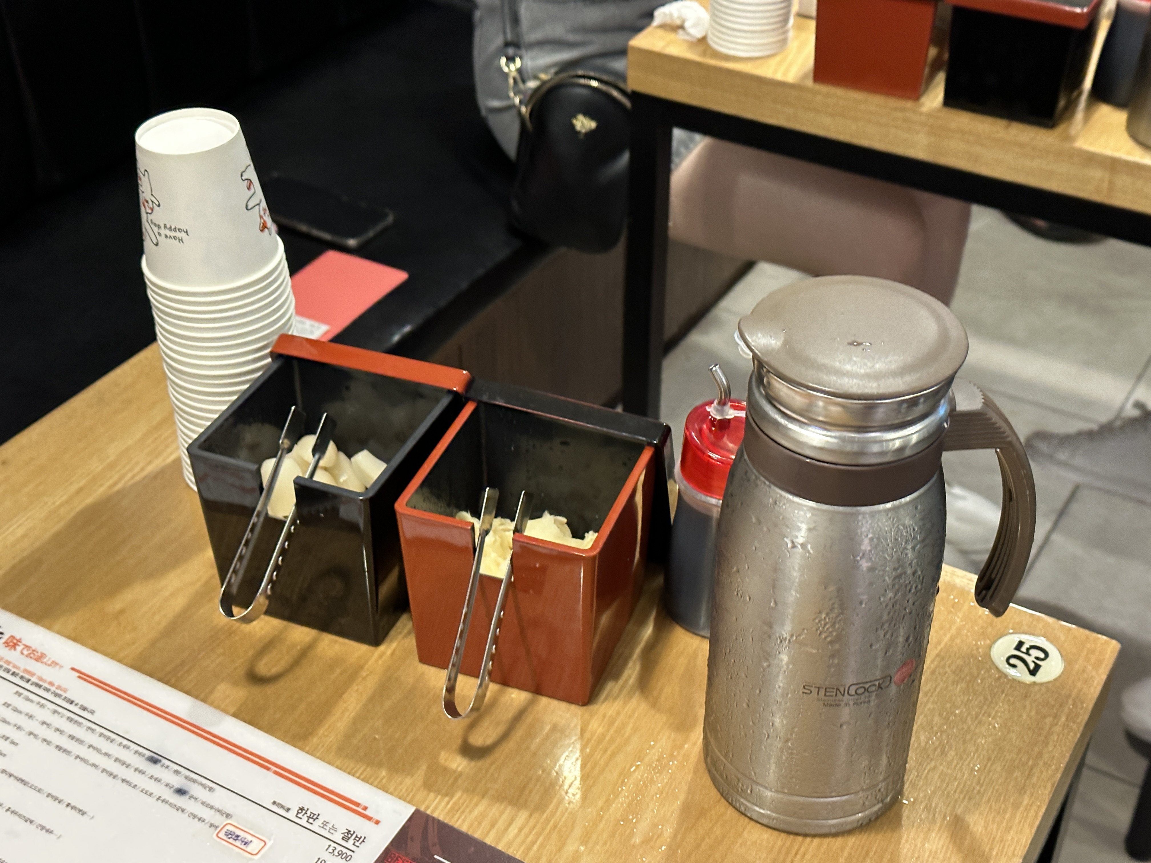 테이블에는 락교와 초생강, 간장 물컵 등이 기본적으로 준비되어 있어요.