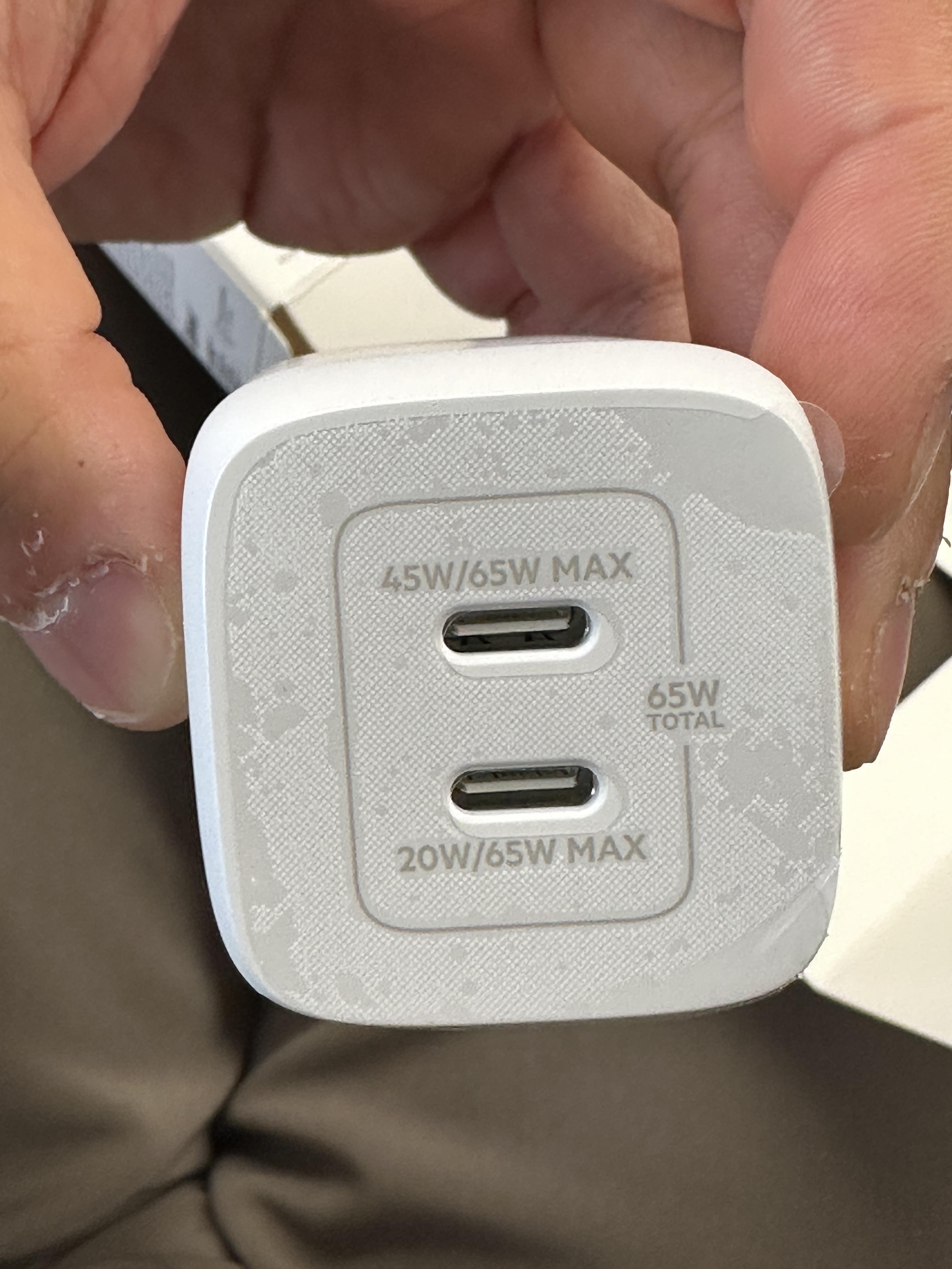 그리고 USB-C 포트가 위아래로 두개가 있는데, 위/ 아래는 단일 사용 시 65W, 함께 사용할 경우 위 45W, 아래 20W로 충전되어 총 65W라는 의미입니다.