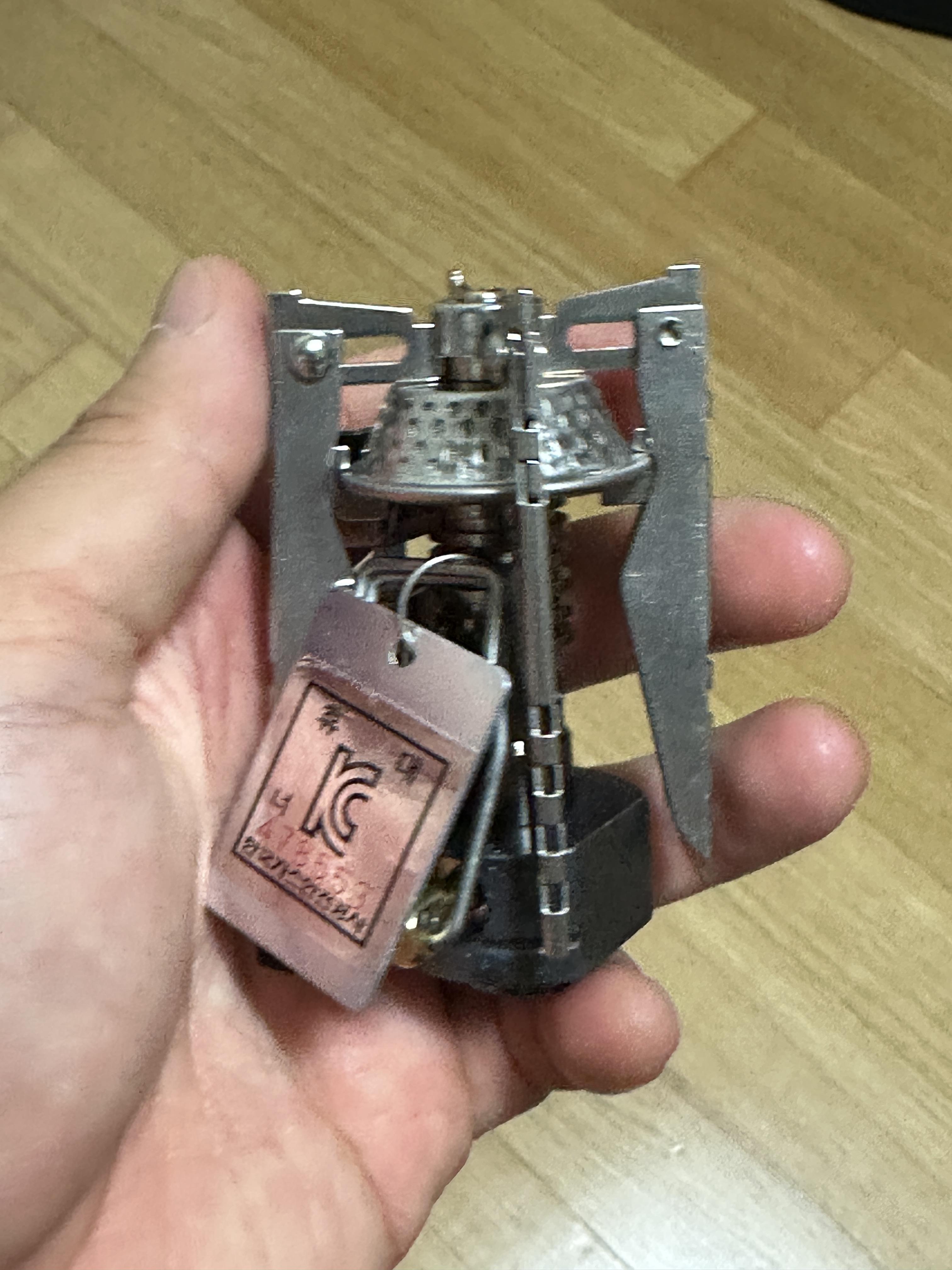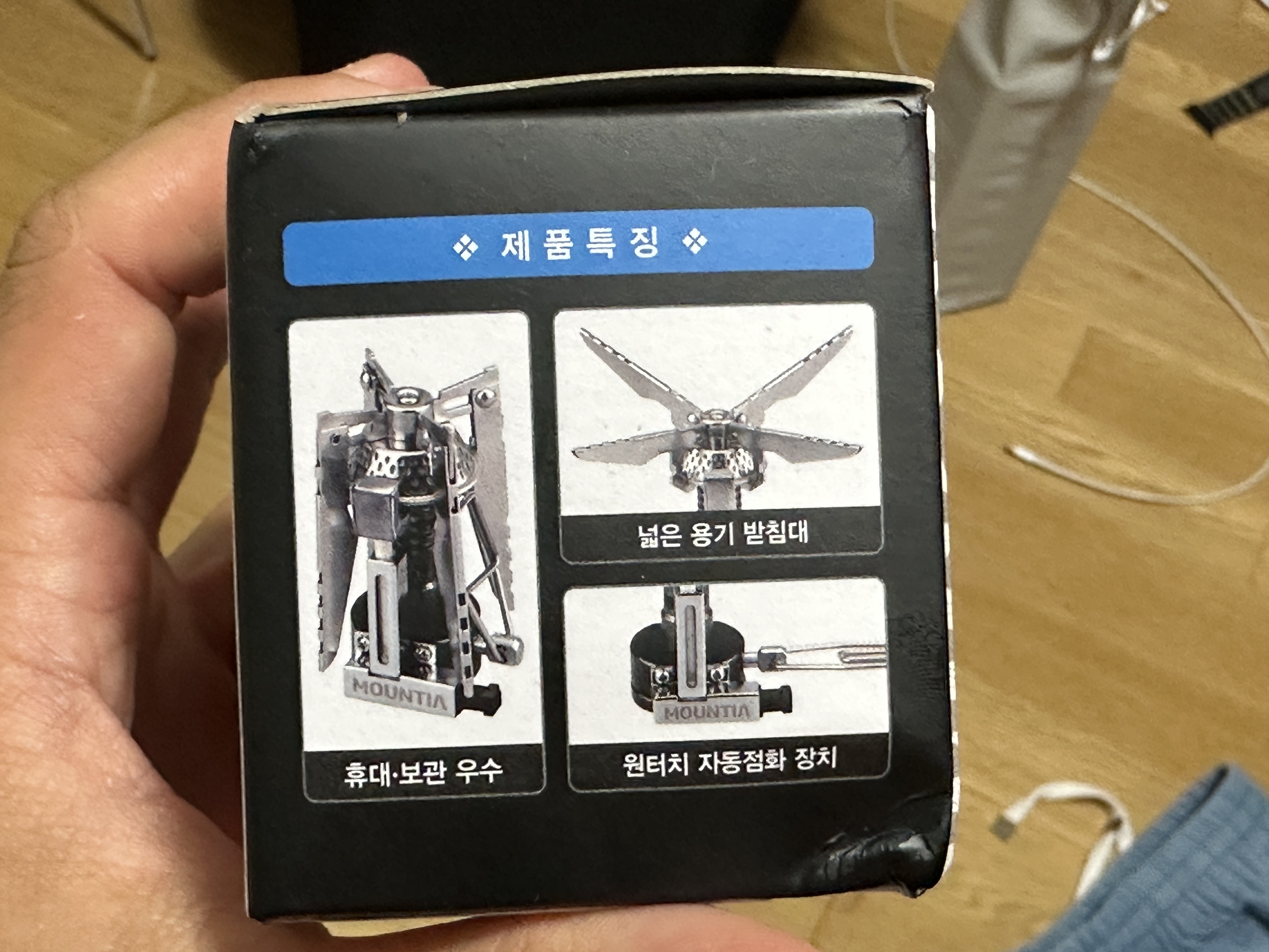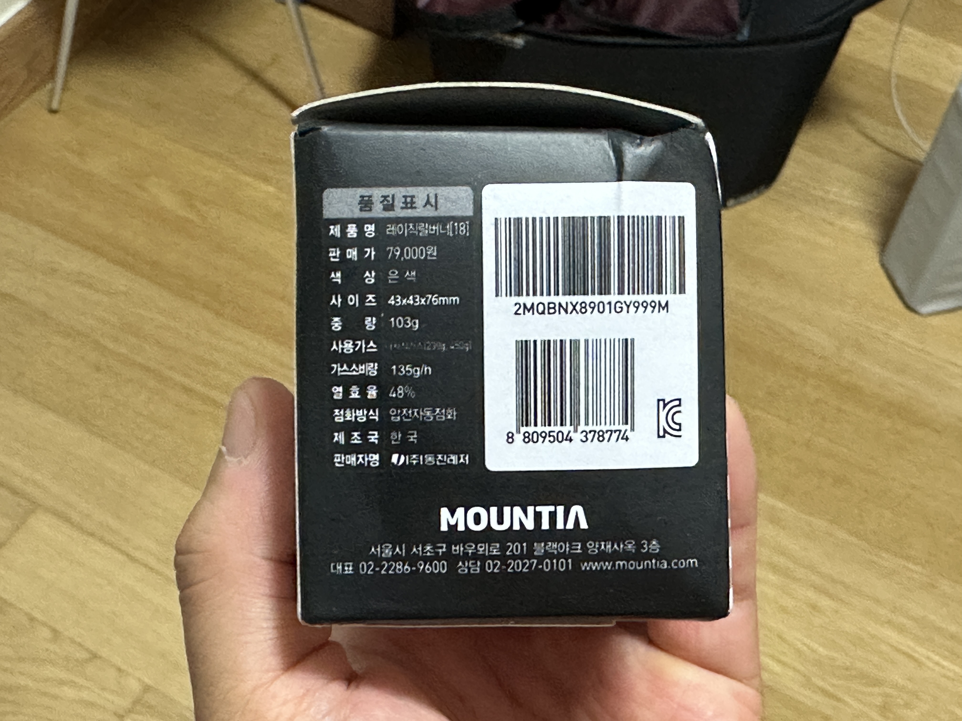 마운티아 레이 직렬버너는 실제 사진에서 보듯이 한 손에 쏙 들어오는 수준의 작은 사이즈를 자랑합니다. 용기 받침대를 접으면 정말 콤팩트한 사이즈였어요. KC마크 역시 믿음이 갑니다.