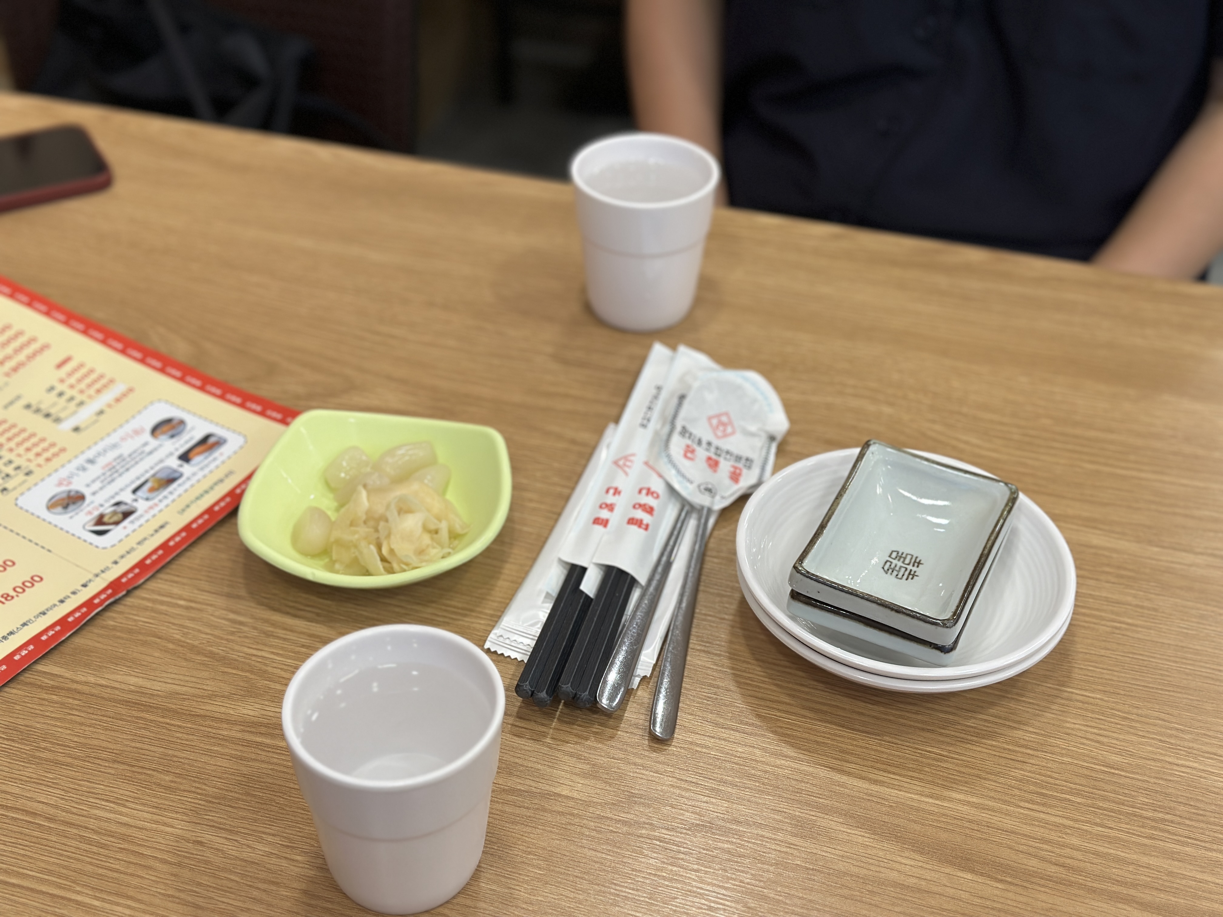 기본세팅은 보잘것 없습니다. ㅋㅋ 대단한 게 나오면 이상하죠 ㅋㅋ 수저세트, 간장종지, 앞접시, 락교, 초생각이 나옵니다.