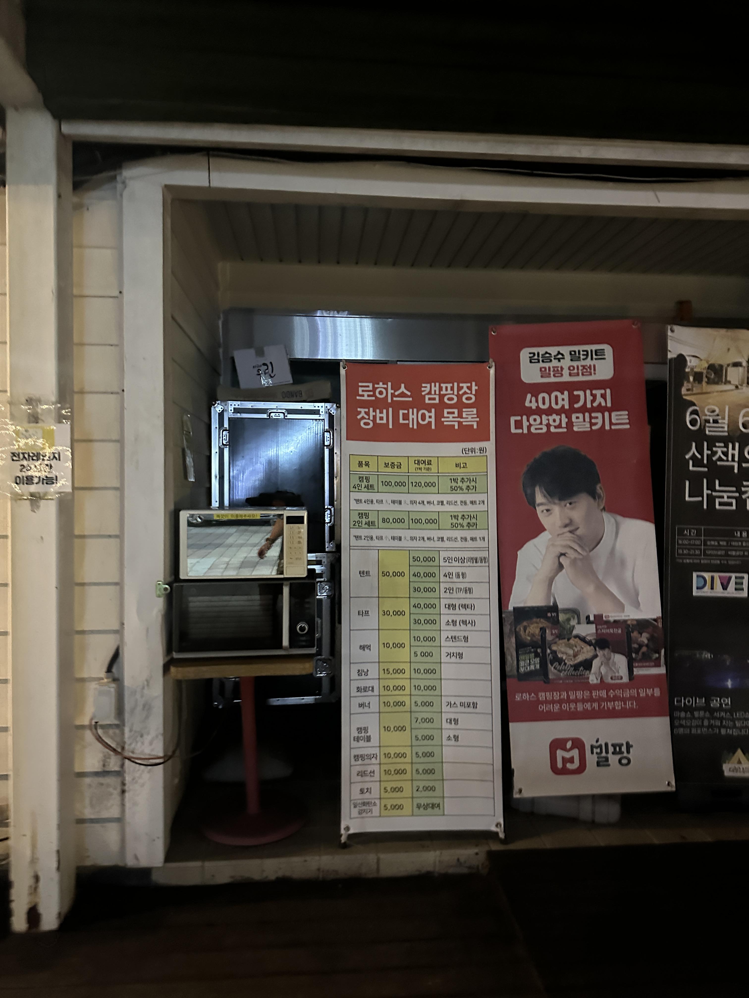 대전 대청호 로하스 캠핑장은 물품대여도 진행하는 듯 했습니다. 장비대여목록표에 보면, 대부분의 장비를 빌려줍니다. 초보자 분들에게는 더할나위 없는 선택지가 되겠네요. 체험모드.