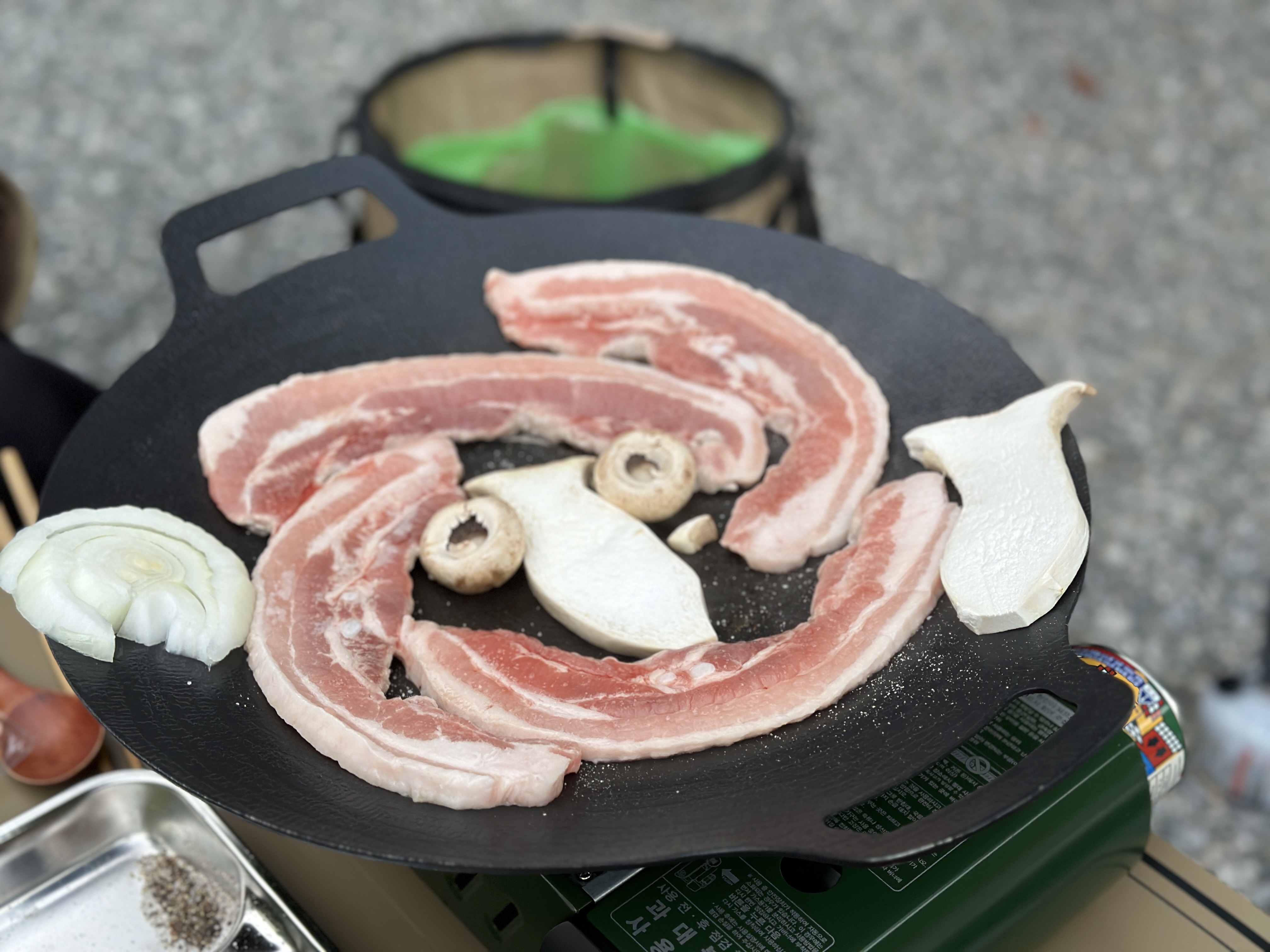 후딱 텐트를 치고 (다음 포스팅에서 텐트 후기 남길게요~ 헬리녹스 택티컬어택 4.0입니다.), 빠르게 고기를 뎁힙니다. ㅋㅋㅋ 배는 안고팠지만, 그래도 먹어야 캠핑이죠.
