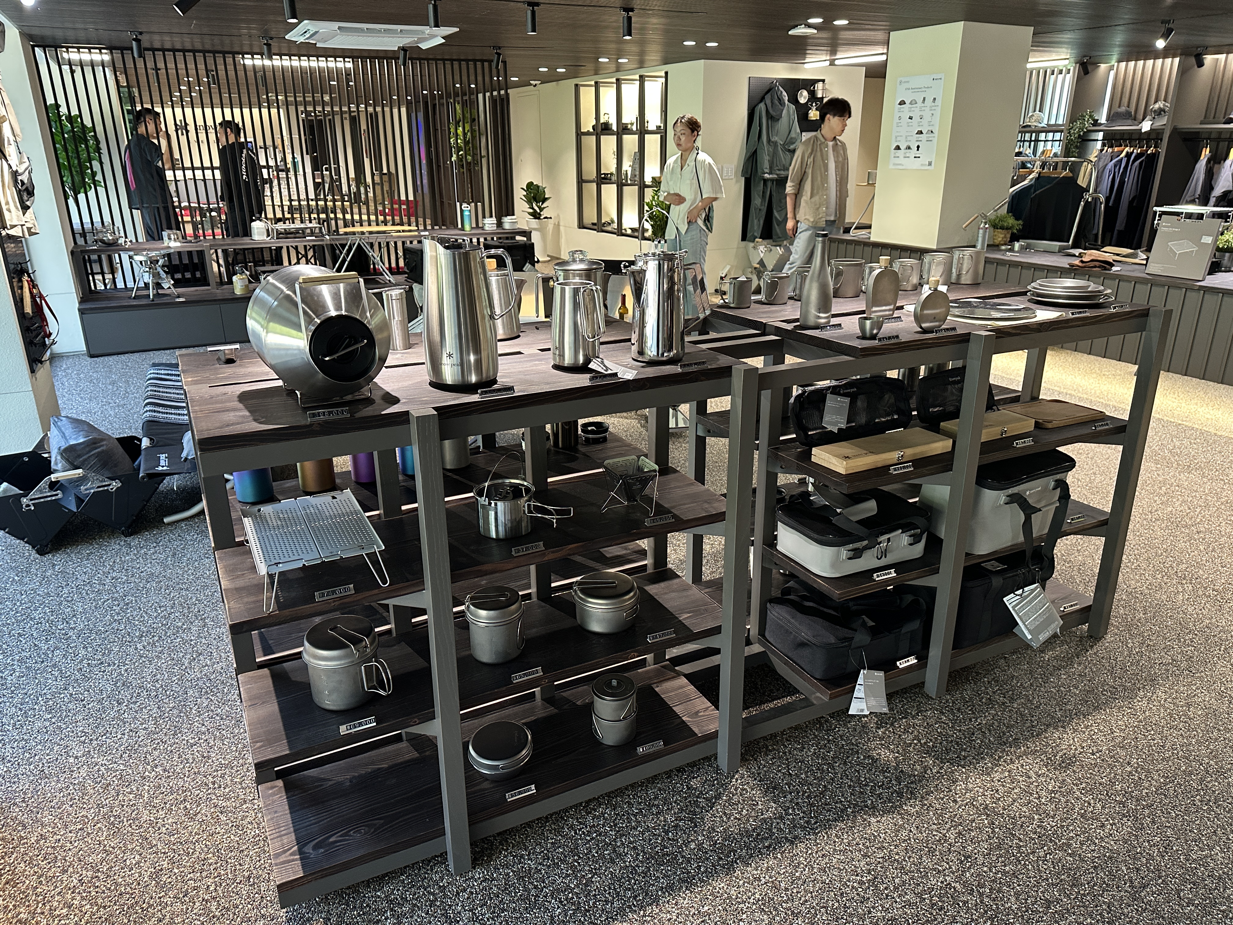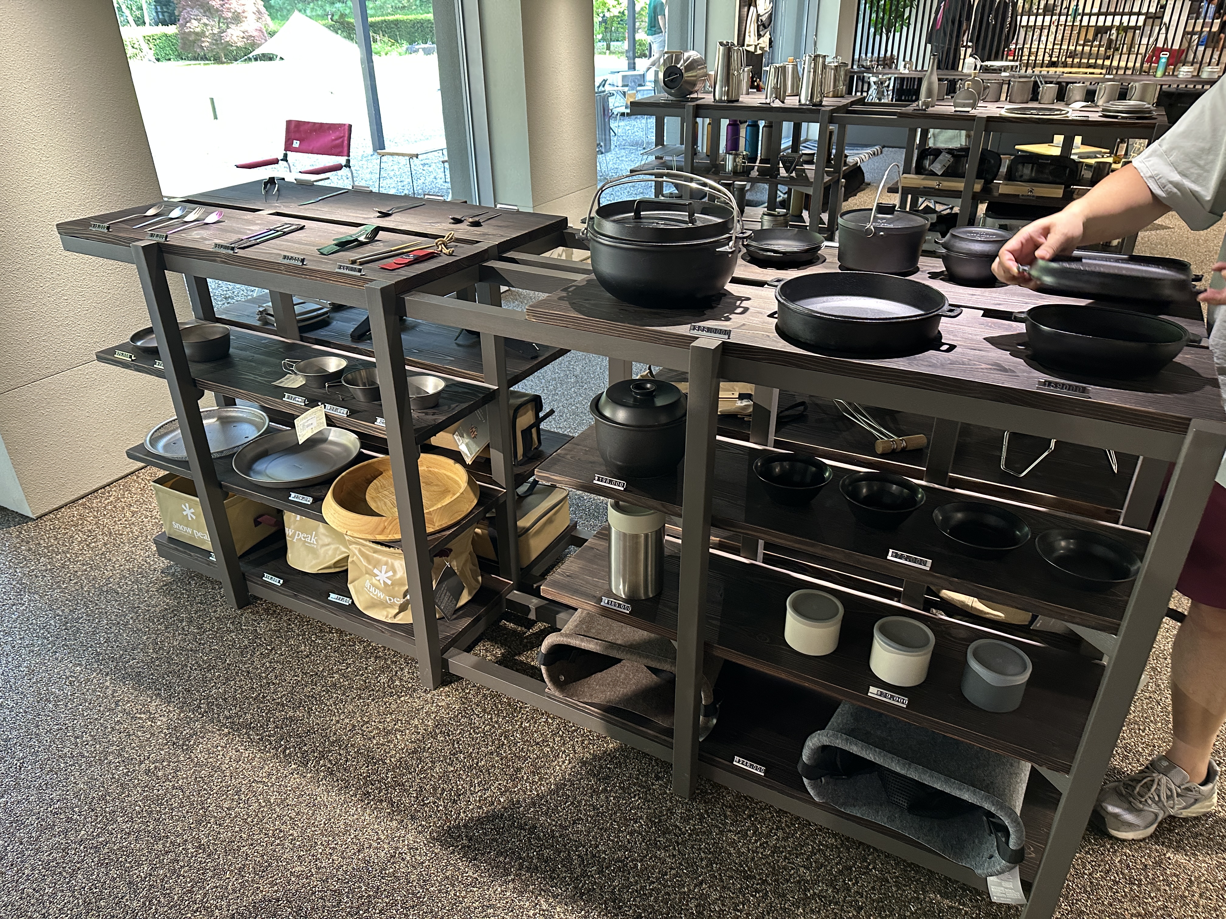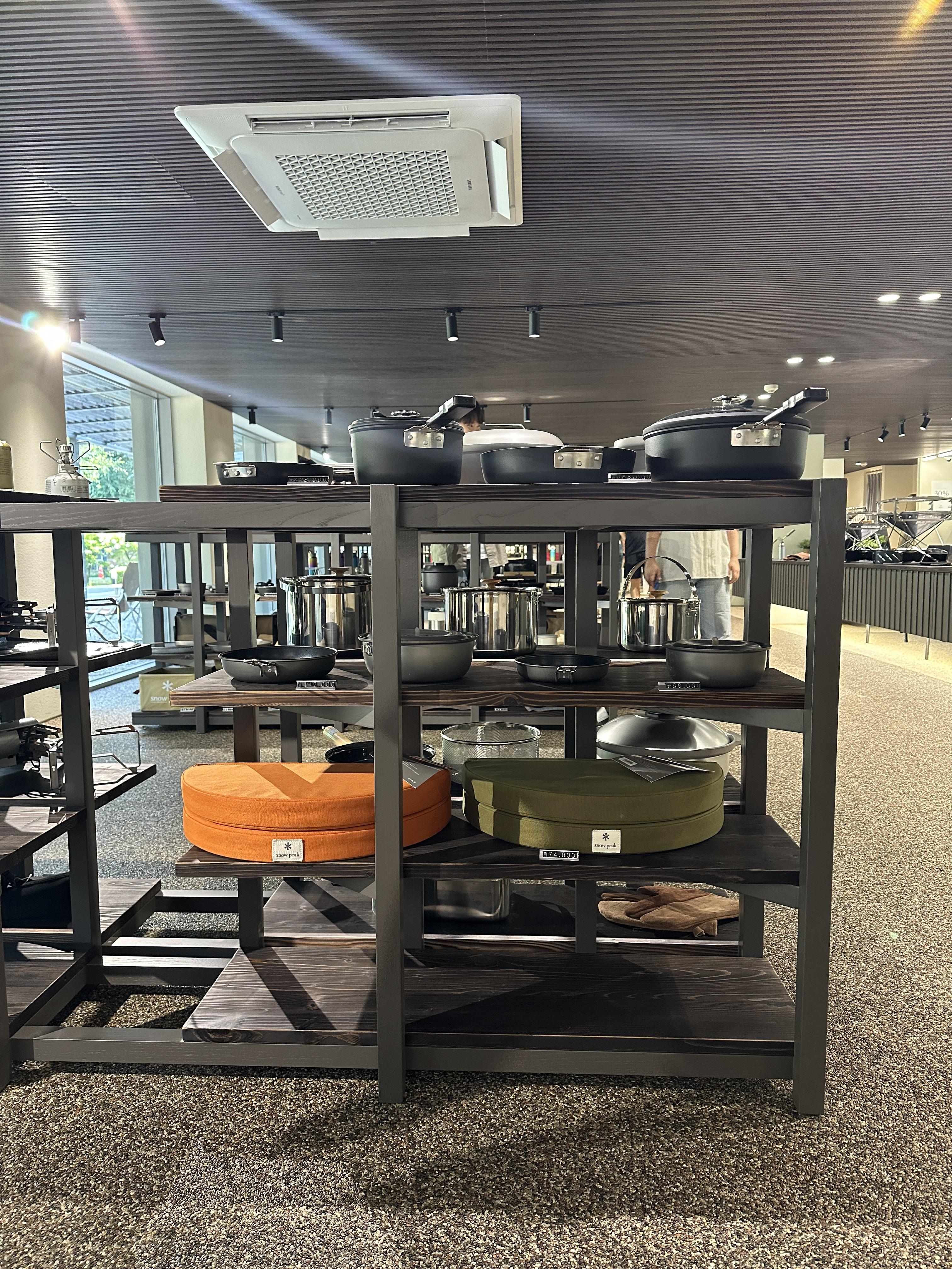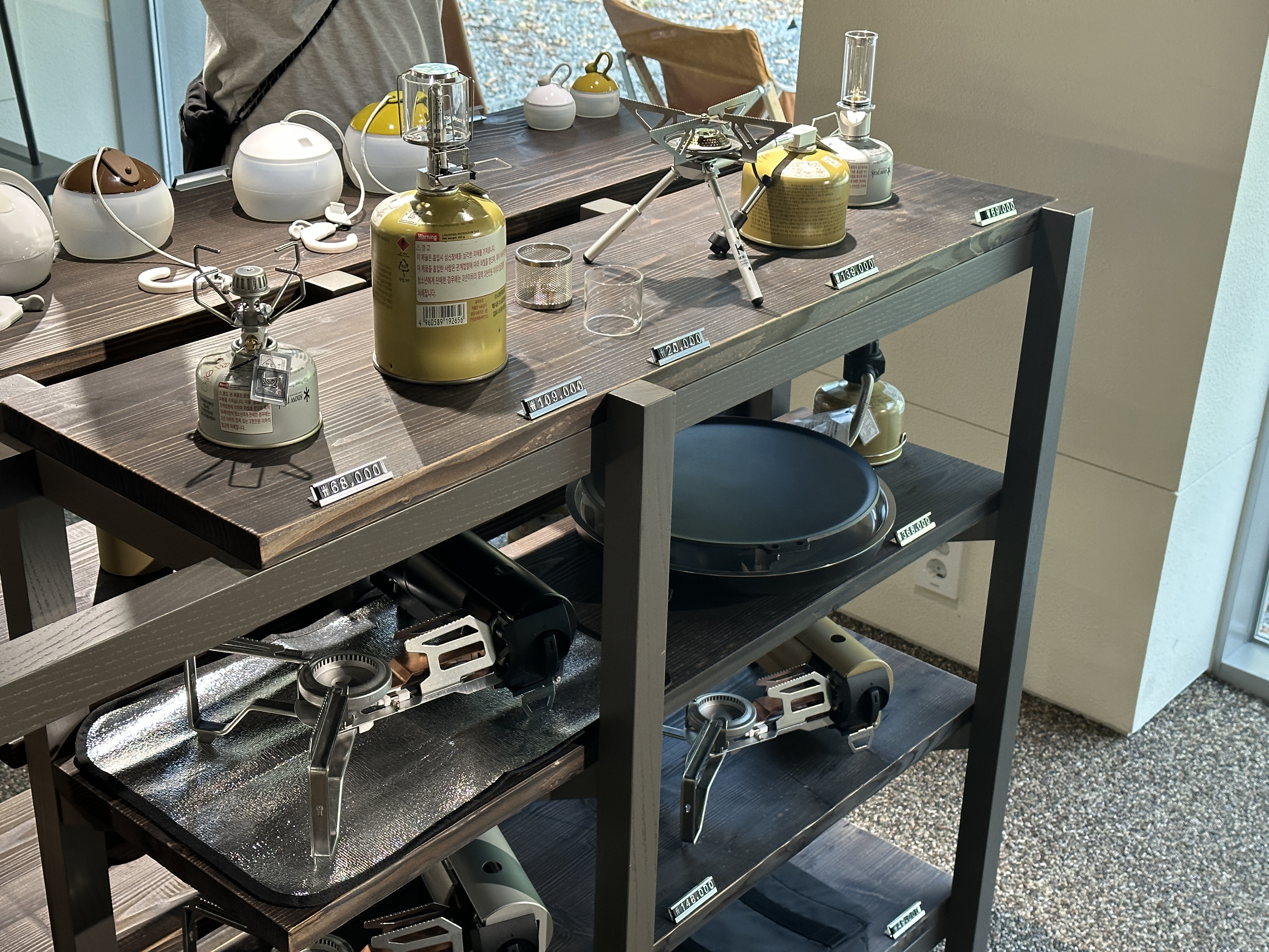 용인 스노우피크 에버랜드 캠프필드 기어&어패럴 건물 외부 텐트 설치된 장소의 반대편은 이렇게 다양한 아웃도어 용품들이 전시되어 있습니다. 화로대 테이블부터 체어, 그리고 실제로 본 적은 없는 체어 테이블 등 ㅋㅋ 별천지가 따로없었습니다.