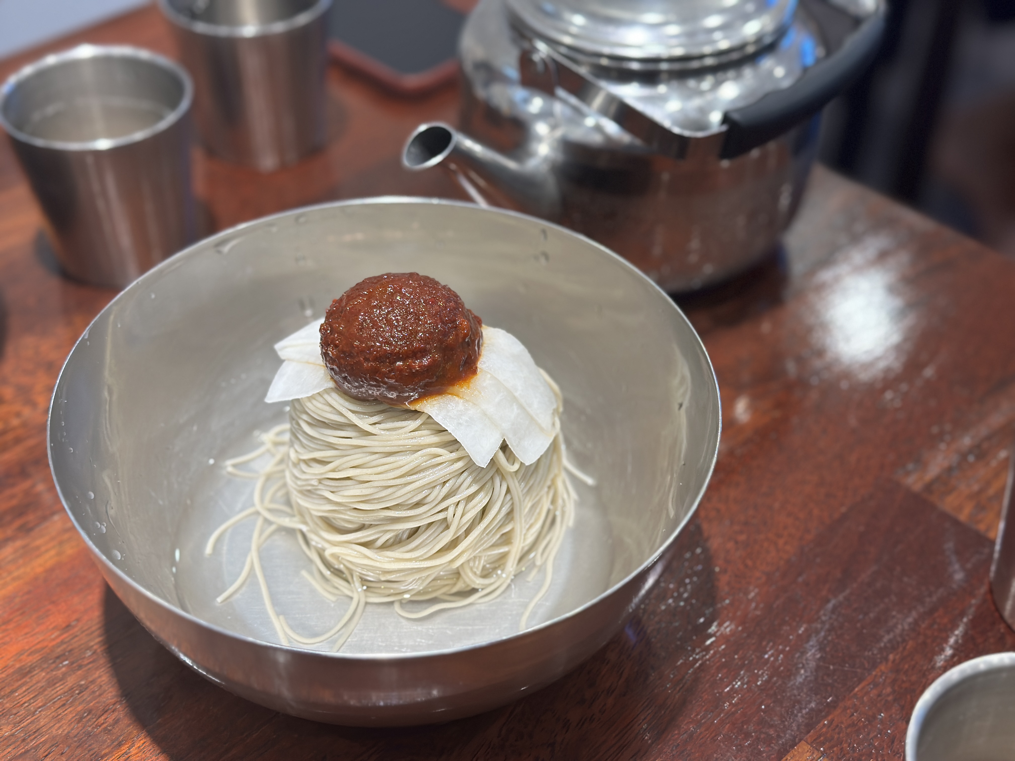 비빔막국수는 추가 막국수로 시켰을 때 이렇게 나옵니다. 일반 비빔막국수로 주문하면, 삶은계란 반쪽 및 추가 고명 몇 가지가 들어가긴 하니 참고하세요.