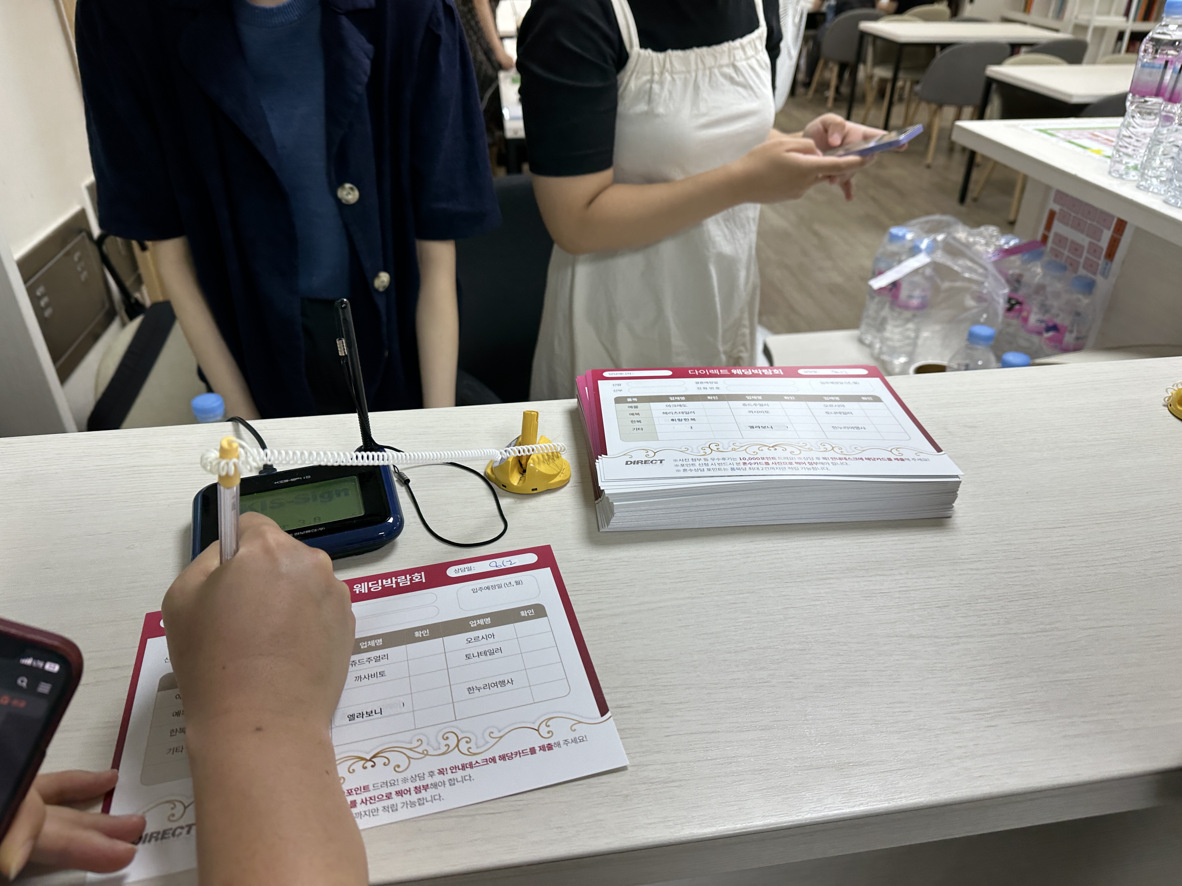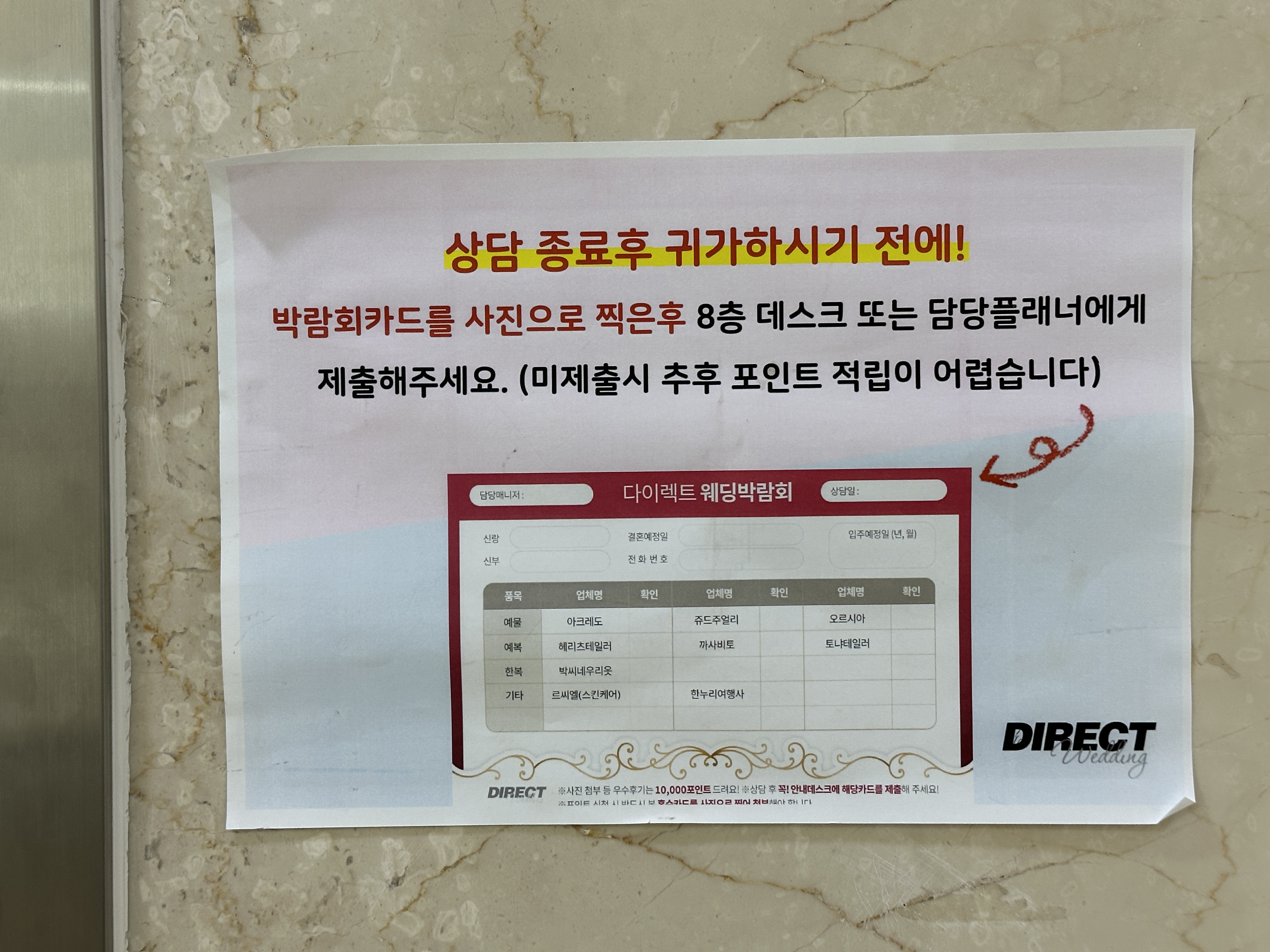 다이렉트 결혼준비 박람회를 입장하게 되면, 이렇게 카드를 하나 작성하게 되고, 상담예약한 플래너님이 9층에서 내려올 때까지 테이블에서 대기합니다. ㅋㅋㅋ 물론 플래너분을 만나고 안오셔도 매칭해 주실꺼에요 (예상)