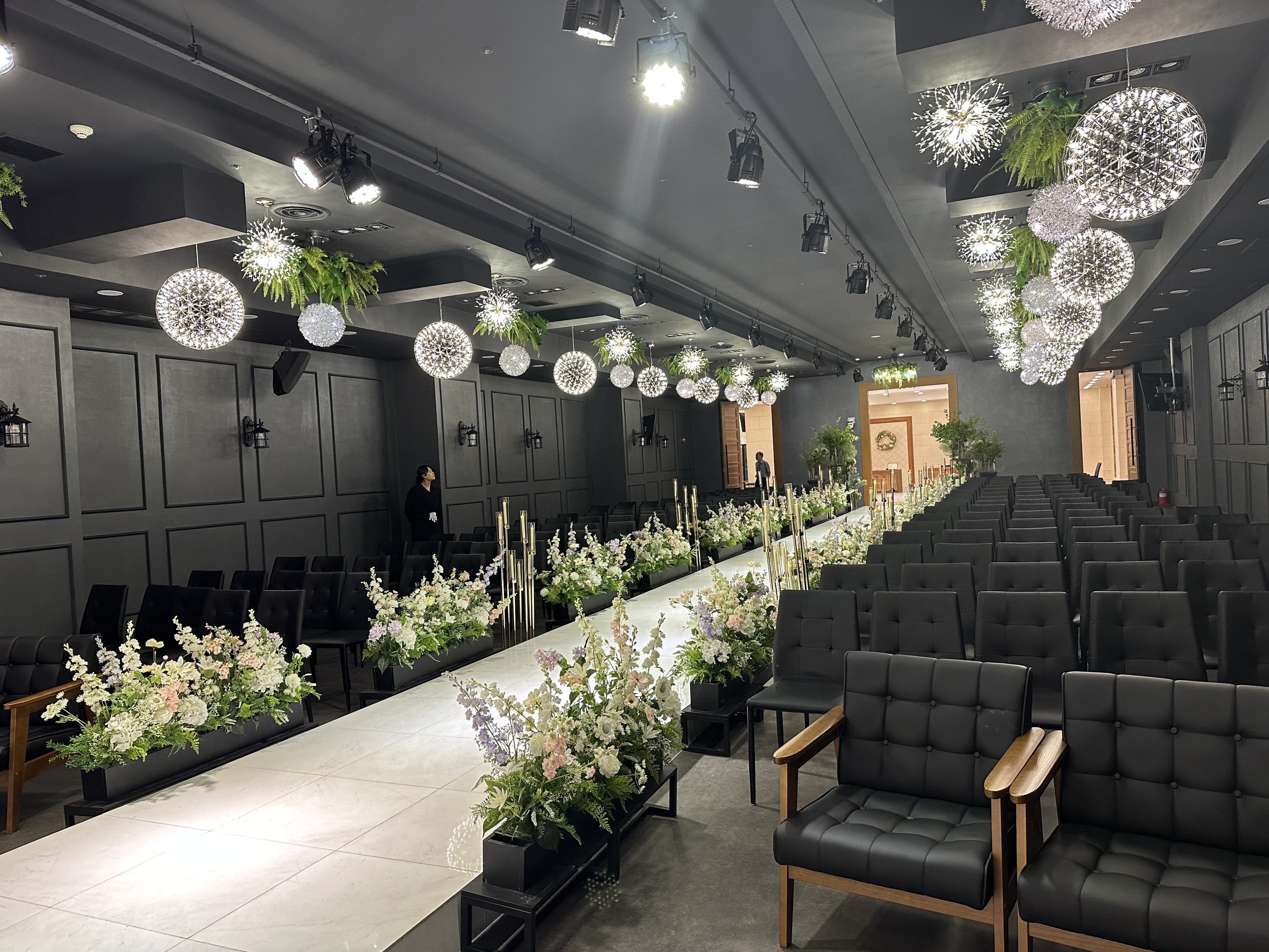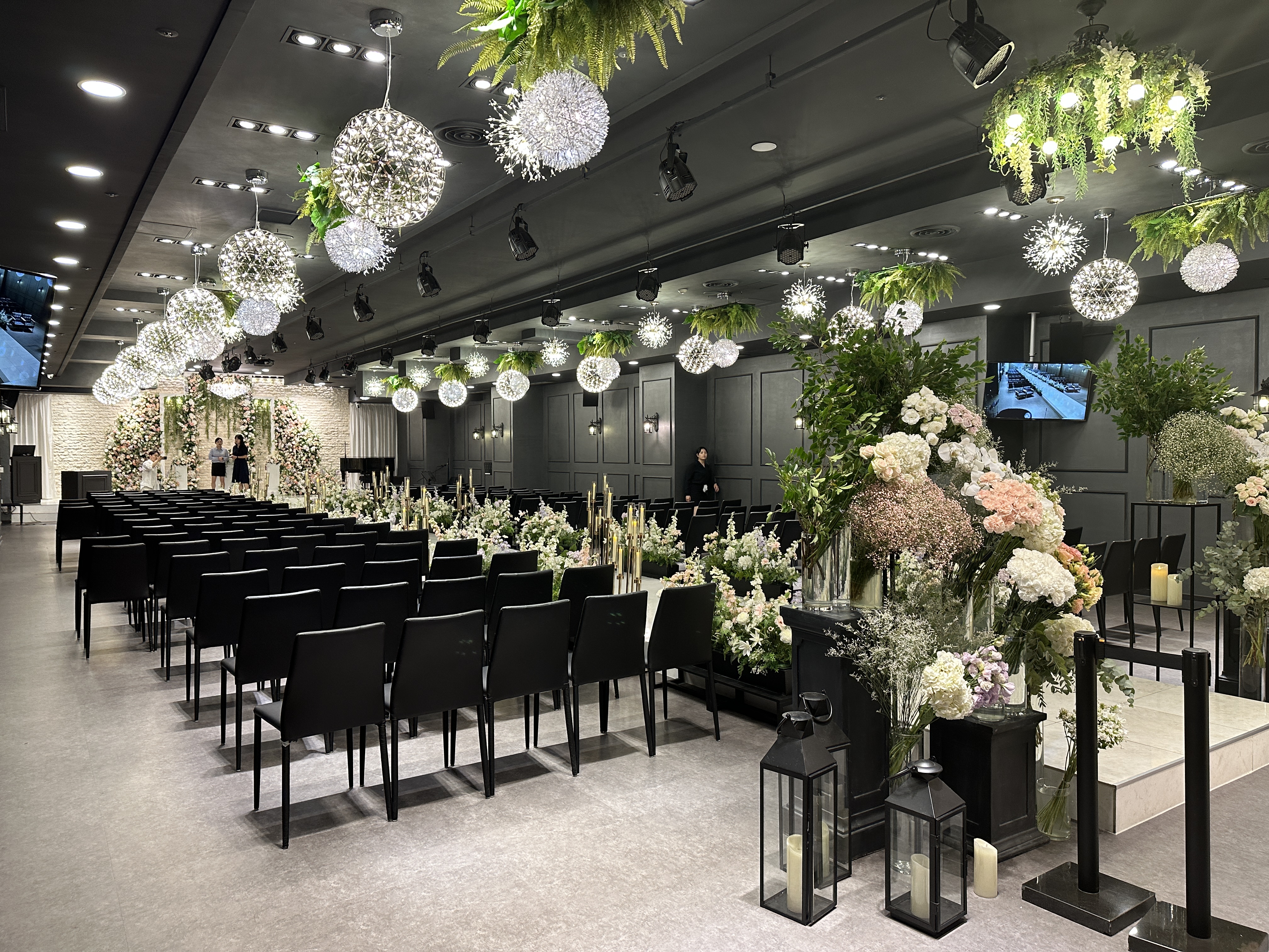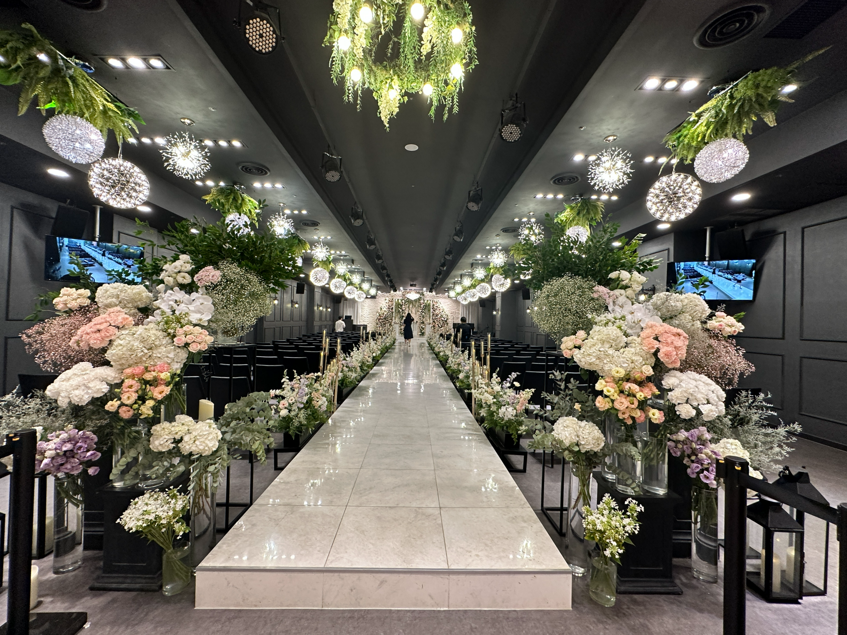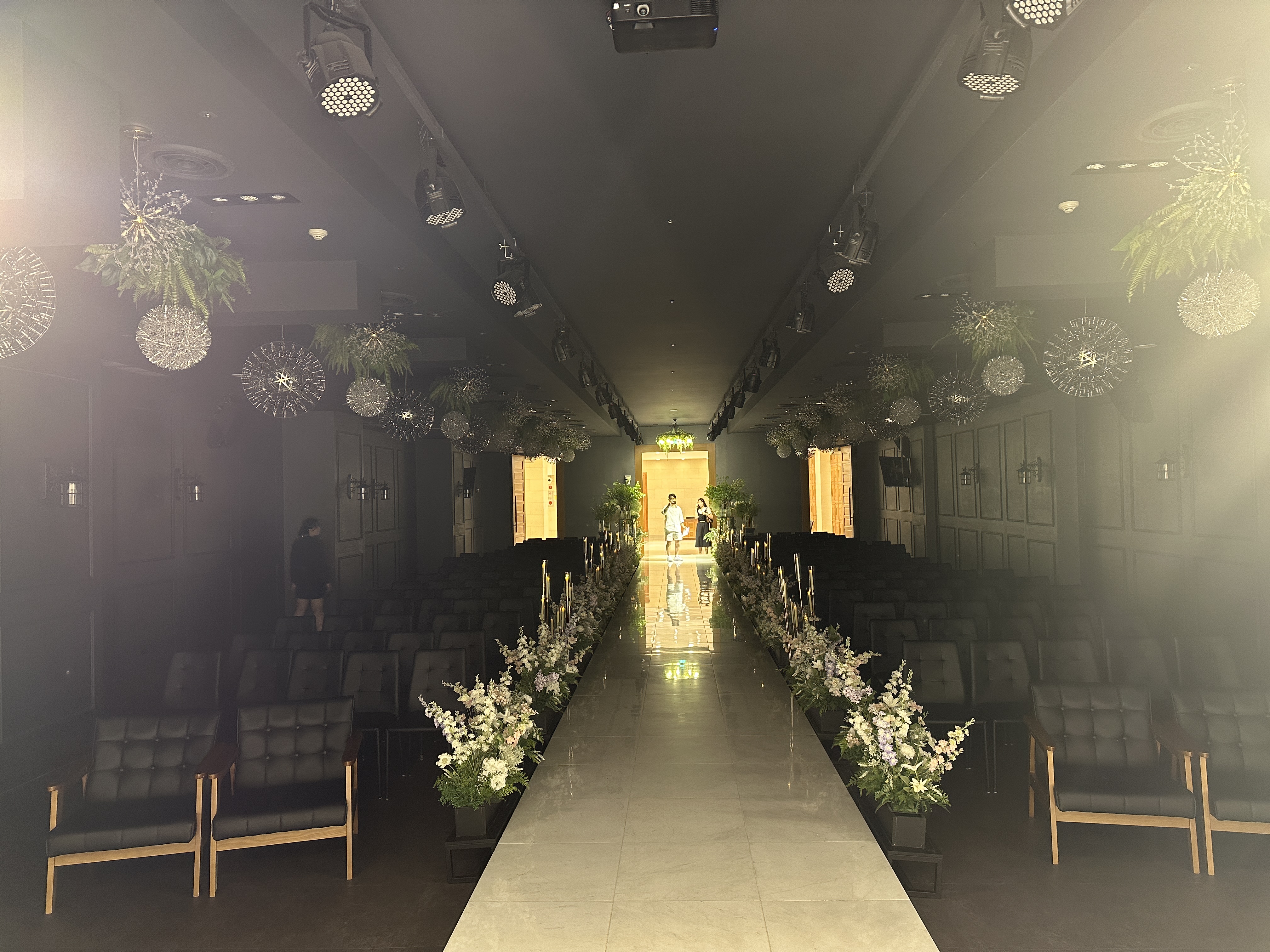 브라이드 벨리(Bride Valley) 웨딩홀 앞에 섰을 때 하객석을 바라본 사진입니다. 조명도 그렇게까지 강하지 않고, 나쁘지 않았습니다.