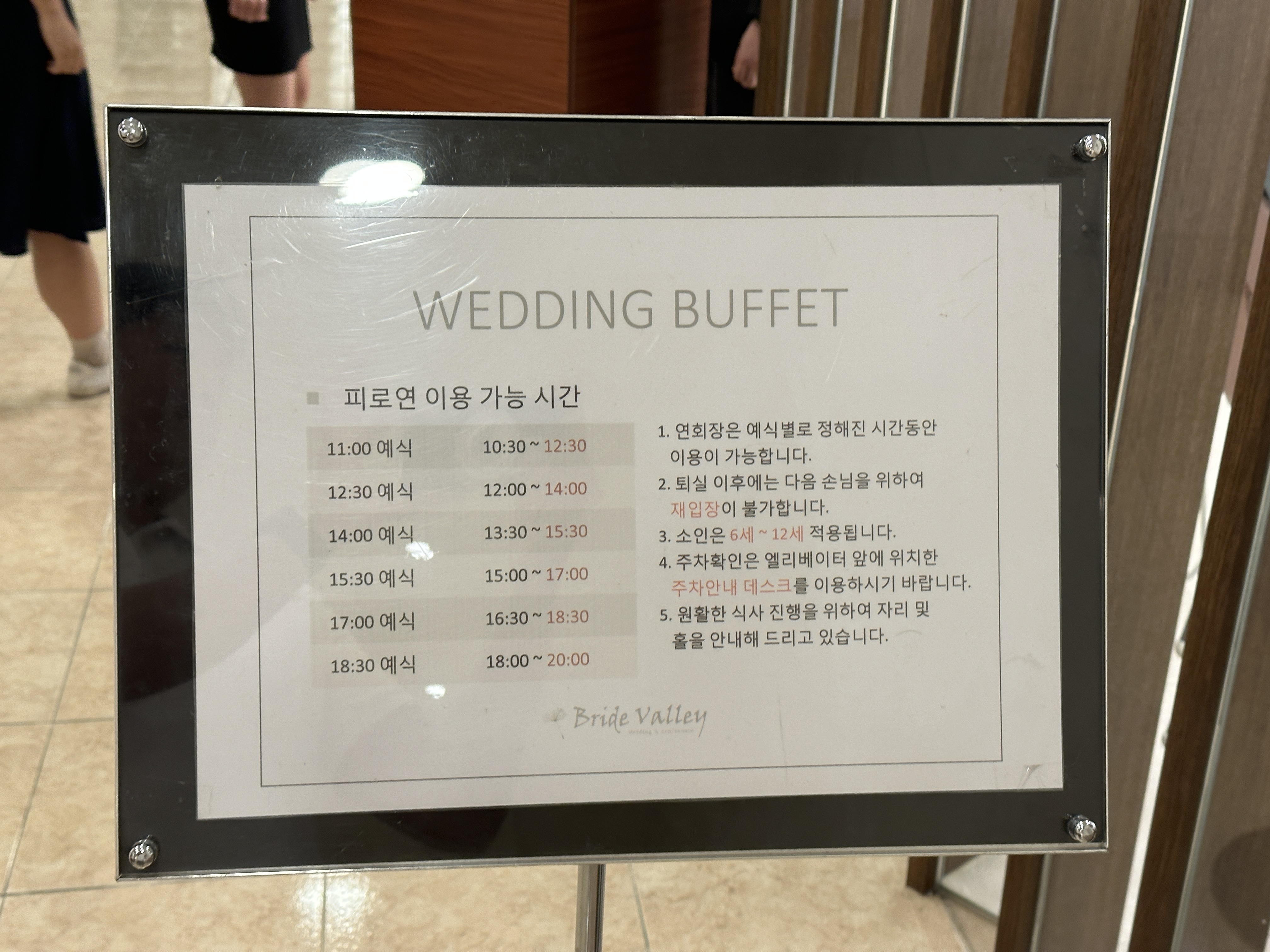 브라이드 벨리(Bride Valley) 웨딩홀 상담해주시는 분이 강조하신 것, 식당 메뉴와 퀄리티입니다. ㅋㅋㅋ 사실 이제는 식장 식당 수준들이 다 높아서 차별화라는게 가능할까 싶은 수준입니다. ㅋㅋ 하지만 리모델링을 통해 시설 등은 너무 깔끔했습니다. 조명의 밝기 등 쾌적하게 이용할 수 있겠다 싶었습니다.