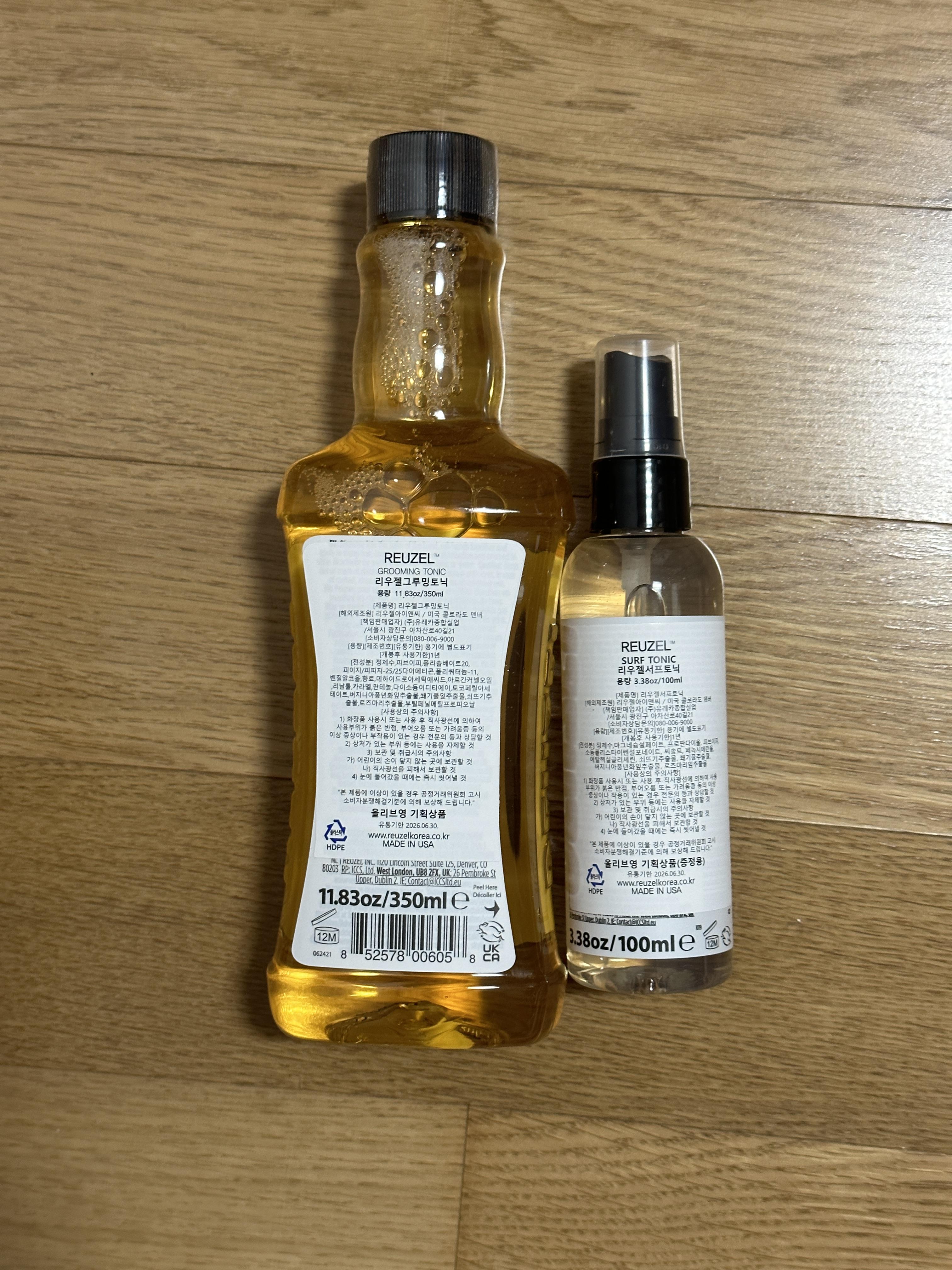 간단히 비교하면, 헤어토닉엔 식물성 알코올이 있는 파워에이드 색깔이고, 그루밍토닉은 아르간 오일을 함유한 참기름색(?) 입니다. ㅋㅋㅋ 헤어토닉은 정말 모발 관리 등에 특화되어 있고, 그루밍토닉은 헤어 세팅까지 도움을 준다고 합니다.