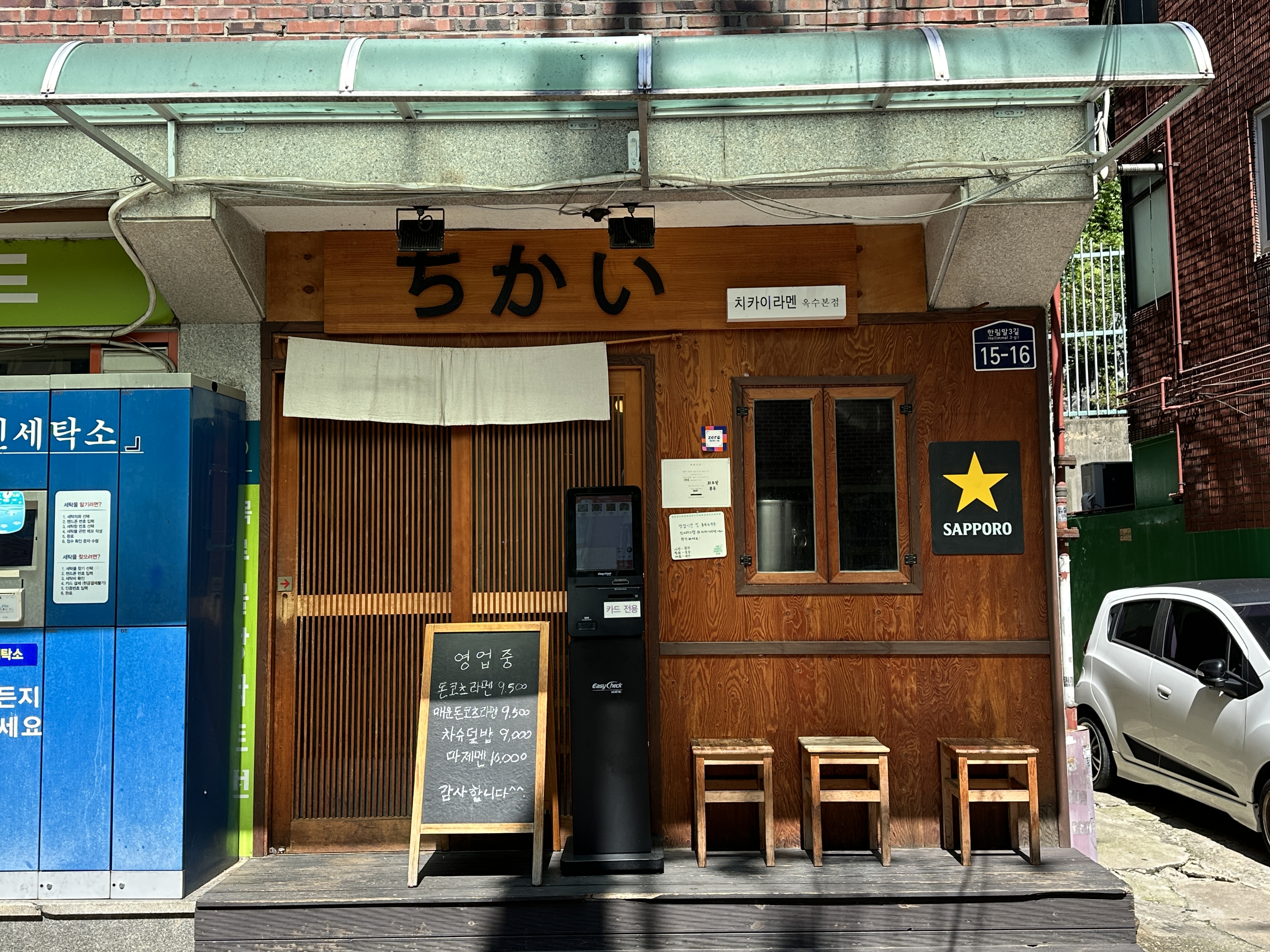 옥수역 일본식 라멘 맛집 치카이라멘의 외관은 특이합니다. 몇 년 전 여행갔던 일본 식당을 보는 느낌이랄까요?ㅋㅋㅋ 밖에서 주문과 대기를 하는 시스템. 뭔가 익숙합니다.