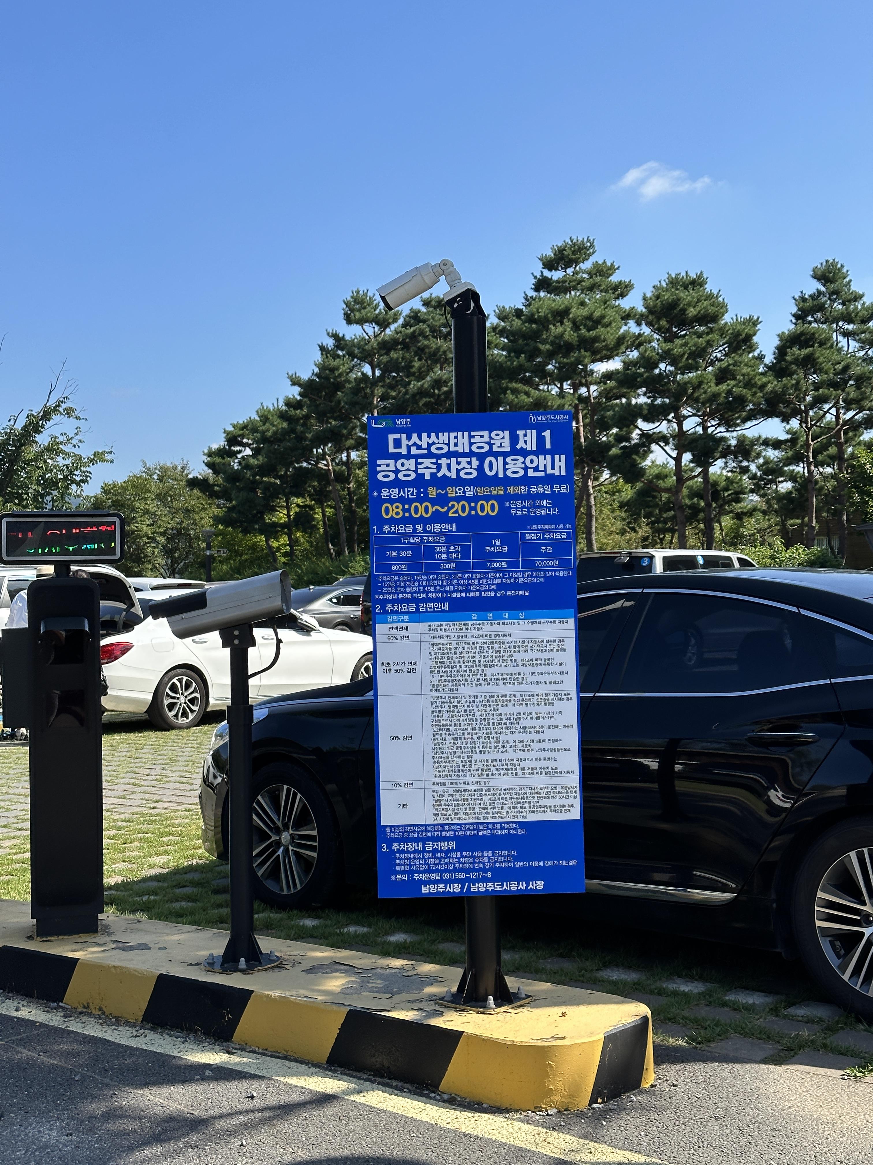 남양주 다산 생태공원에 오신다면, 아마 제 1공영주차장을 이용하실 텐데요, 30분 기본 6백원, 30분초과 시 10분당 300원을 냅니다. 일 최대 7천원의 주차료를 징수하도록 되어있습니다. 저렴한 편이네요 ^^