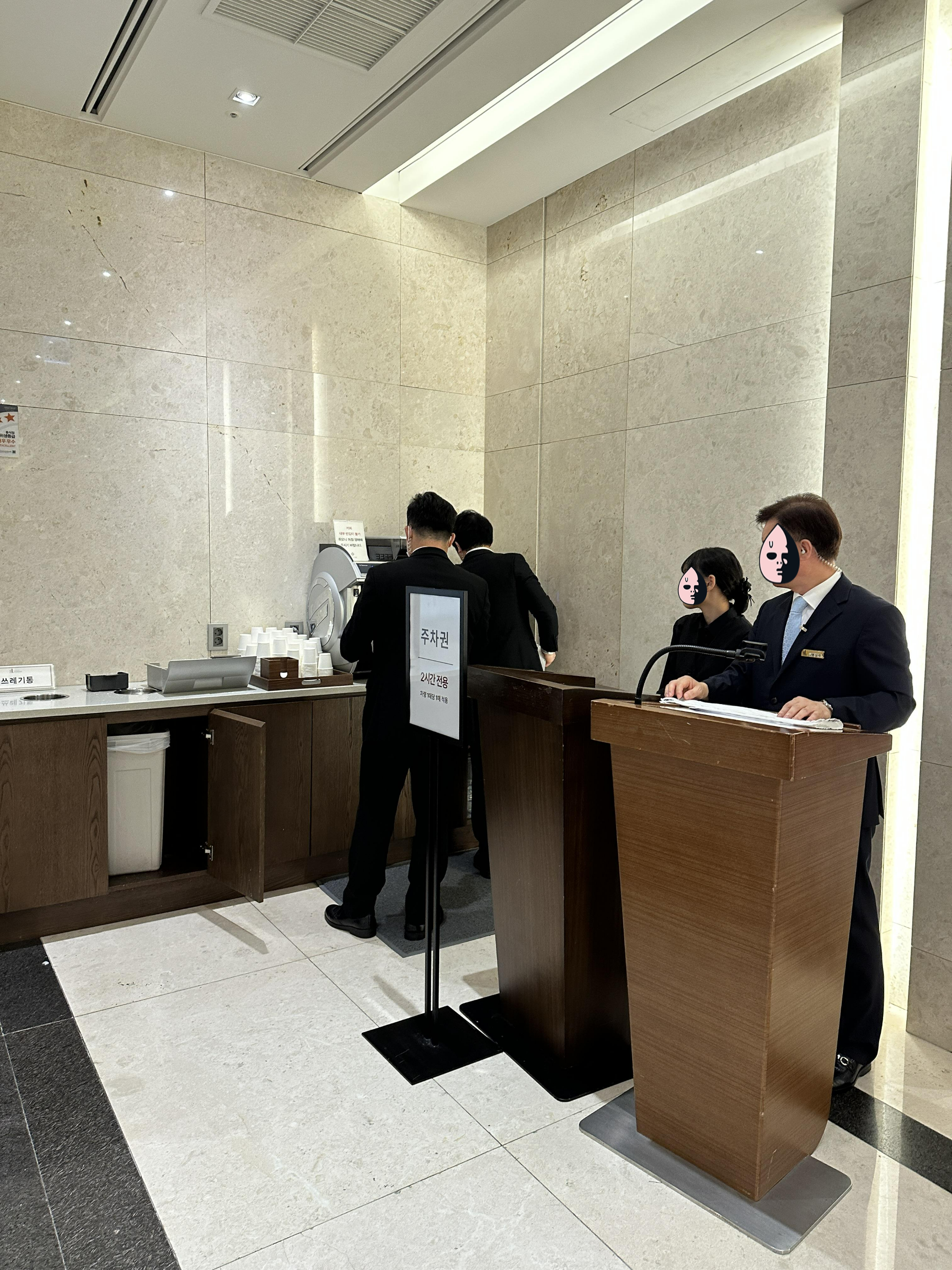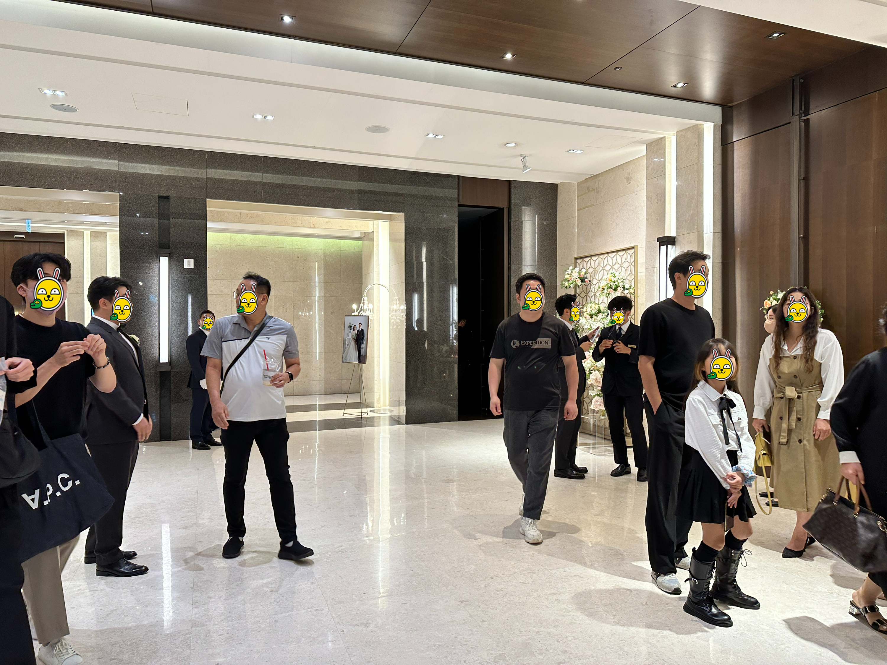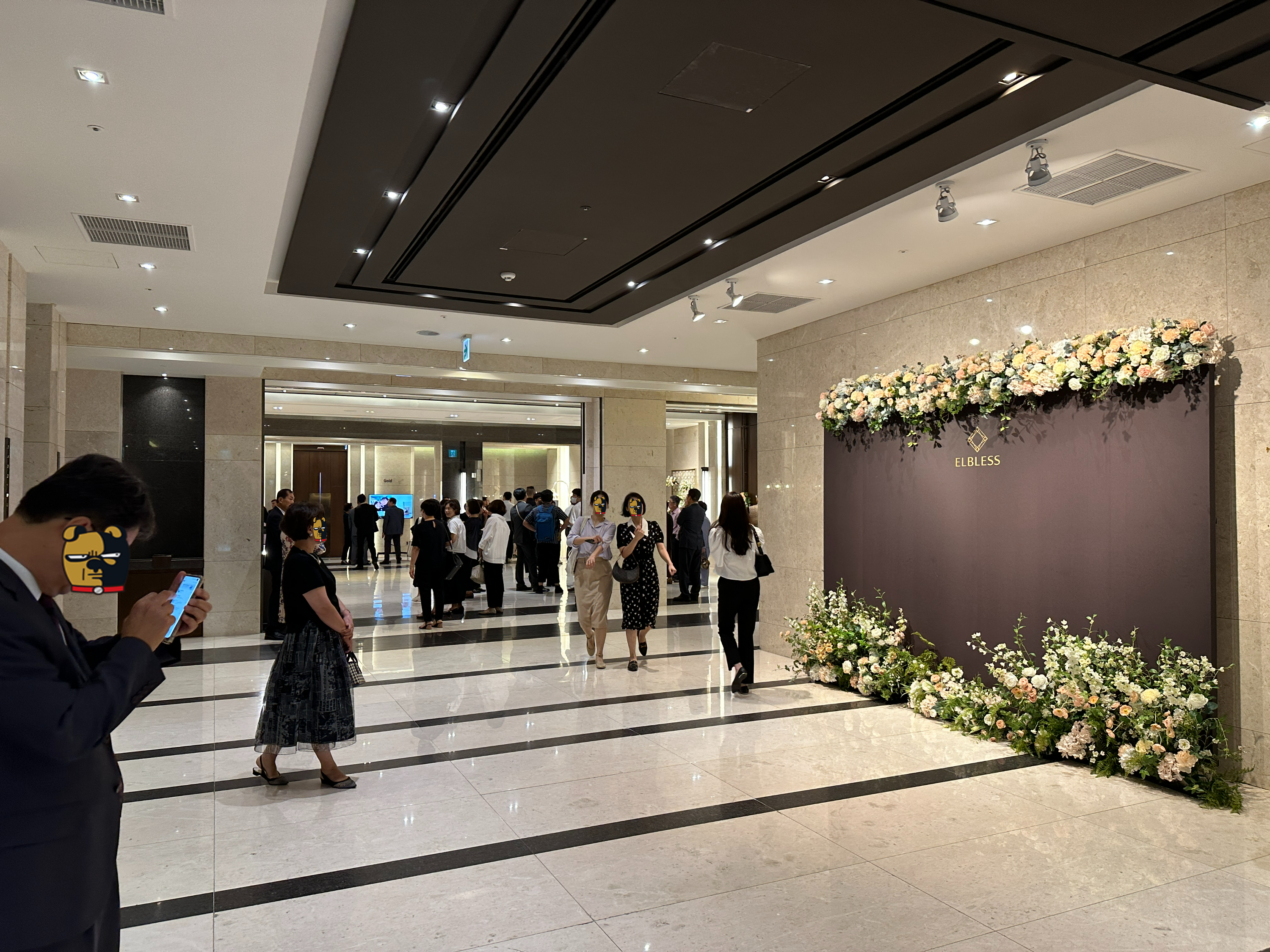 양재역 엘블레스 웨딩홀의 내부 전경입니다. 지난 번에 보았던 텅텅 빈 로비가 사람들로 가득한 모습입니다. 괜히 긴장...
