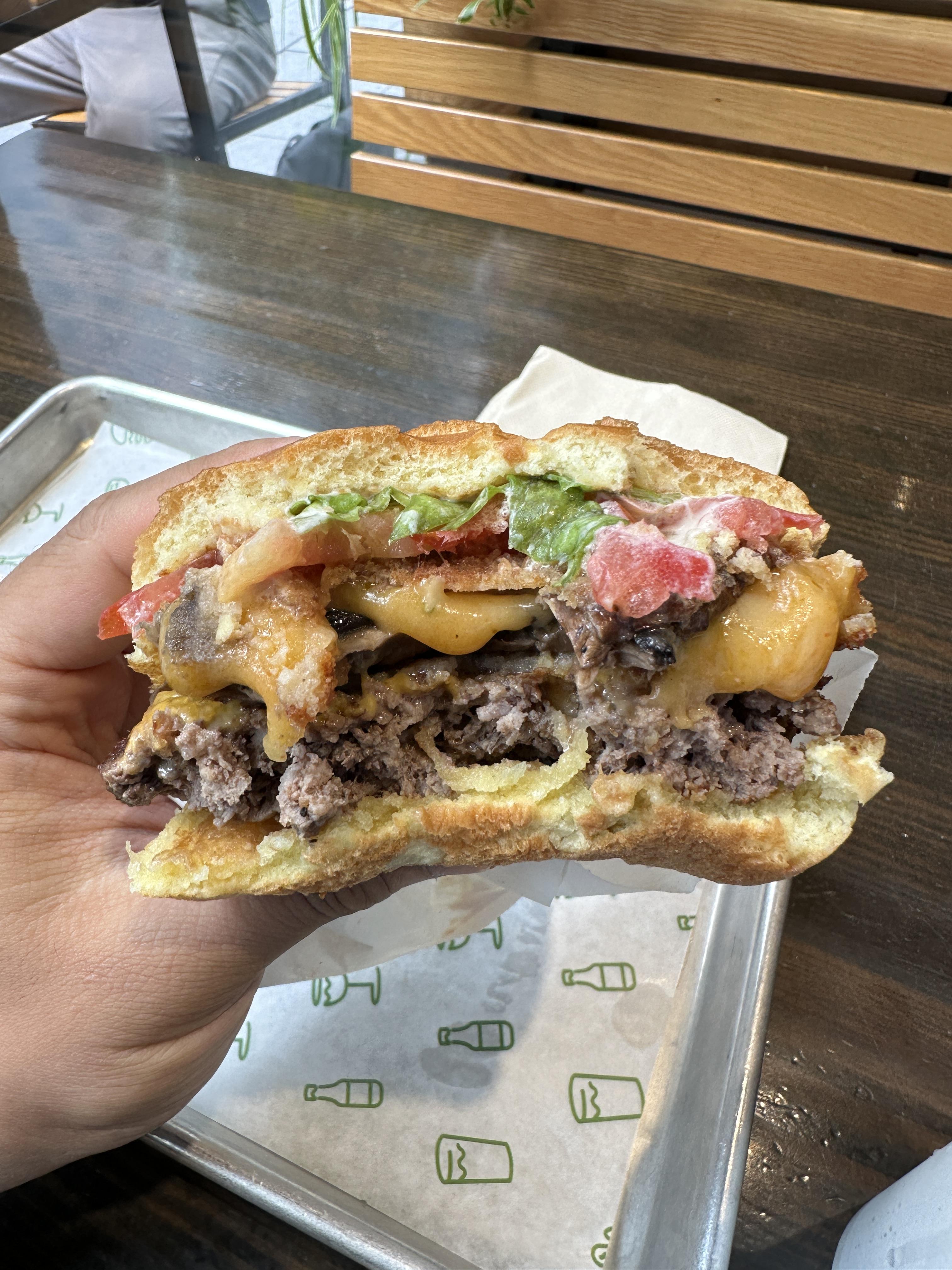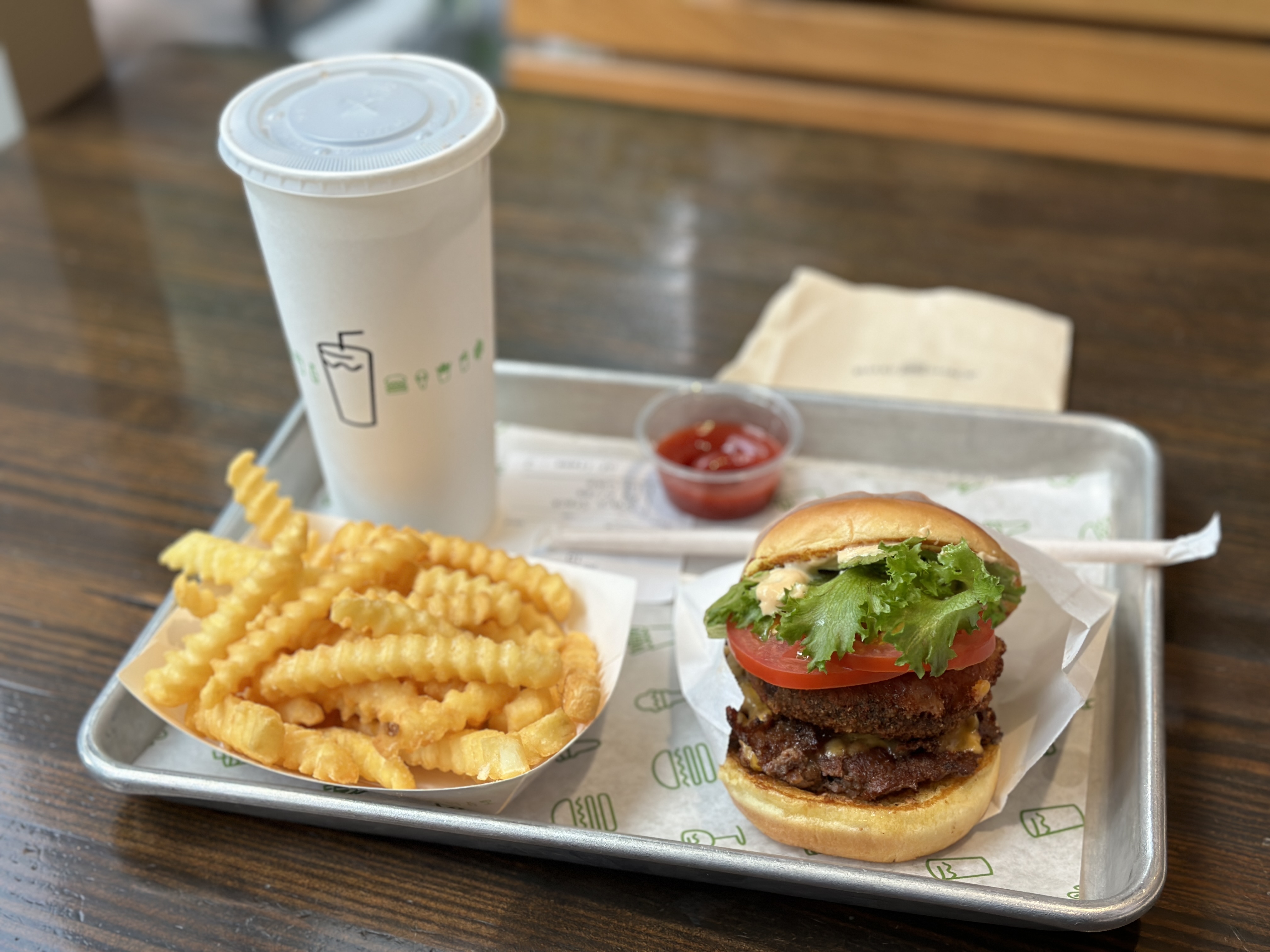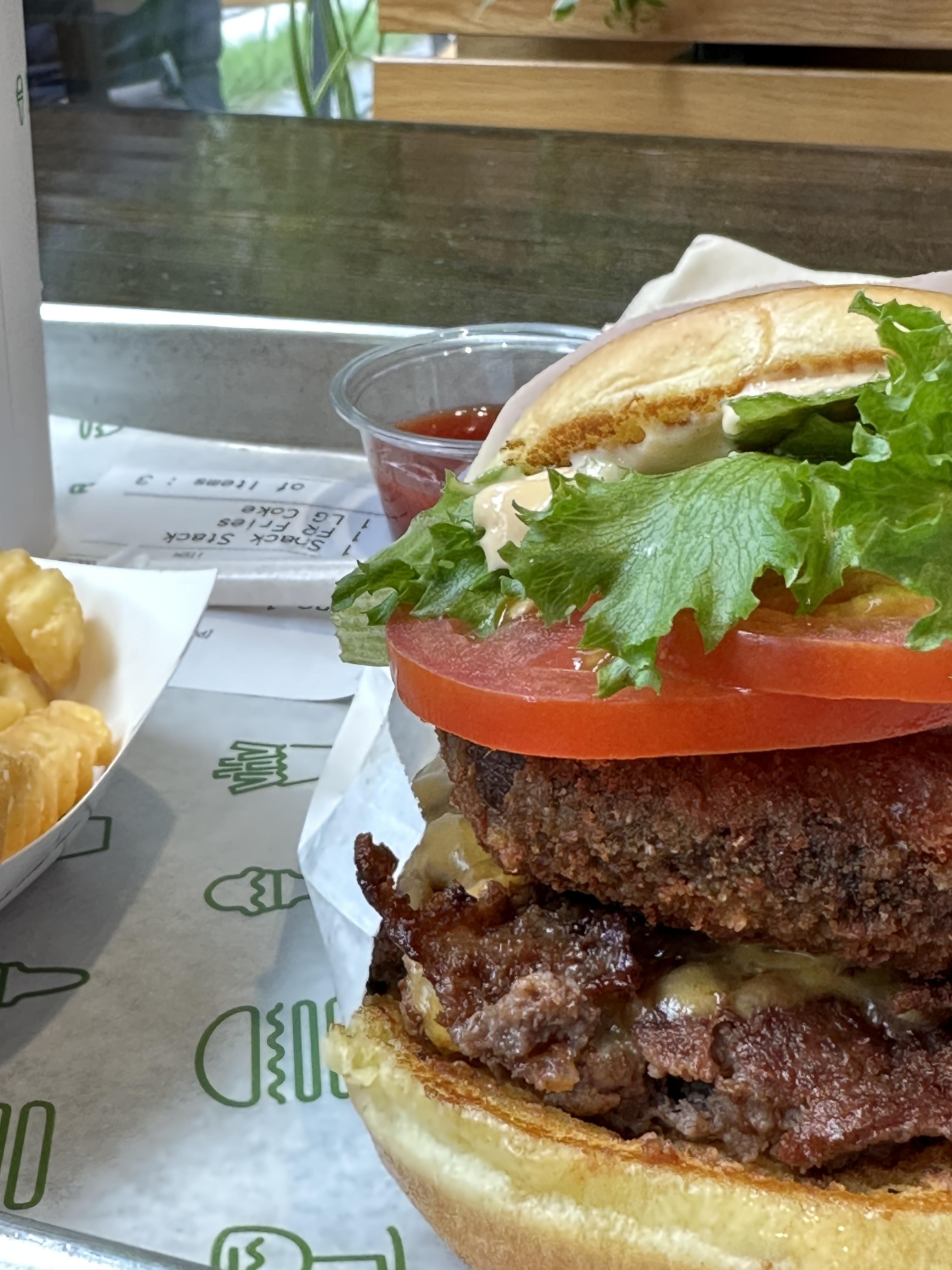 시켜먹은 음식은 쉑스택(Shack Stack)이라는 메뉴였고, 푸짐한 양이 일품이었습니다. 저는 개인적으로 쉐이크를 찍어먹는 것이 매력이 없다보니 콜라와 프렌치프라이를 추가하였어요. 쉑스택은 포토벨로 버섯 패티, 비프 패티와 함께 토마토, 양상추, 쉑소스가 토핑된 치즈버거로서, 든든하게 한 끼 식사로 매우 좋았습니다.