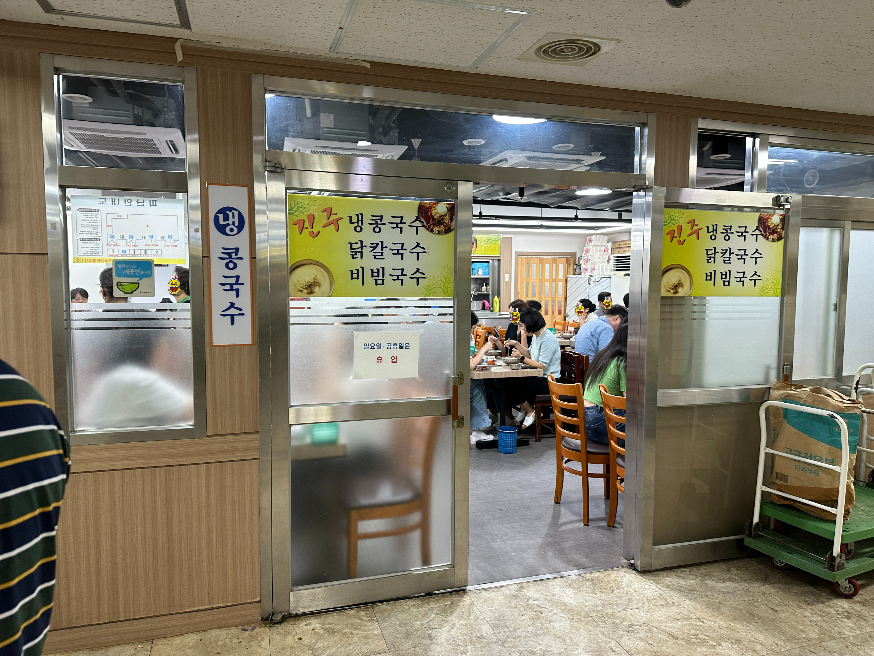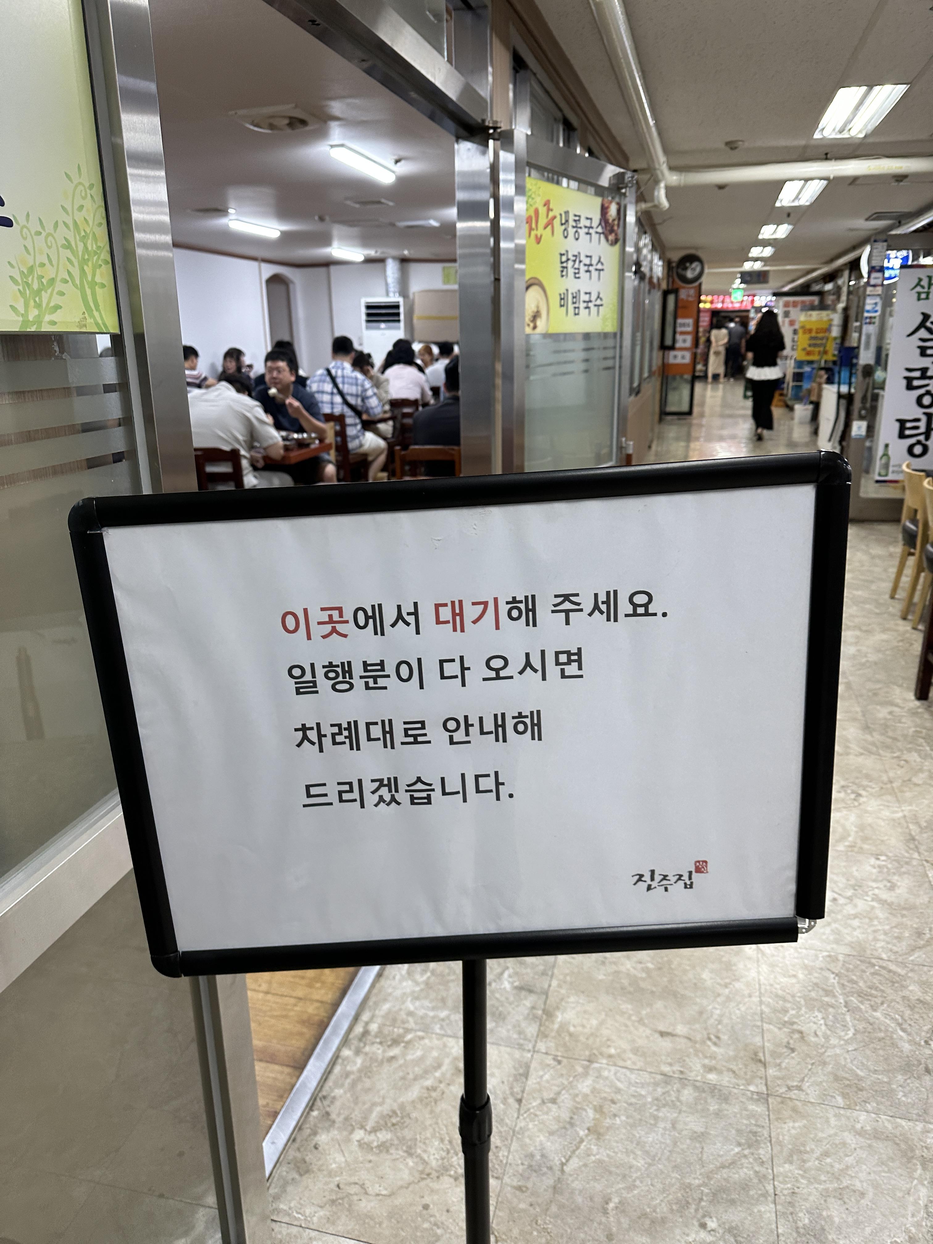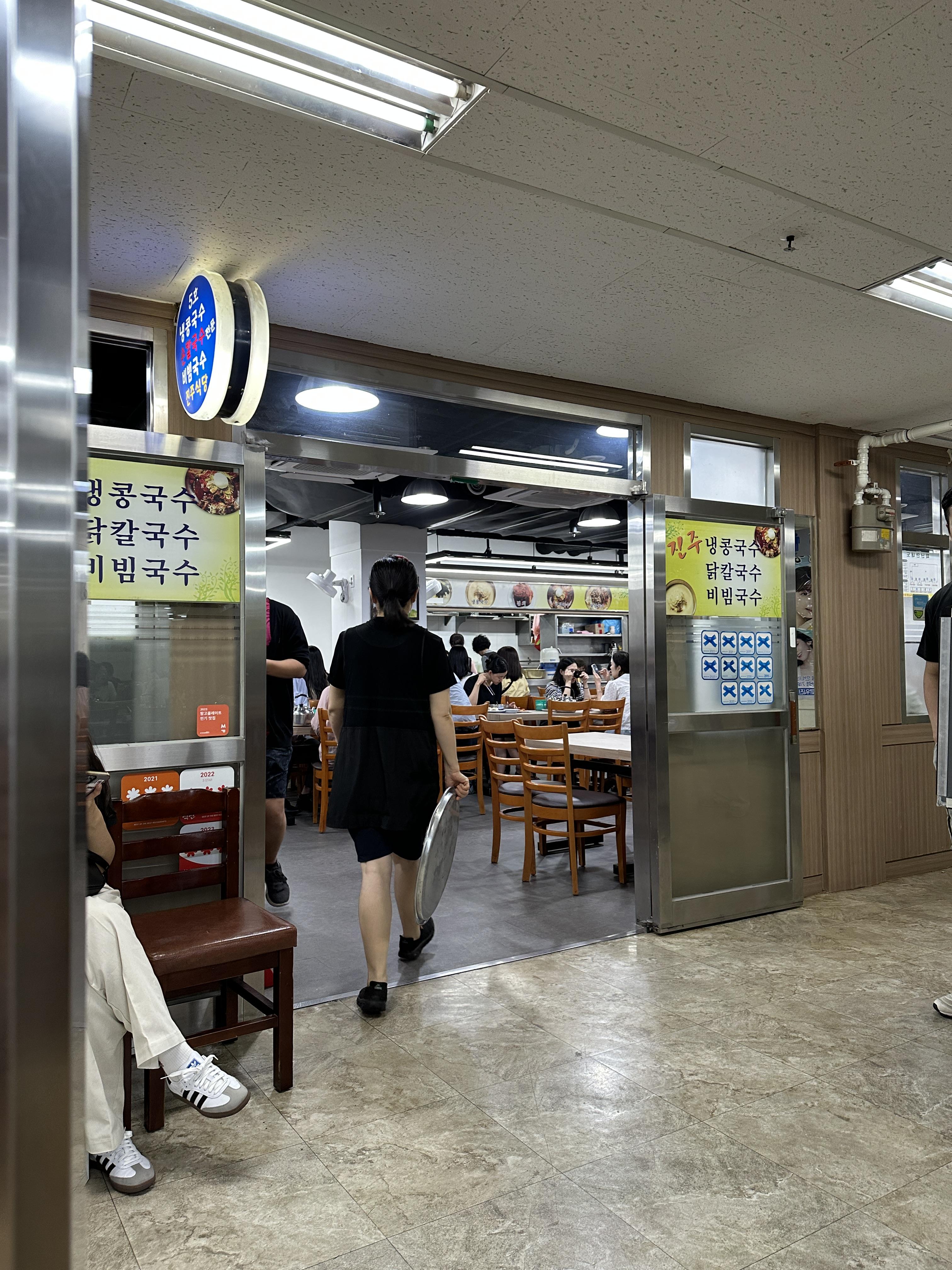 콩국수 1등 여의도 진주집의 외관은 정말 특별할 것 하나도 없는 평범한 매장입니다. ㅋㅋㅋ 어디서나 볼 수 있는 지하상가 식당. 그 이상 이하도 아니에요. 다만, 손님이 엄청많다보니 대기줄이 안내되어 있다는 점, 그리고 일행이 다 와야 들어갈 수 있다는 점 ㅋㅋㅋㅋ