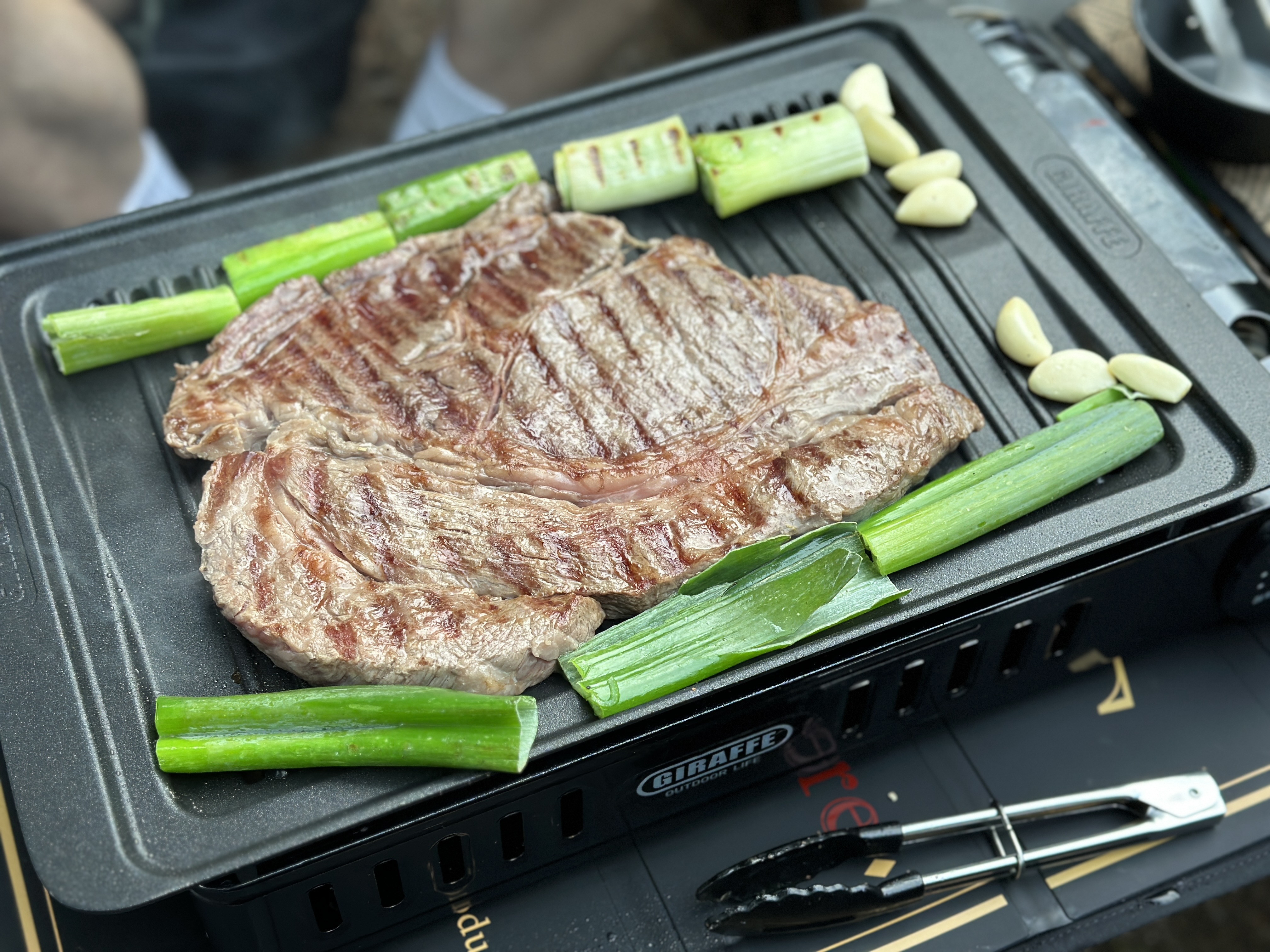 일행들과 피칭을 마치자마자 바로 고기부터 굽습니다. 치익치익-