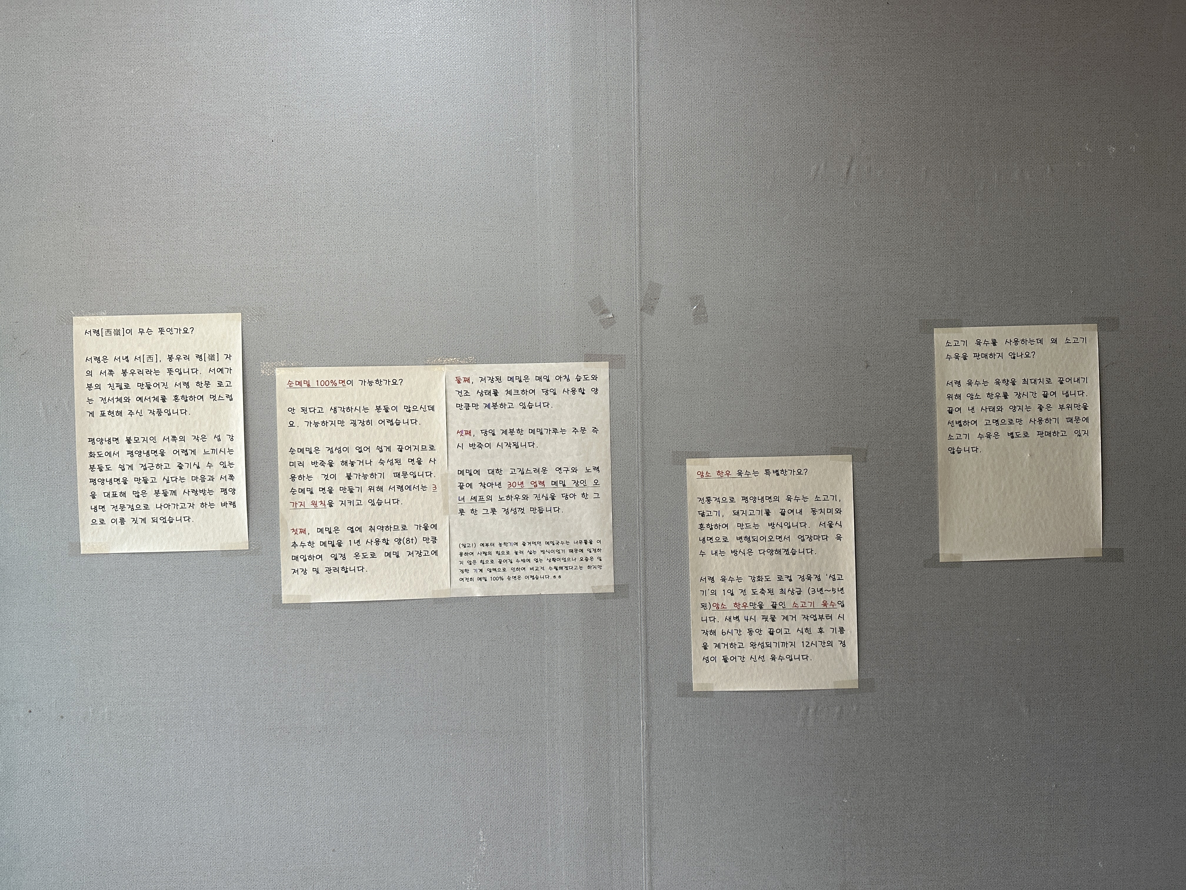 저희는 평양냉면 보통, 곱배기, 들기름 메밀국수, 비빔 메밀국수 이렇게 네그릇을 시킵니다.