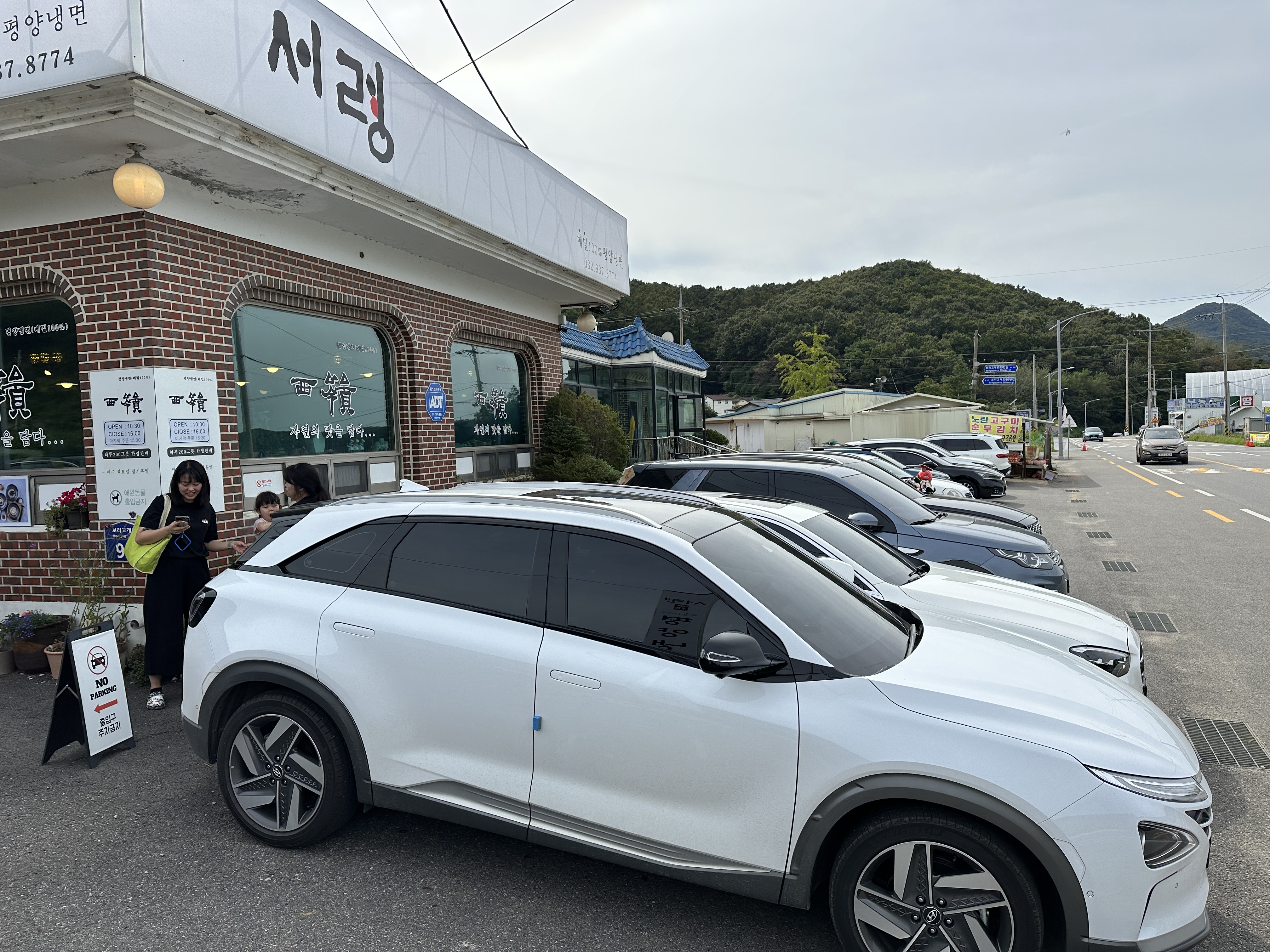 강화도 메밀 100% 평양냉면집 서령은 주차장이랄 것도 없는 게, 그냥 가게 옆의 공터가 주차장이고, 앞쪽 도로 사이에도 주차를 합니다. 인기가 많다보니 만차예요. 2시쯤 갔던 것 같은데도요.