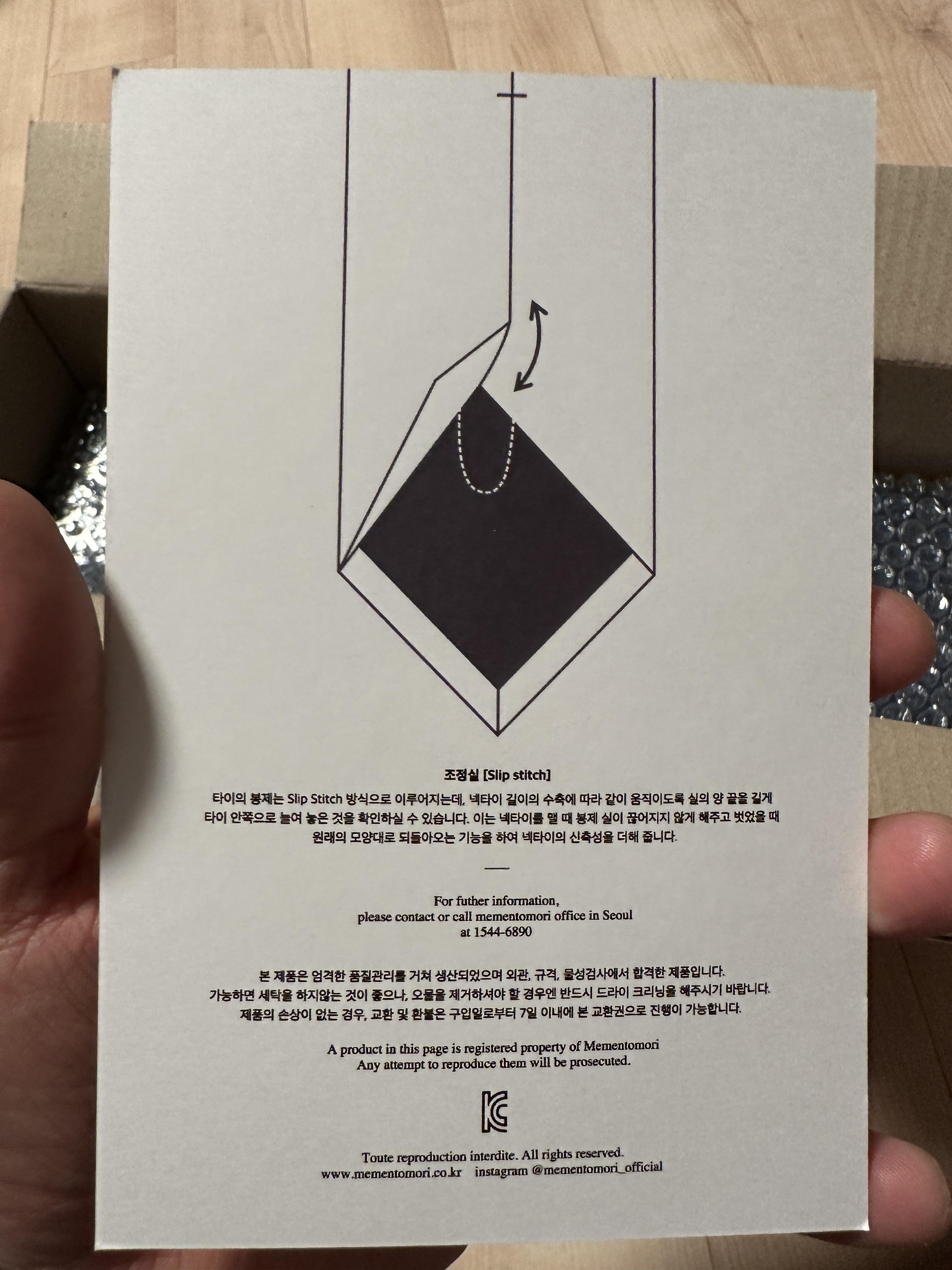 브랜드의 소개와 메멘토모리 타이의 특징을 간략하게 설명하는 종이 한 장이 들어있습니다. 심지어 KC마크 ㅋㅋㅋ (근데 넥타이에 인증마크가 있을 게 있나? 잘 모르고 하는 소리니 이해해주세요 ㅎㅎ)
