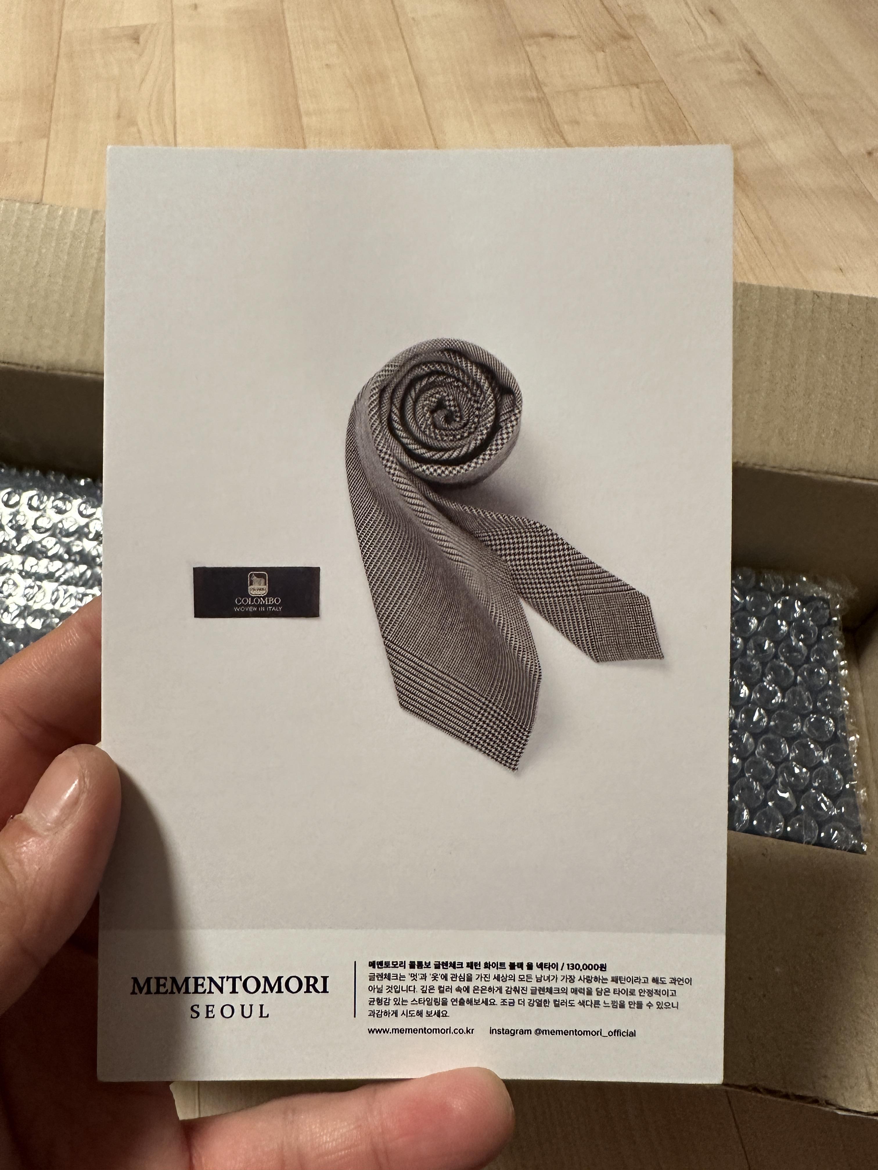 개봉해봅니다. 박스도 상당히 고급스럽고, 안에 종이로 한 번 더 포장되어 있는 것도 고급스럽습니다. ㅎㄷㄷ 넥타이 안사봐서 사실 잘 몰라요 ㅋㅋ 앞으로 넥타이 구입의 기준이 메멘토모리가 되겠죠?ㅎ