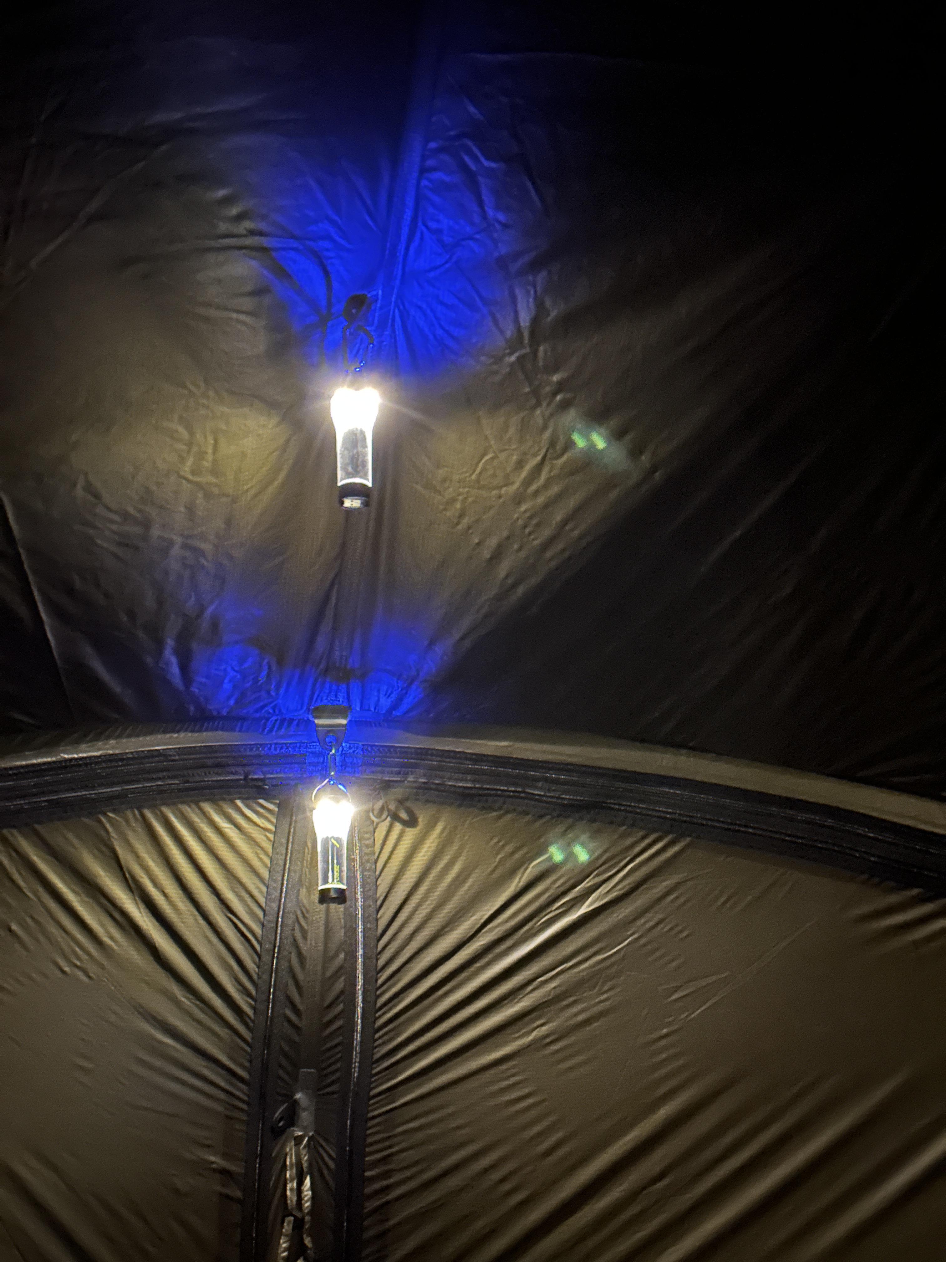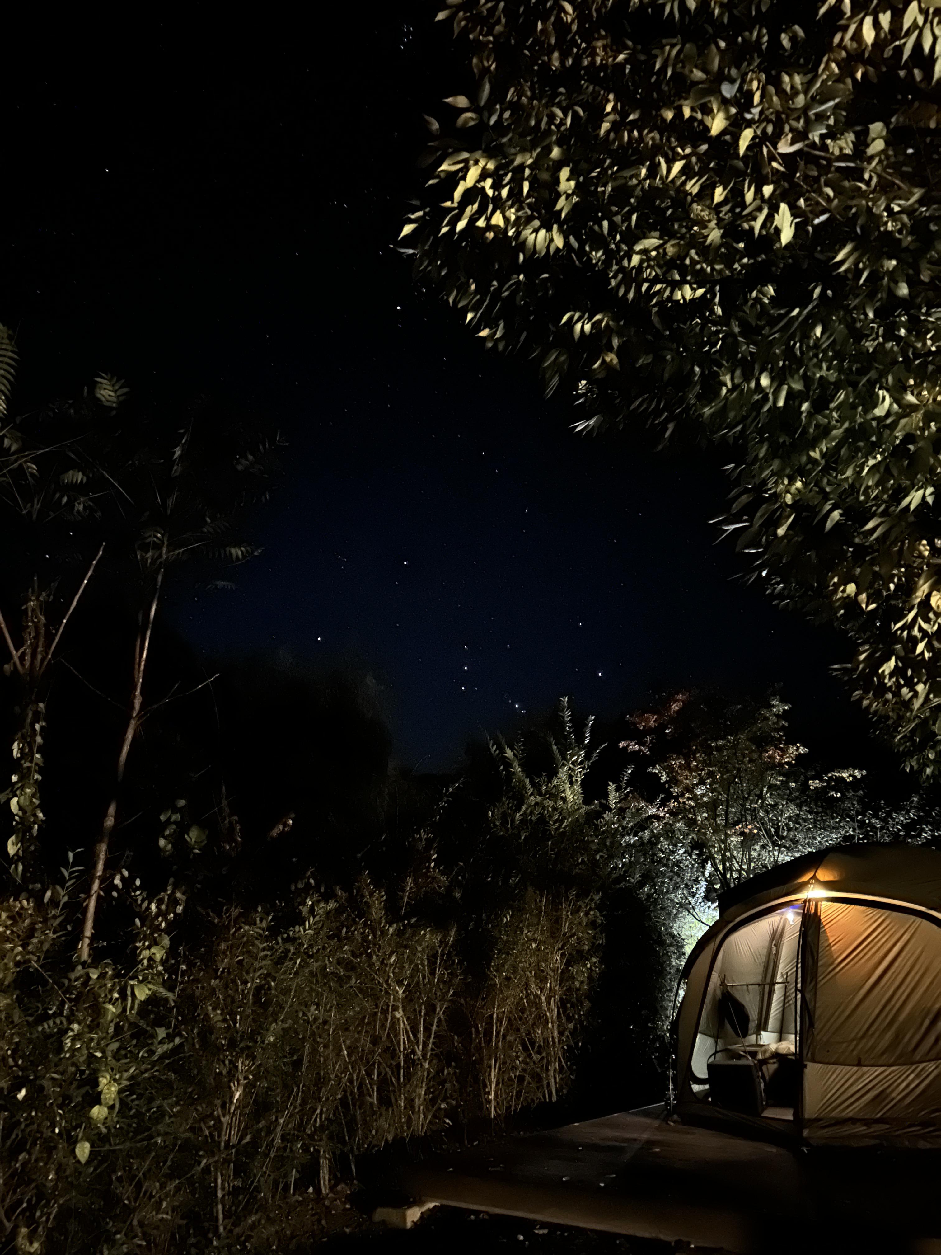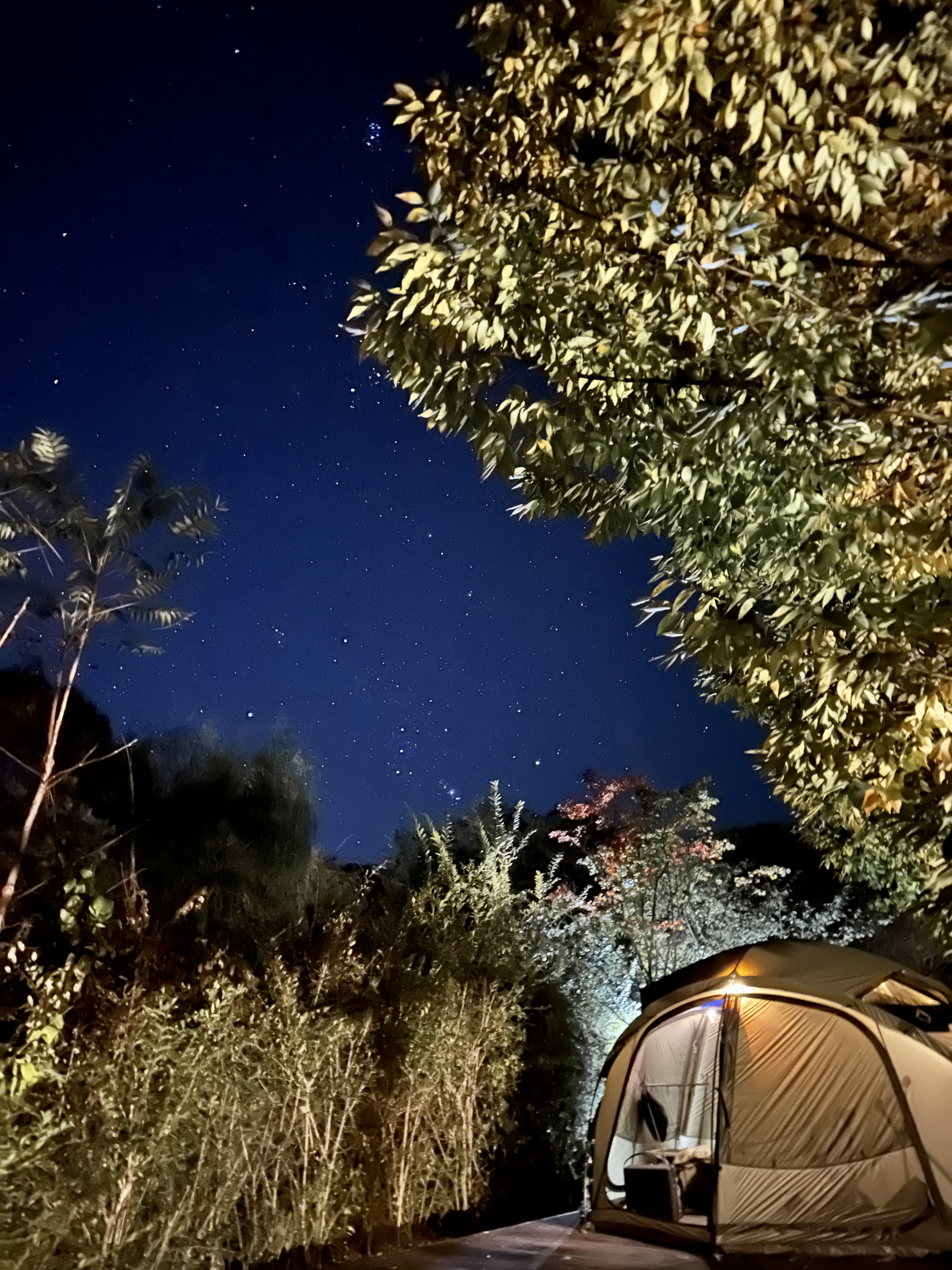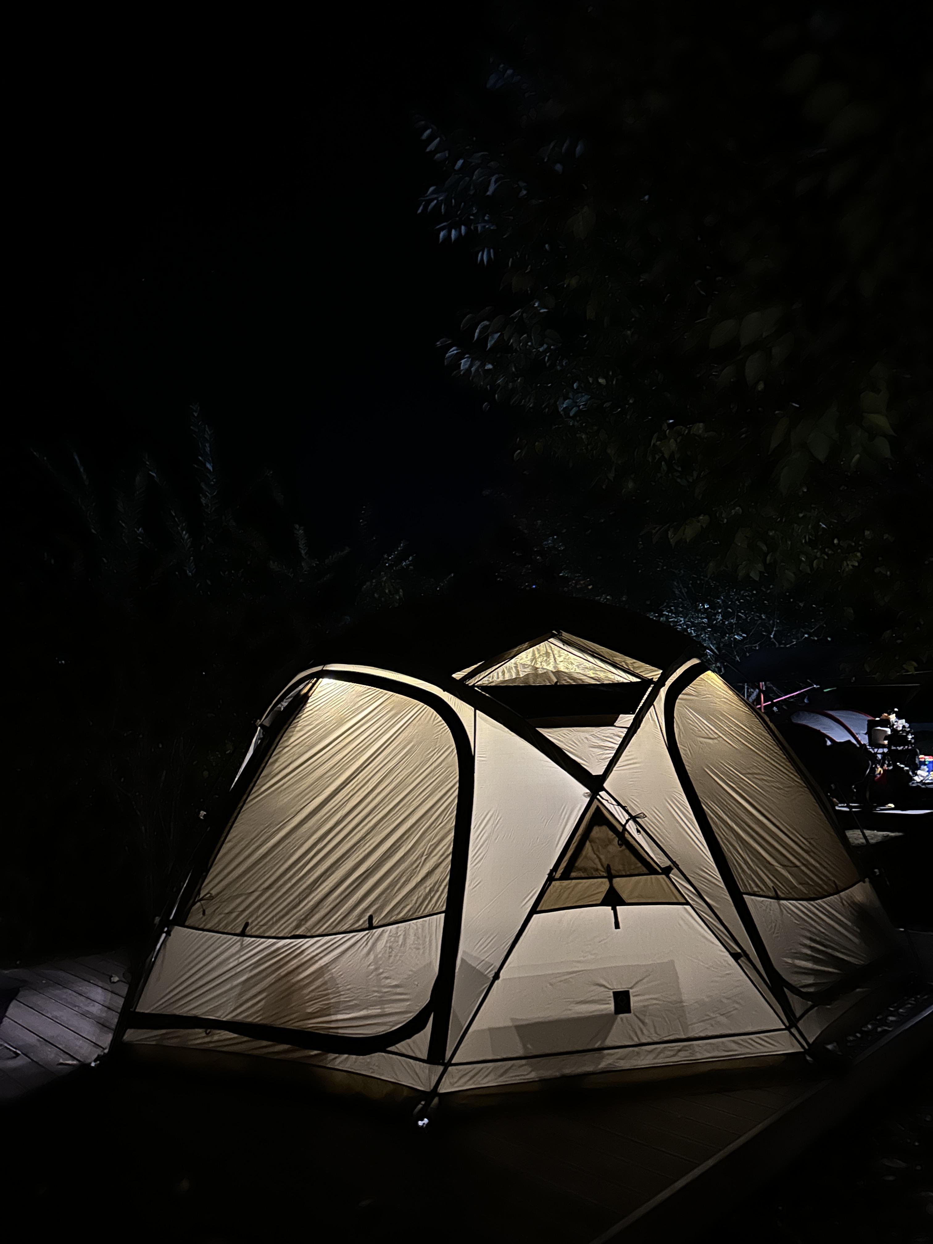 밤이 되니, 가을의 코요태 탄 색깔의 텐트는 거의 감성 깡패가 되어버렸습니다. 골제로로 밝힌 텐트 내부는 이런 감성있는 어둠을 연출해 줍니다. 밤하늘이 너무 잘 보이는 캠핑장의 특색과 헬리녹스(Helinox) 택티컬 노나돔 4.0 코요테 탄, 잘 어울리지 않나요?
