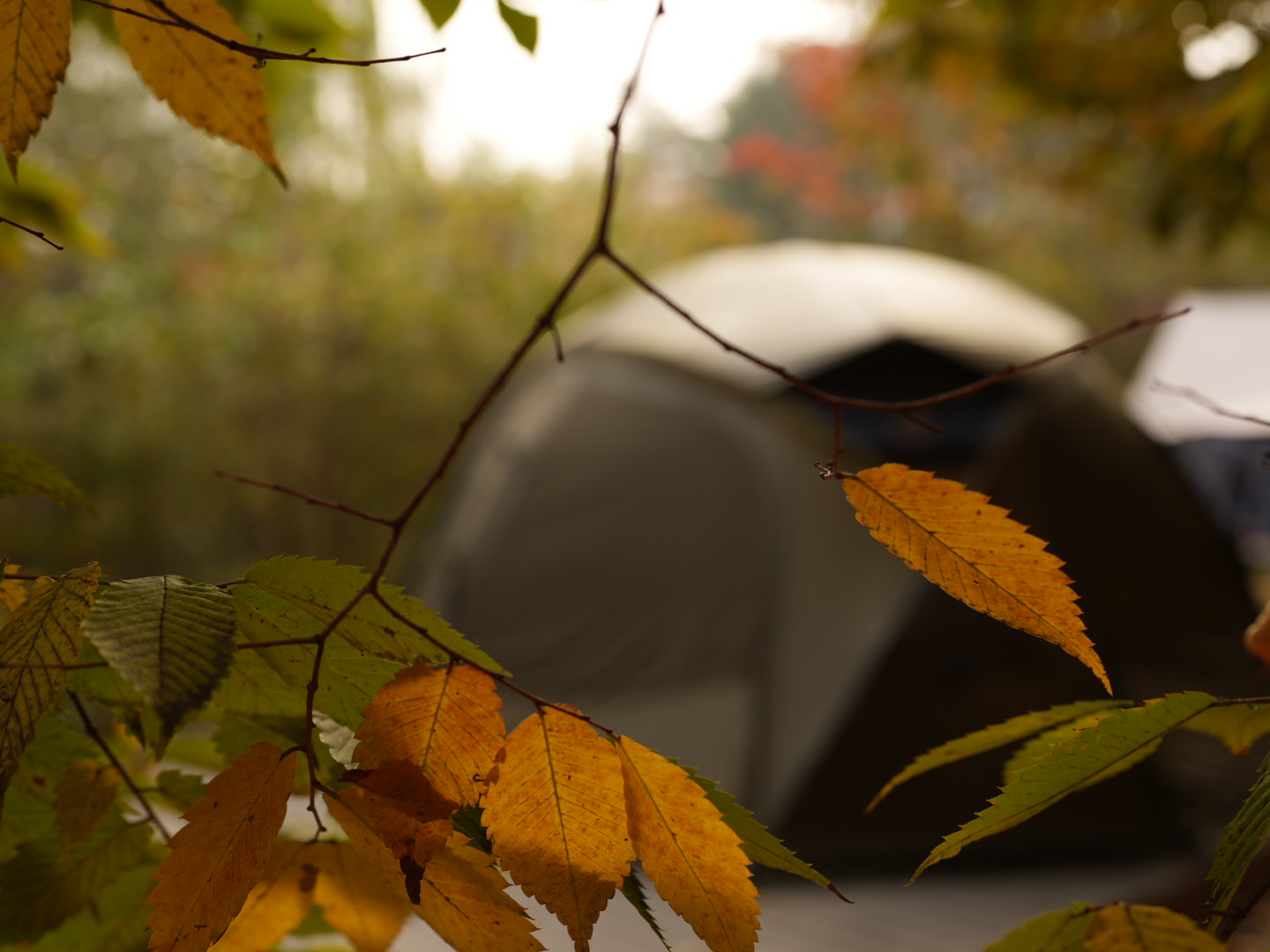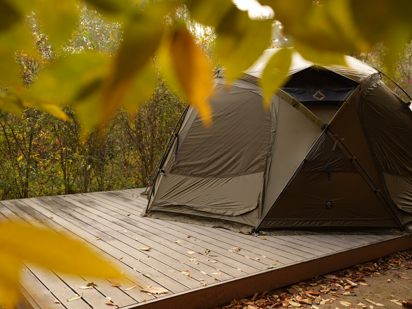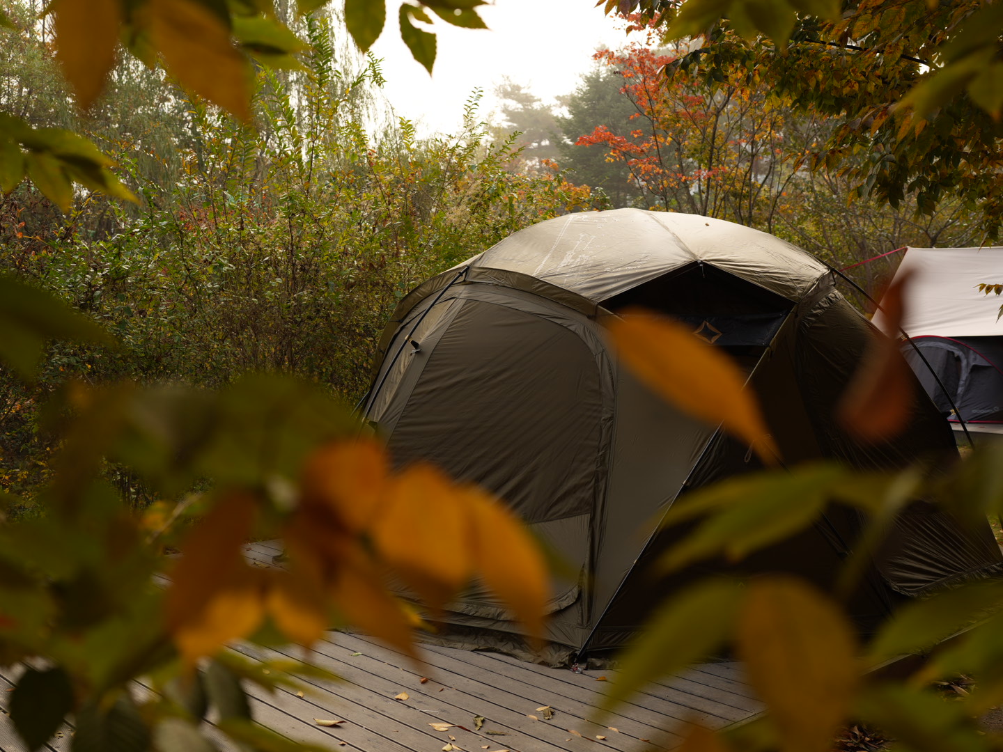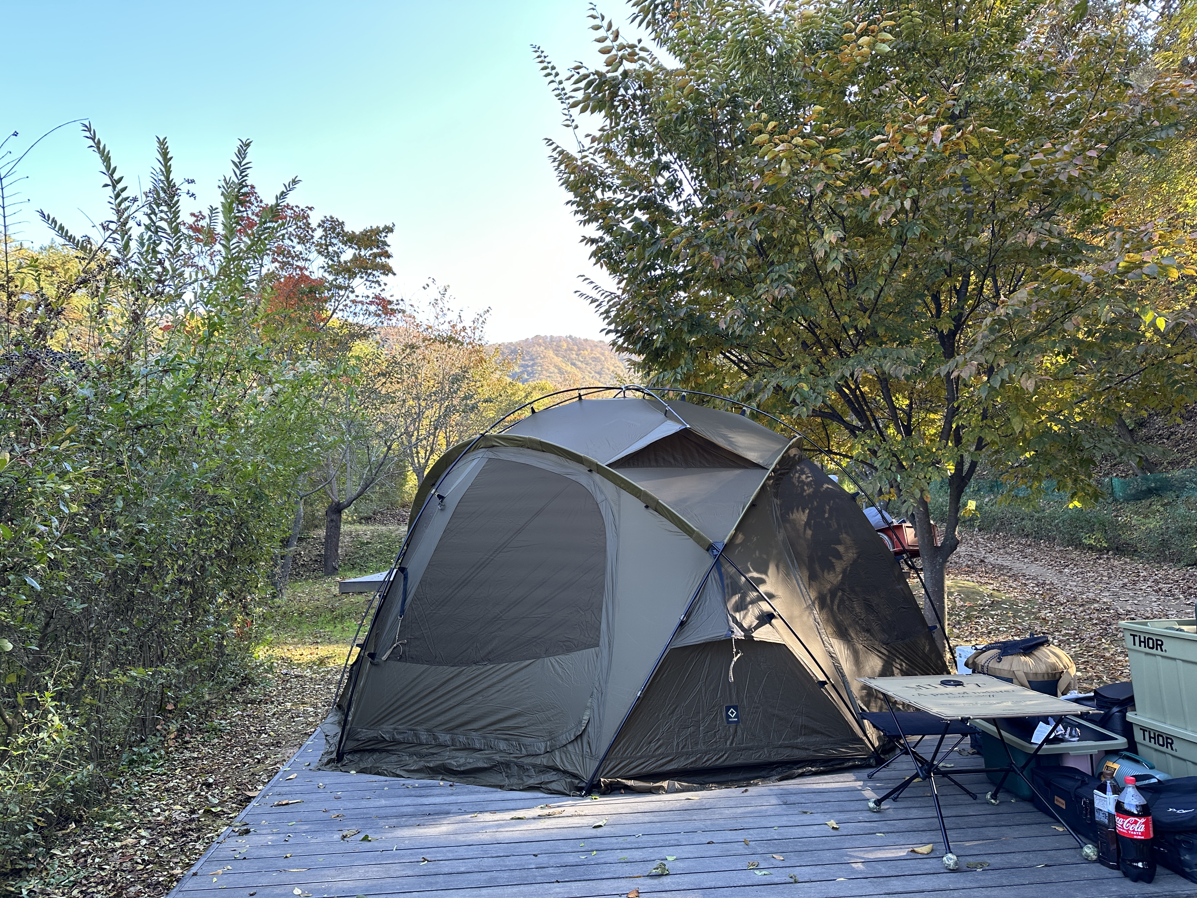 햇살이 내리뙤는 텐트 내부는 생각보다 더 화사한 느낌이었습니다. 가을이다보니 울긋불긋한 산 속 풍경과도 완벽하게 어우러지는 모습이었구요.
