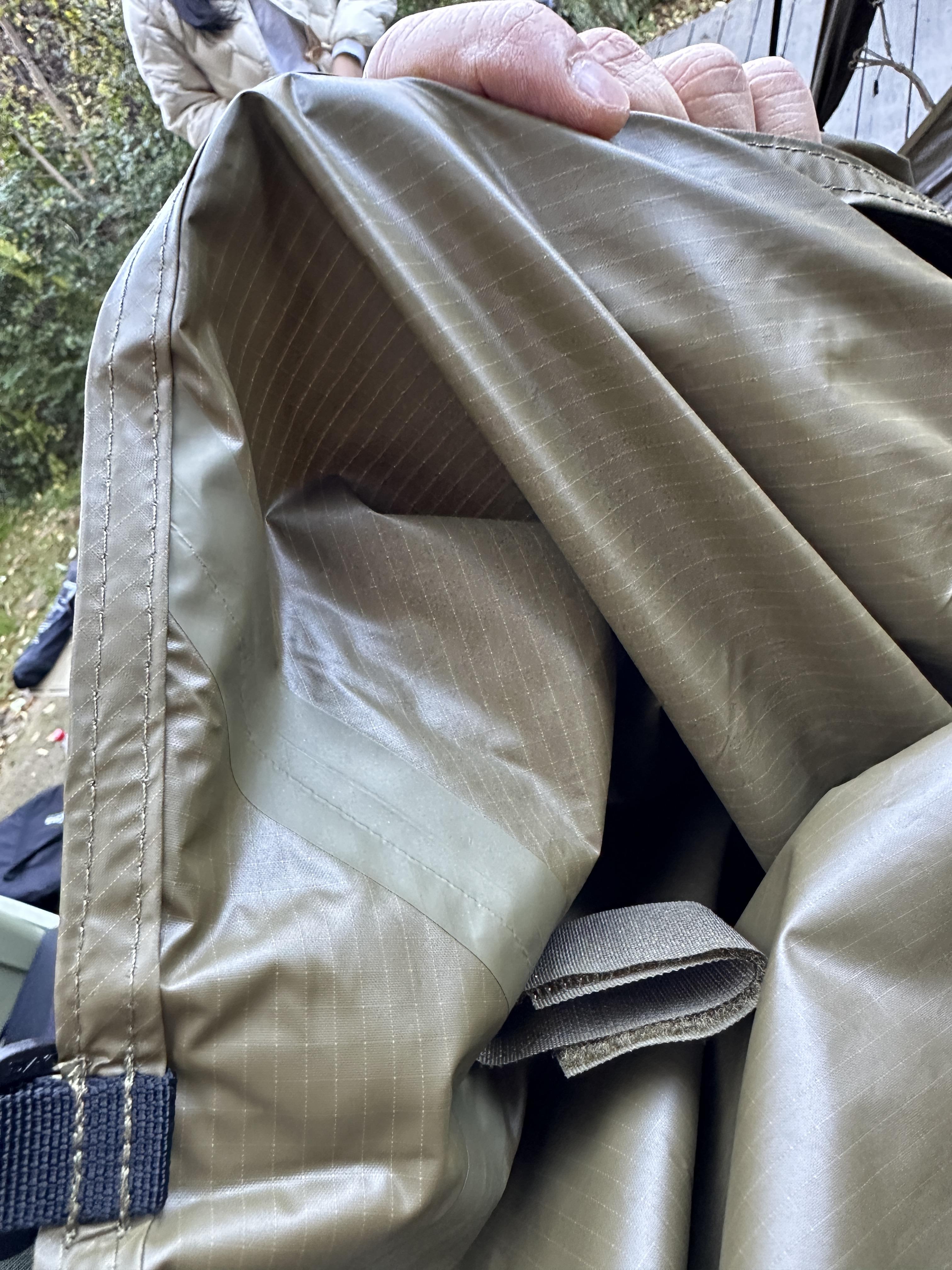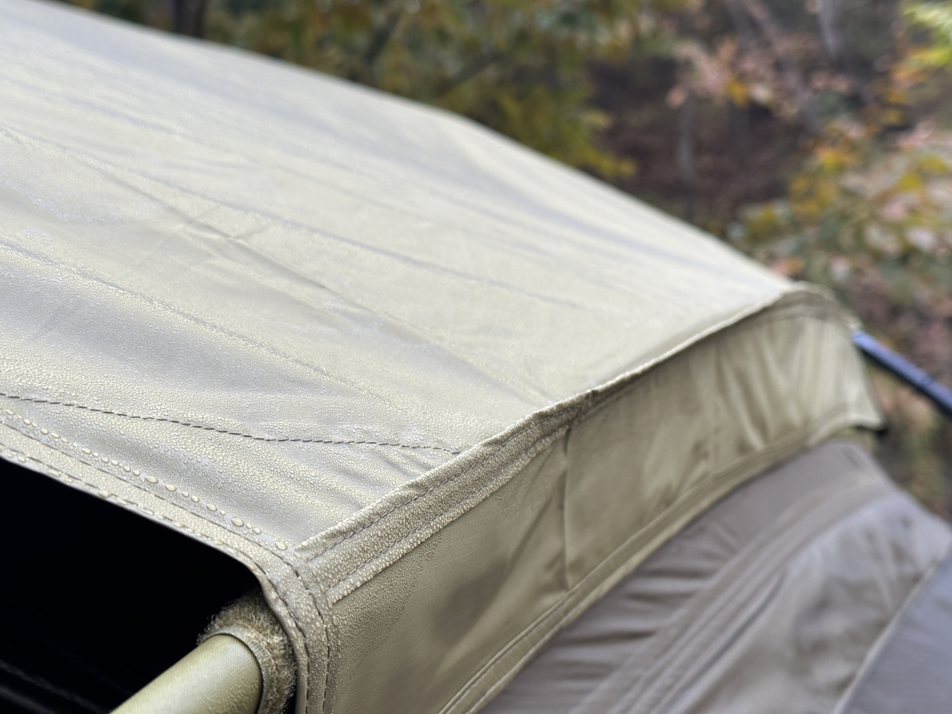 이 부분은 헬리녹스(Helinox) 택티컬 노나돔 4.0 코요테 탄의 여닫이 문 하단쪽입니다. 방수를 위해 지퍼덮개를 활용한 모습인데요, 아무래도 옆이나 위쪽은 쉽게 방수를 적용할 수 있었겠지만, 이 부분은 수분이 들어오는 것을 막기 위한 방책을 마련하기 어려웠을 듯 합니다.