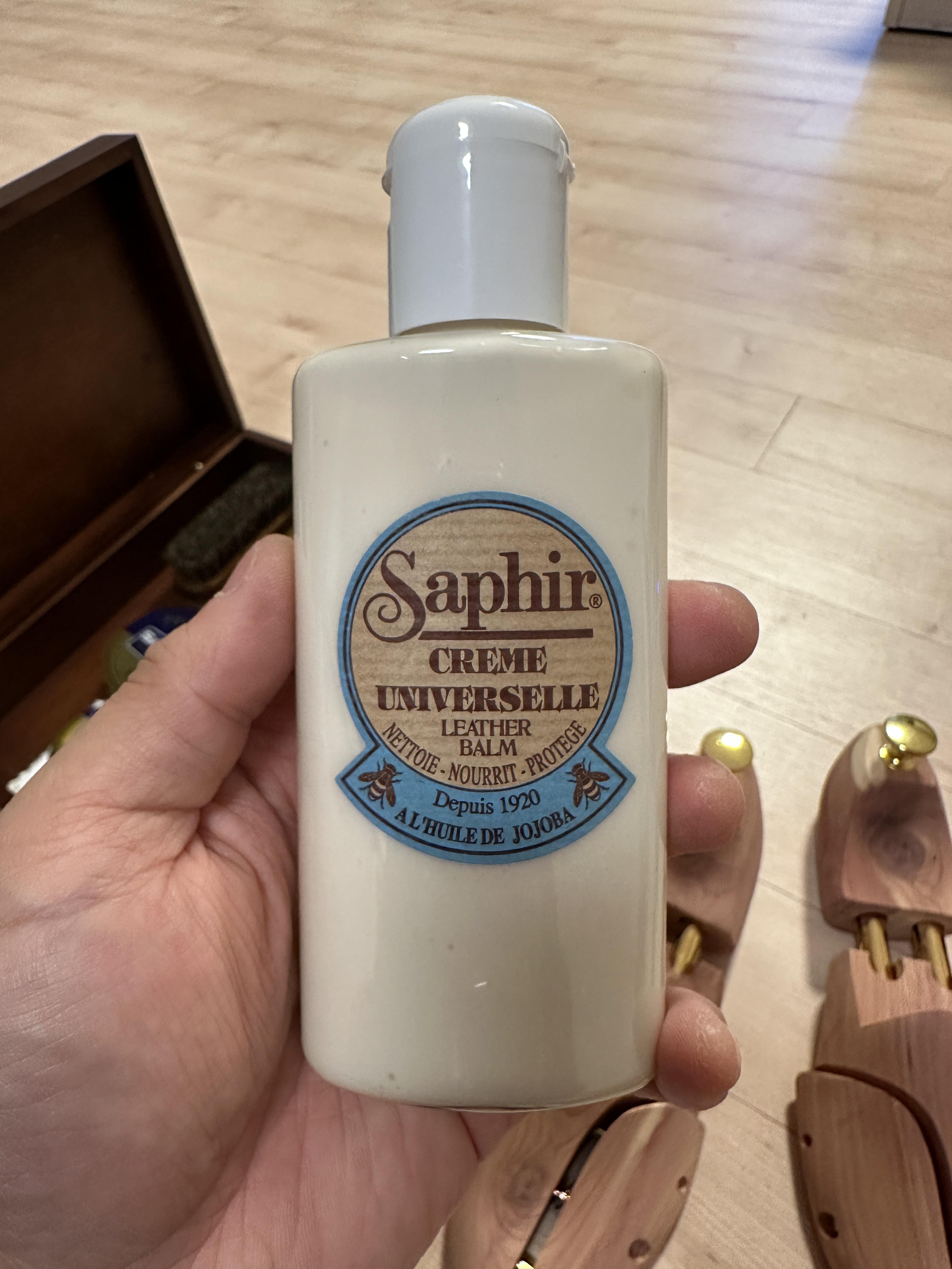 피르(SAPHIR) 원목 슈케어 박스 세트 키트의 유니버설 크림입니다. 가벼운 얼룩 제거 및 영양을 공급하는 제품입니다.