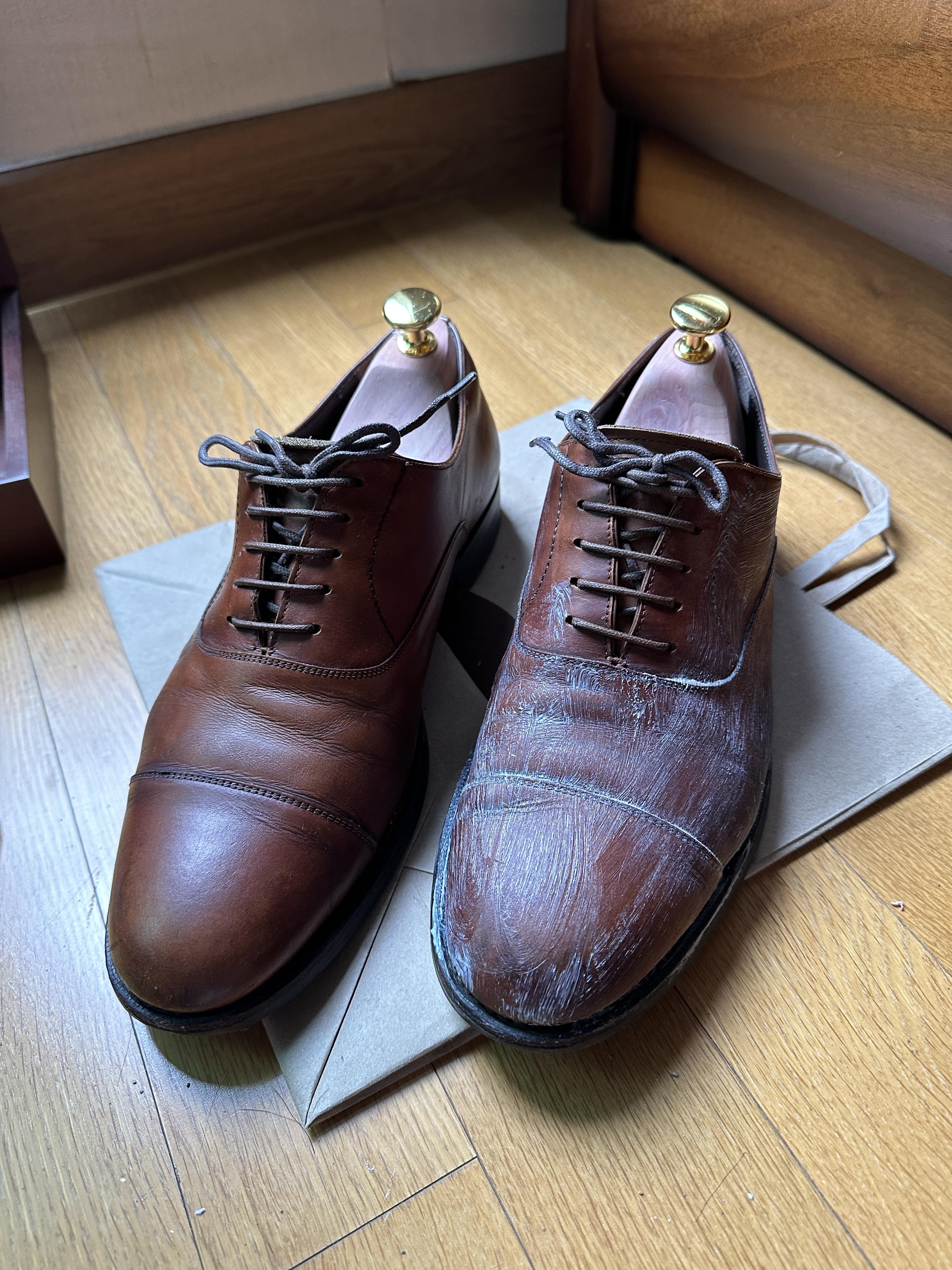 오랜기간 신지 않아 관리가 안되어 있는 구두 두개를 꺼내옵니다. 상당히 세월이 느껴지는 구두들입니다.