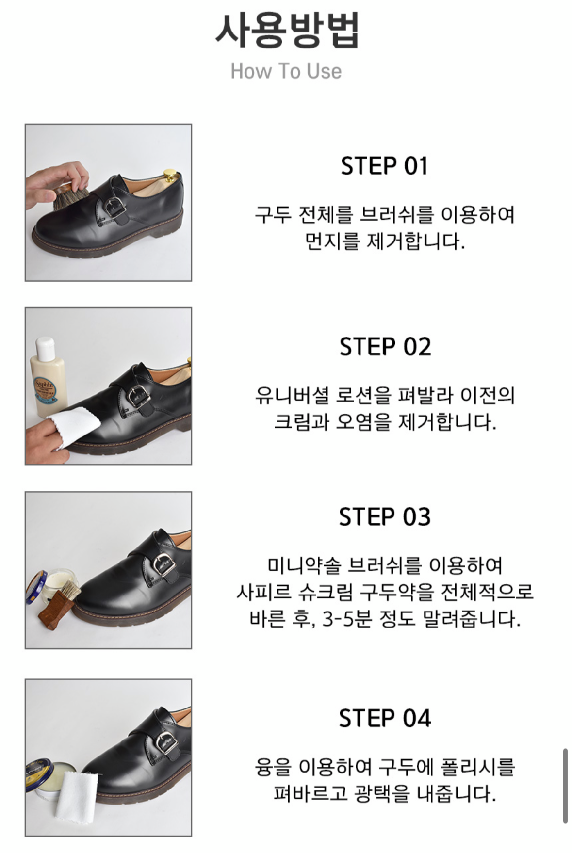 사용방법은 매우 간단합니다. 위의 순서대로, 브러쉬로 정리> 유니버설 로션> 슈크림구두약 > 폴리시 순으로 진행하면 된다네요!! 가보자!!