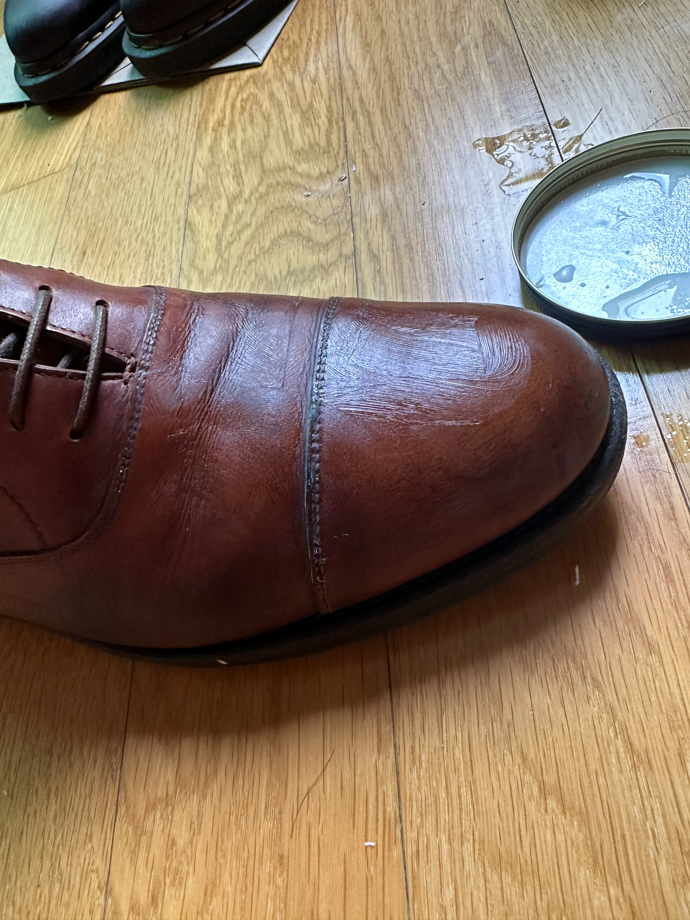슈크림을 바르고 조금 기다리다가 다시 열심히 융으로 닦아봅니다. 어느정도 광이 나는 듯 한 모습입니다.