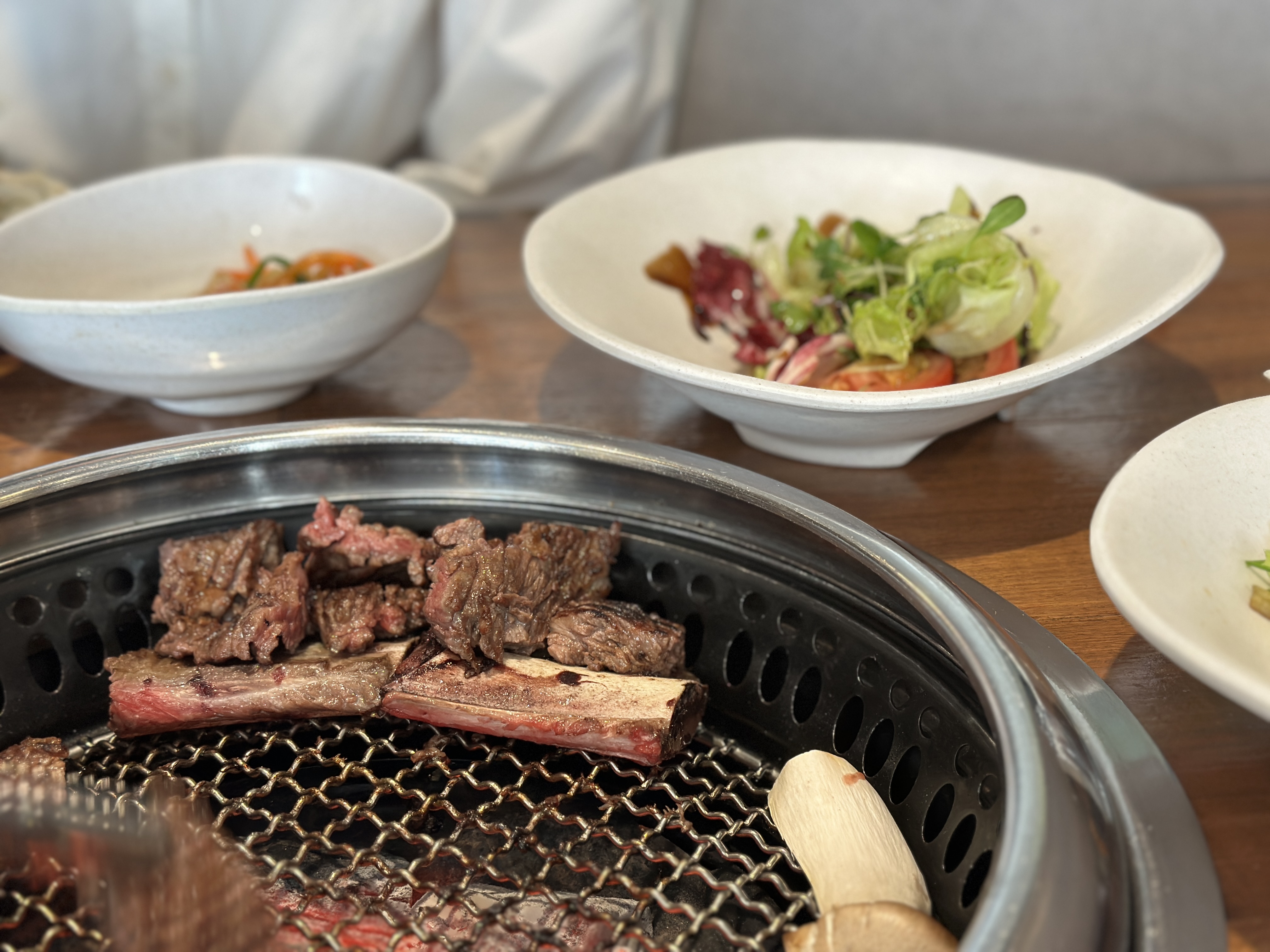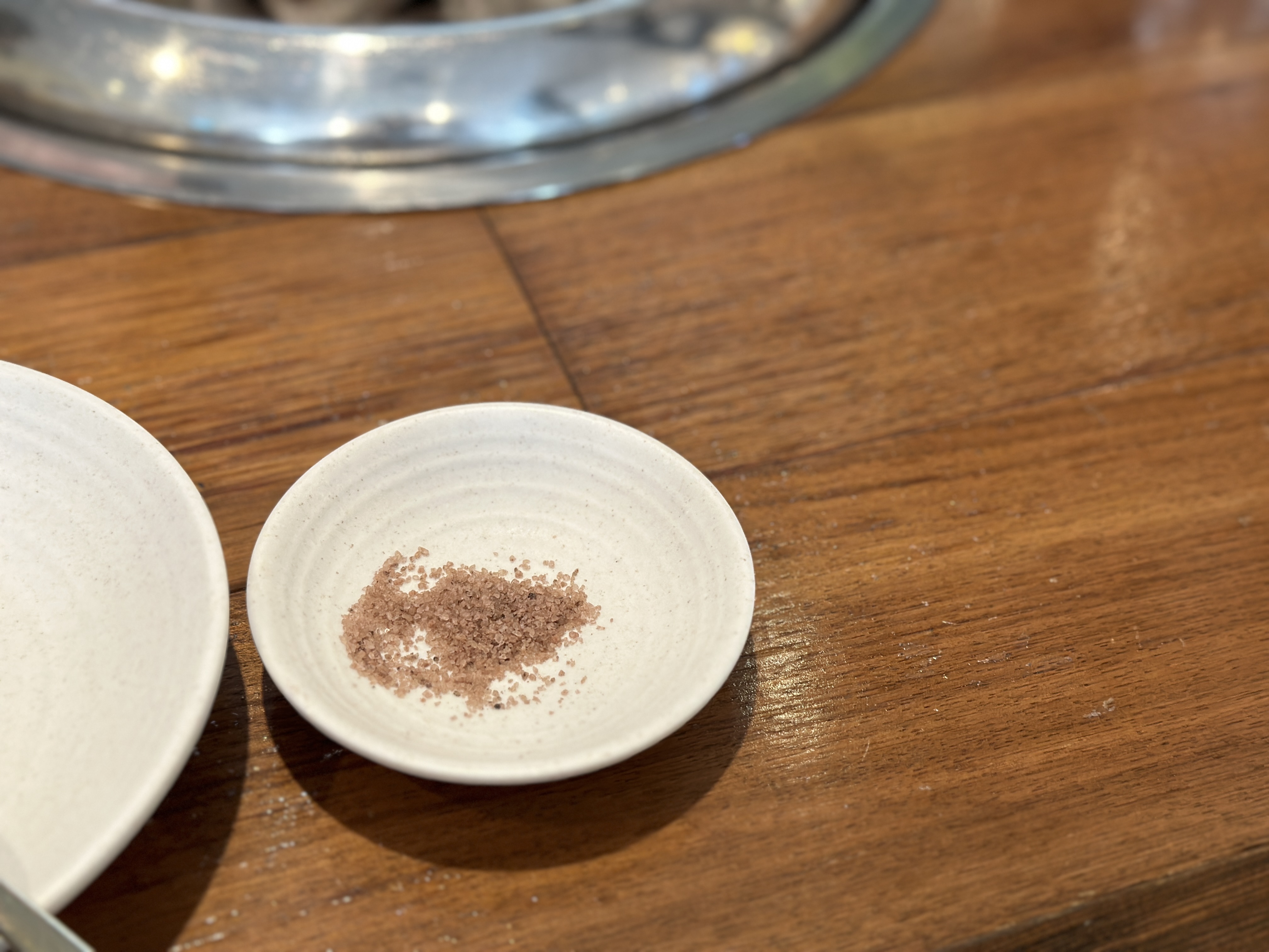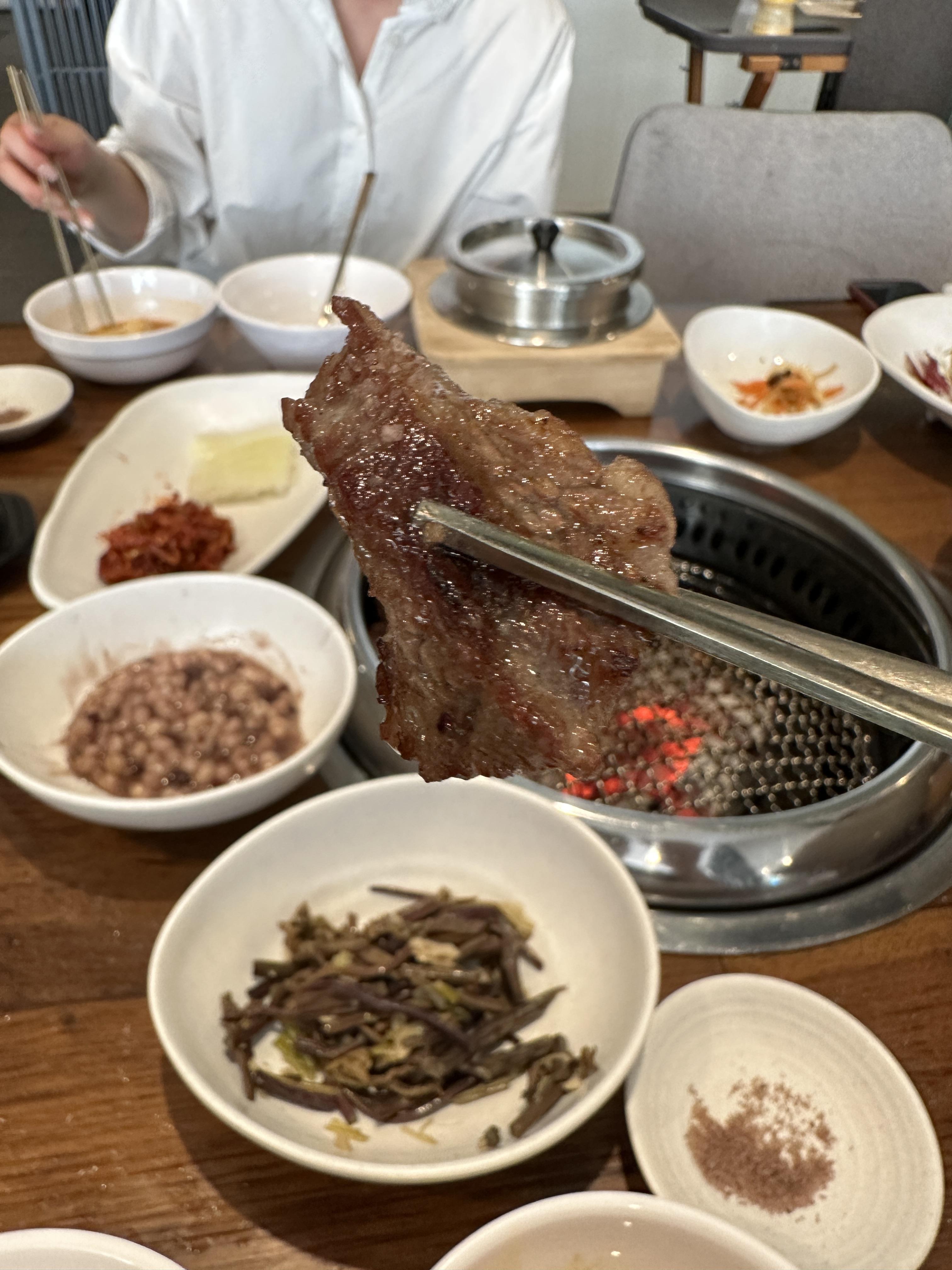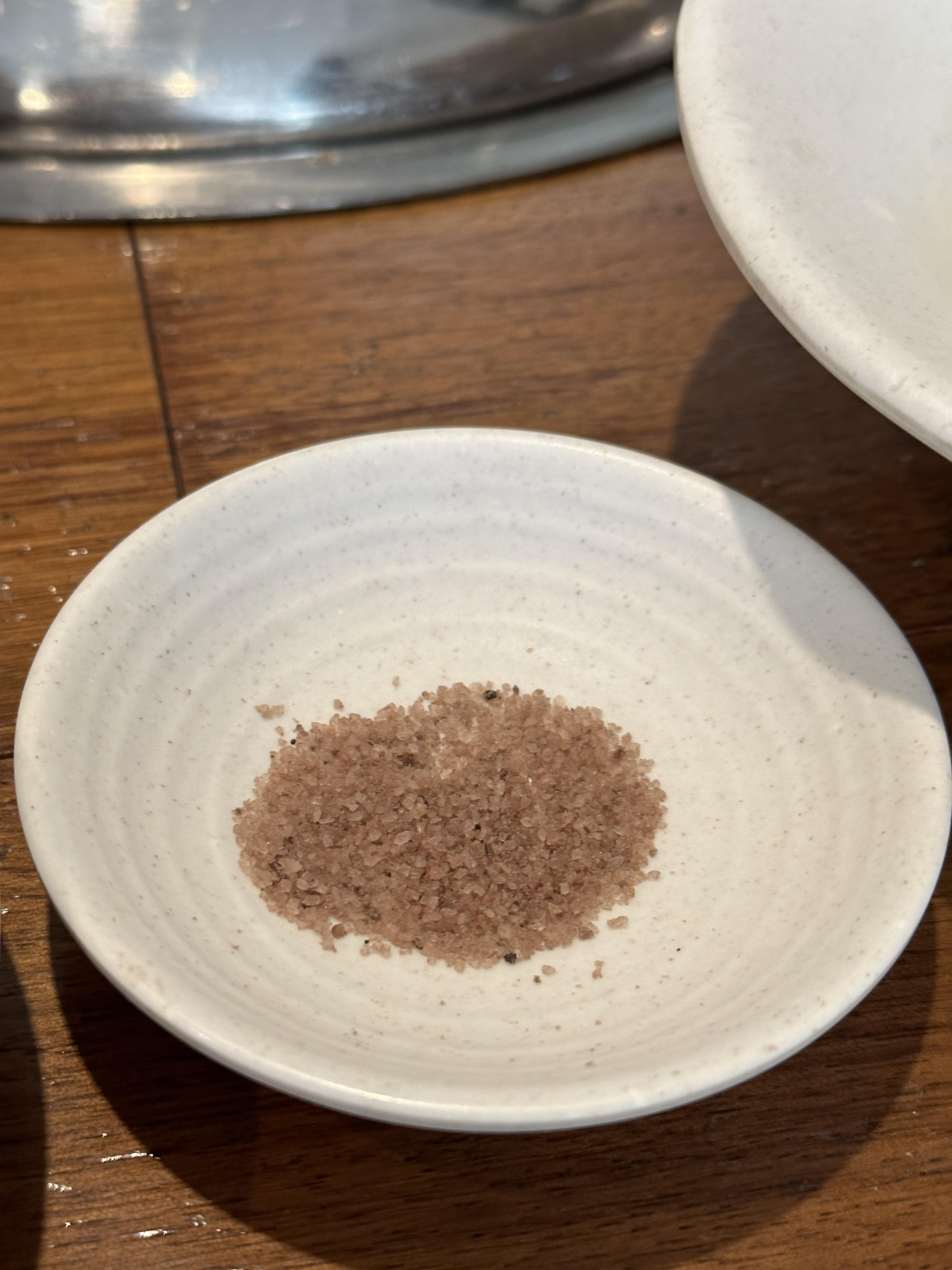 드디어 잘 익은 생갈비 한 점을 들어 소금에 찍어 먹습니다. 지금 생각해보니 소금도 평범하지는 않았어요. 콕 찍어서 먹는 그 맛이란... 극락이었죠.