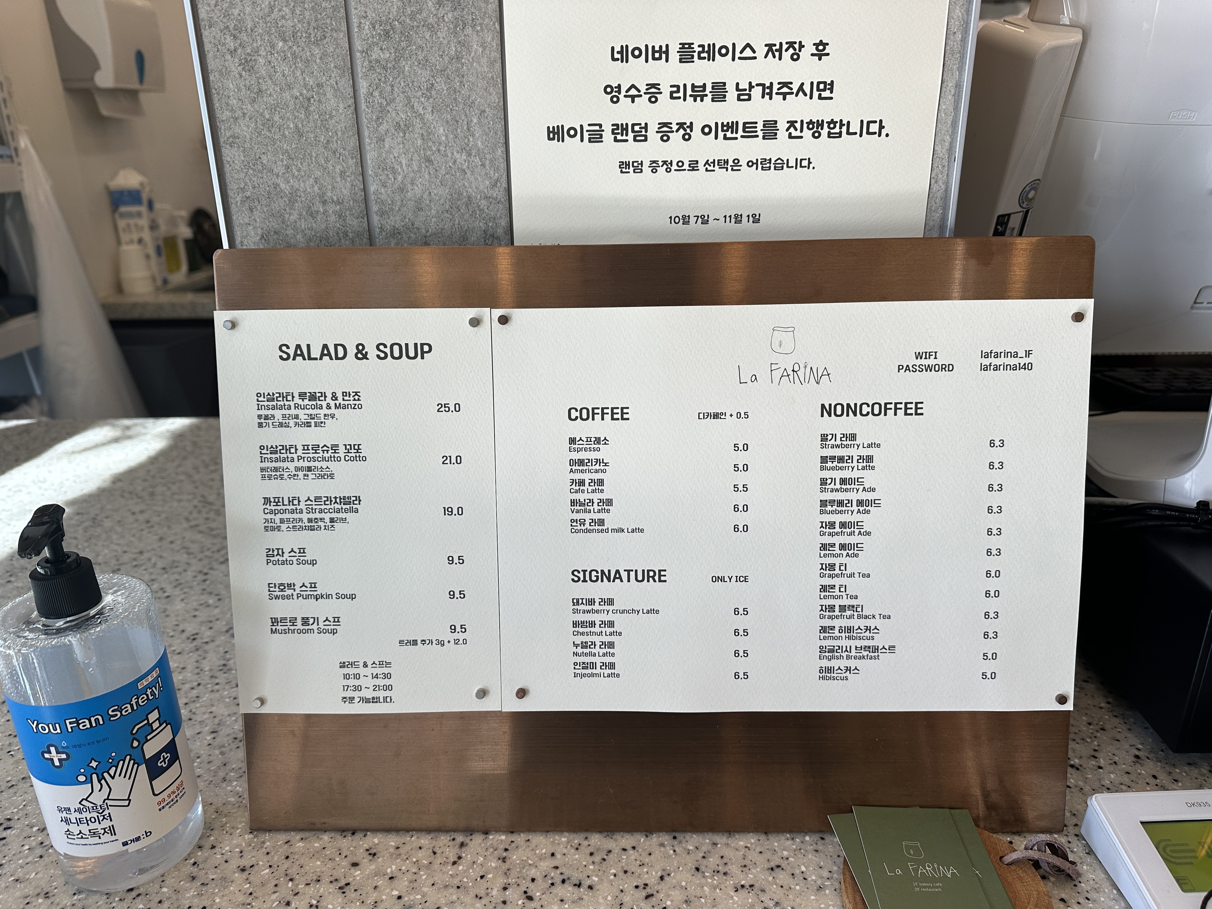 샐러드와 스프, 커피 등의 음료는 메뉴판을 참고하시면 되겠습니다. 샐러드와 스프는 주문 시간이 따로 있으니 참고해 주세요.