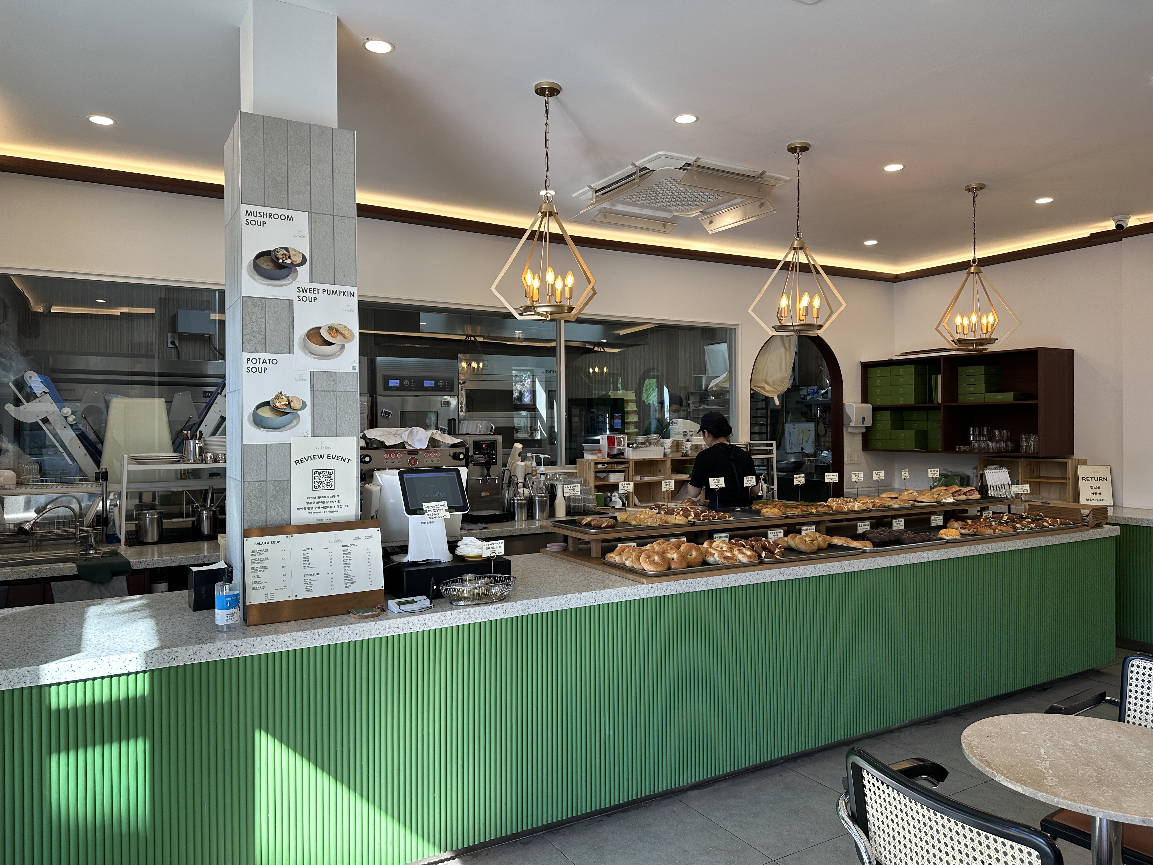 1층에는 이렇게 좌석이 있습니다. 베이글은 왼편의 매대에 올려져 있구요. 안쪽의 조리공간도 예쁘게 인테리어 되어 있고 조명들이나 좌석 모두 예쁘게 되어 있는 라 파리나 내부의 모습입니다.