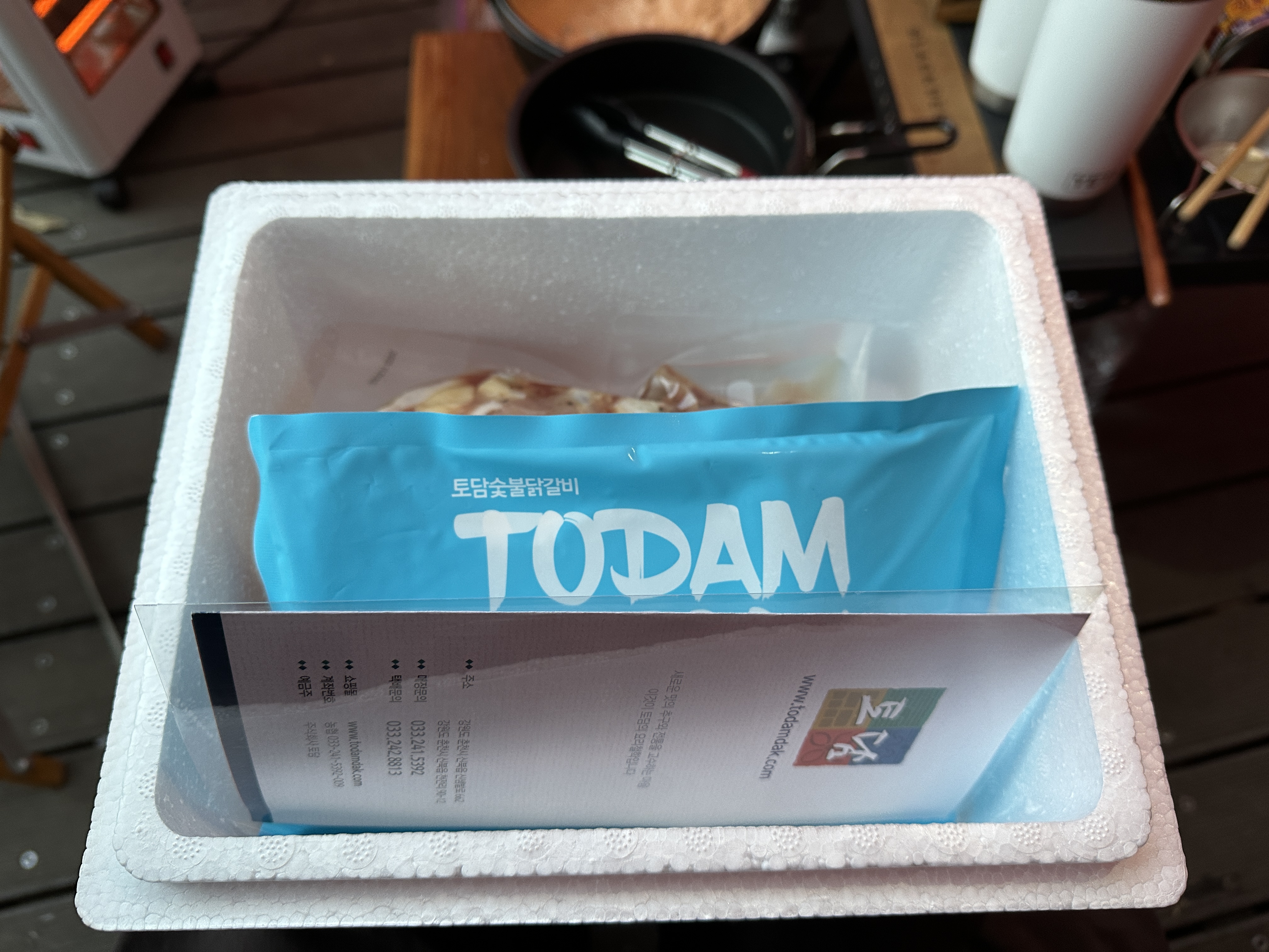 춘천 토담 숯불 닭갈비 포장상태입니다. 즉석에서 팩을 넣어 테이프로 둘둘 감고 주시는데요, 내용물도 깔끔하게 진공포장 되어 있고, 안쪽에 아이스팩도 충분히 넣어주셔서 깔끔하고 무사히 캠핑장으로 이송시킬 수 있었습니다. ㅋㅋㅋ 다시 사진을 보니 또 침이 고이네요.