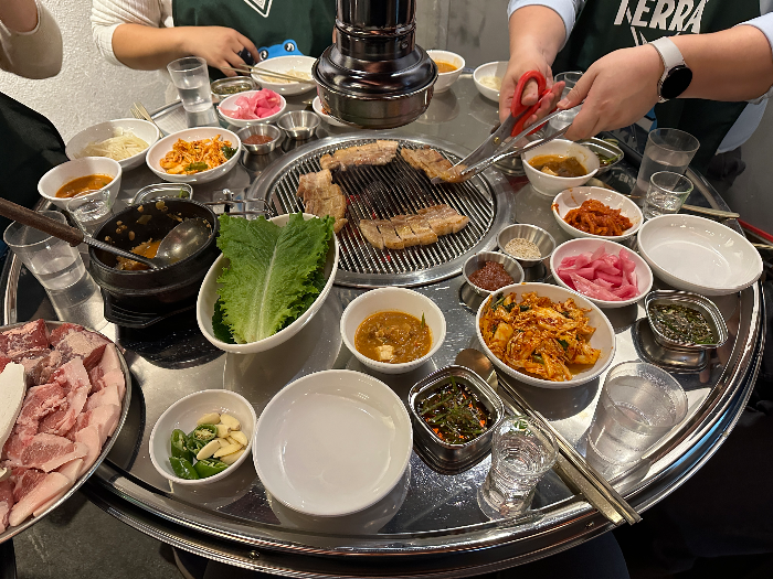 삼겹살을 먼저 먹었어요. 신나게 2인분을 굽고 있는 모습입니다. ㅋㅋㅋㅋ 상차림도 심플하지만 필요한 건 다 있어요. 사진이 부족하네요... 오랜만에...