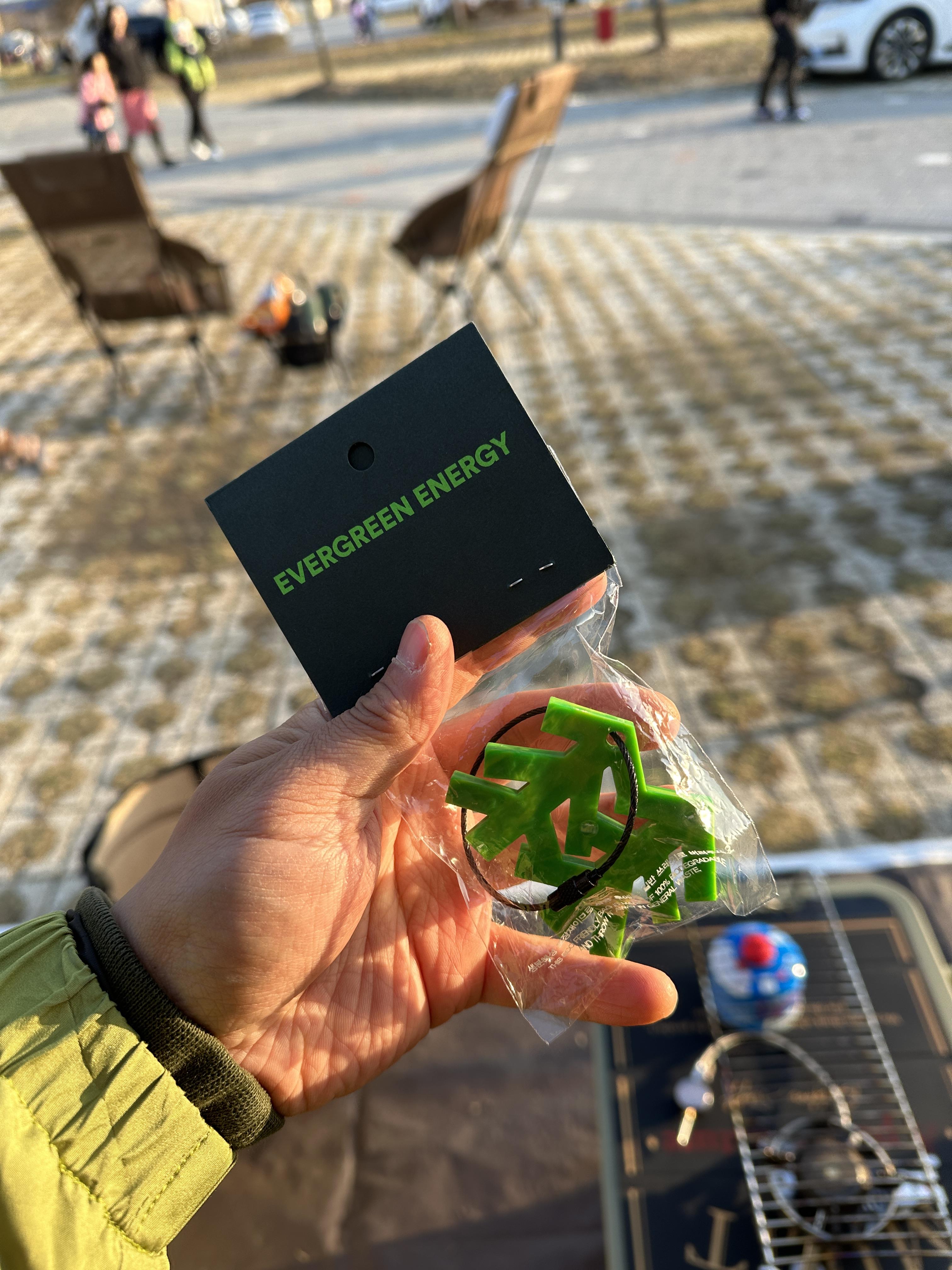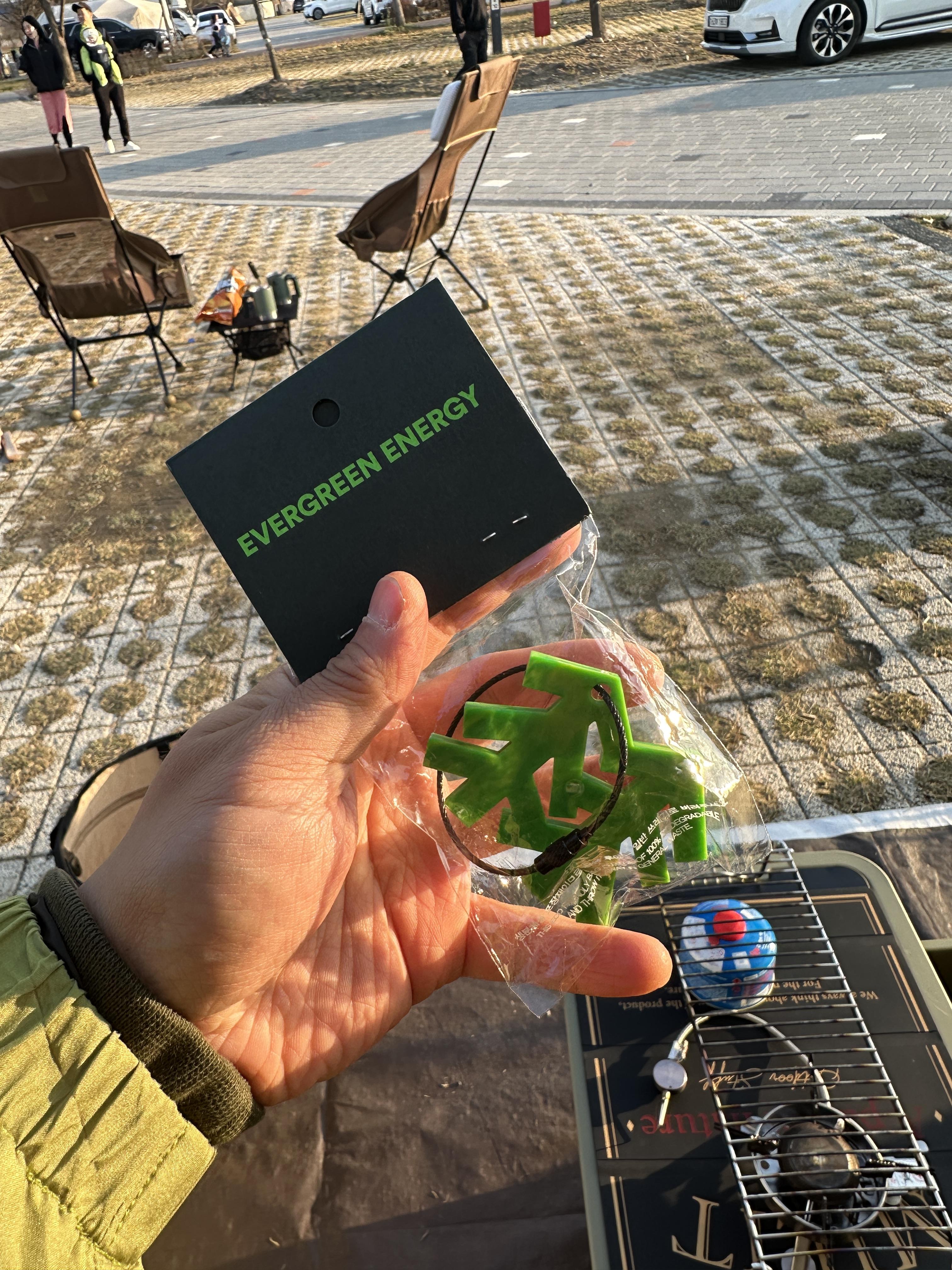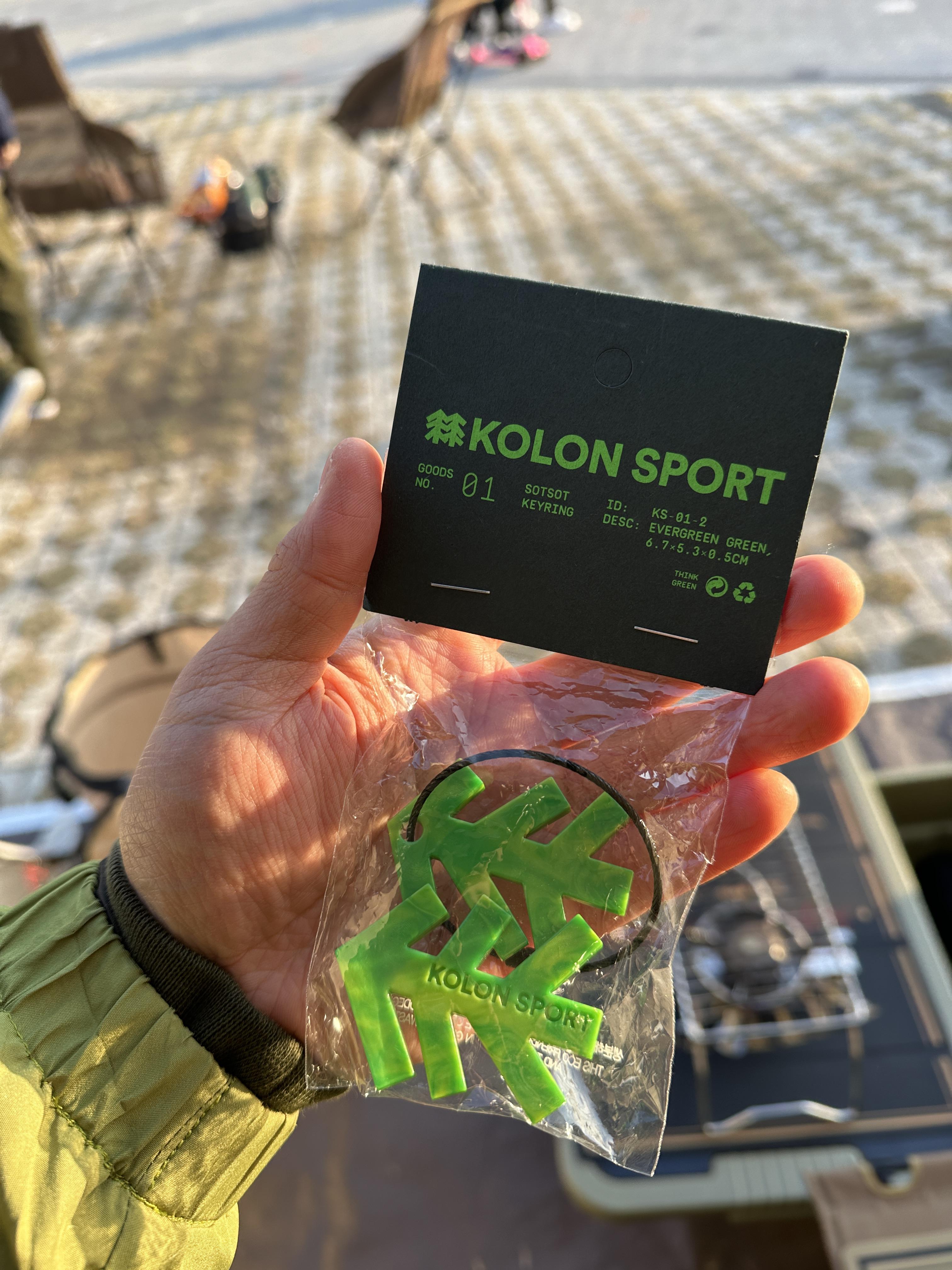 키링의 디자인은 깔끔합니다. 코오롱의 상징인 솟솟을 형상화 한 모양이고, 에버그린(EVERGREEN)이던 행사 슬로건?에 맞게 녹색이었어요. 쨍한 녹색도 아니고 약간의 색감이 가미된 녹색이라 더 예뻤어요.
