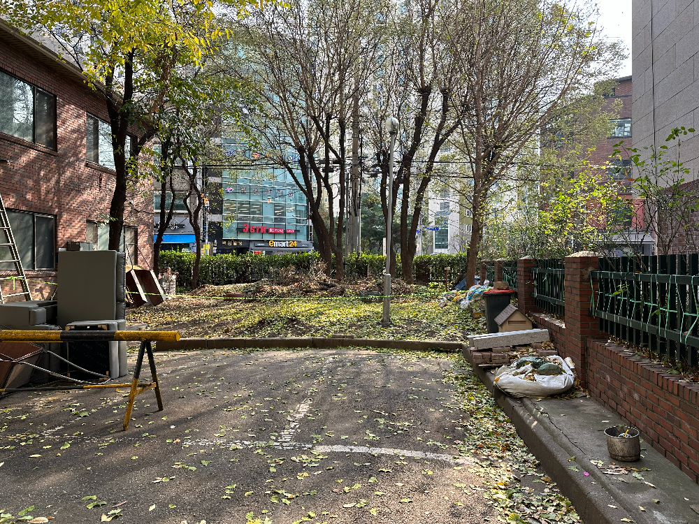 후문에는 단지배치도와 지상주차장이 있어요. 조금만 옆으로 보면 바로 노인정이 있는데, 옆에 보면 사진처럼 조금 보기 좋지 않은 상태로 방치된 공간이 있네요. 아쉽