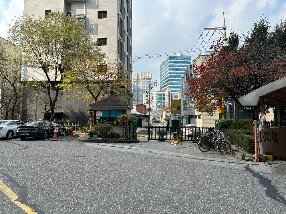 정문으로 나와봤습니다. 차량 진출입시 차단봉이 있어서 관리가 되는 모습입니다. 정문의 양 옆으로 상가건물이 위치하고 있고, 중형 동네마트가 있고, 카페나 간단한 빵집 등 편의시설들도 있습니다. 뭐 그래도 성수동 핫플들이 조금 길만 건너가면 있는데, 이정도면 됐다고 생각합니다.