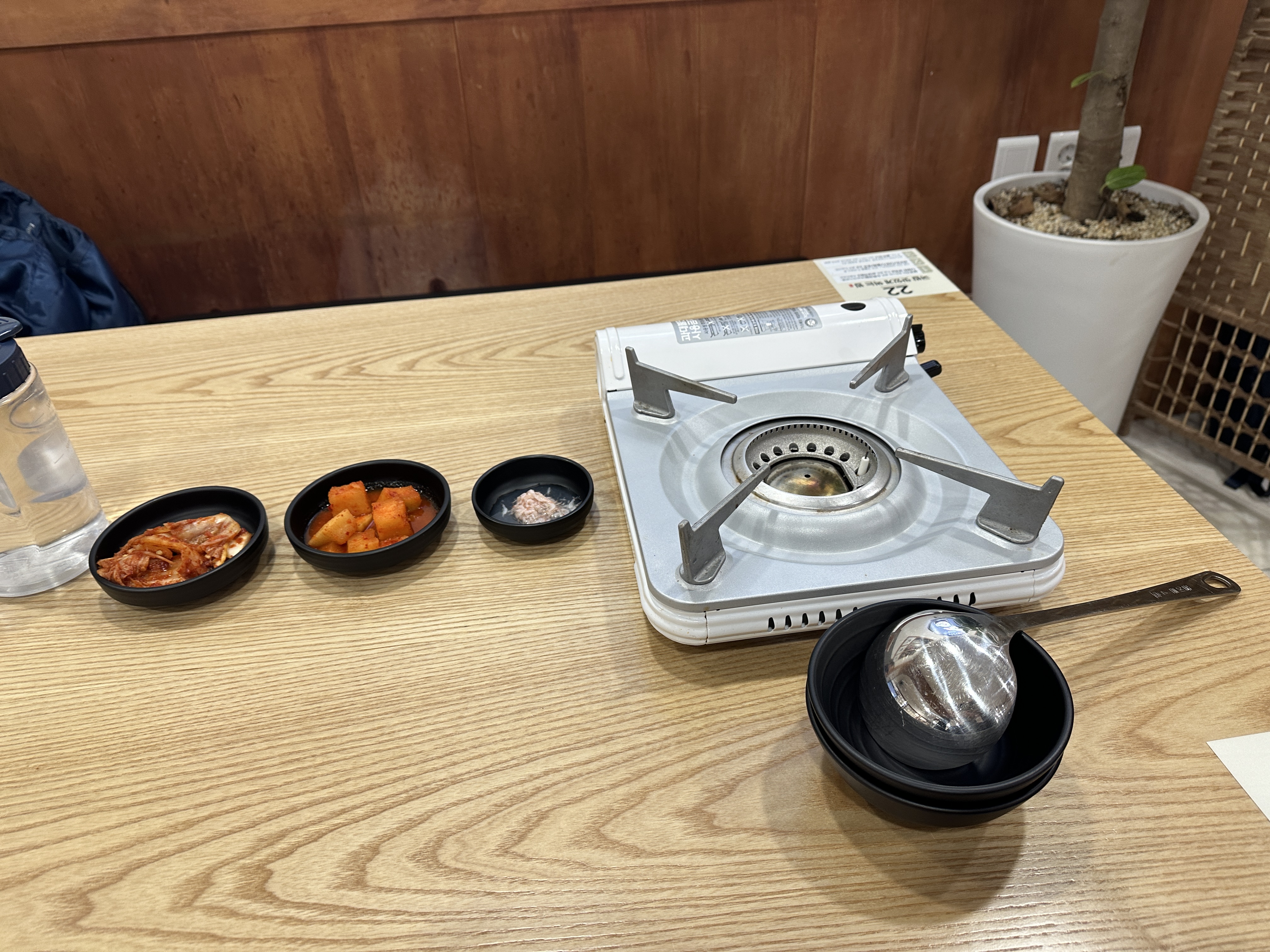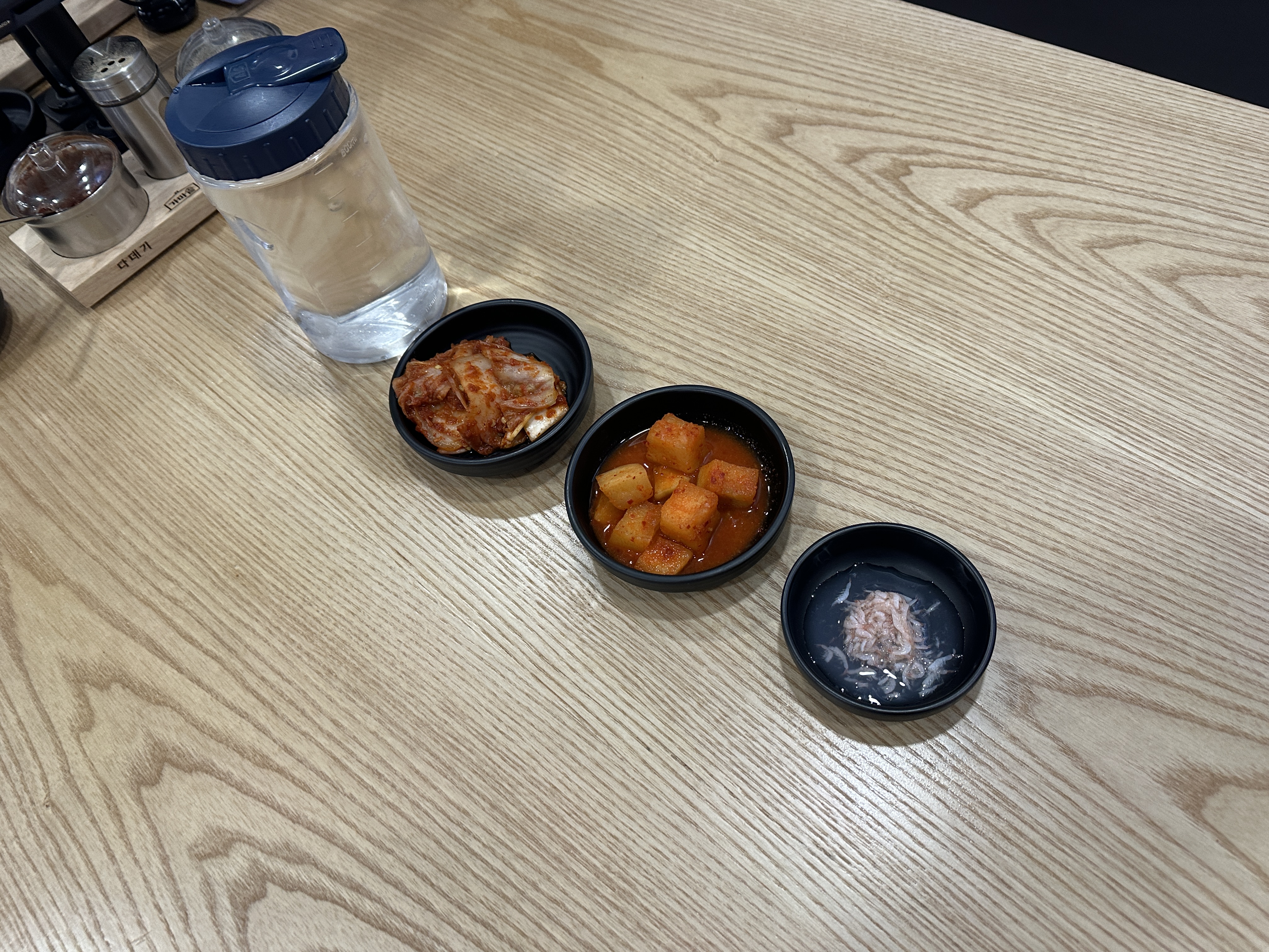 테이블 위에는 이렇게 입맛에 맞게 첨가해 드실 수 있는 조미료들이 비치되어 있고, 물컵, 앞접시도 있네요.