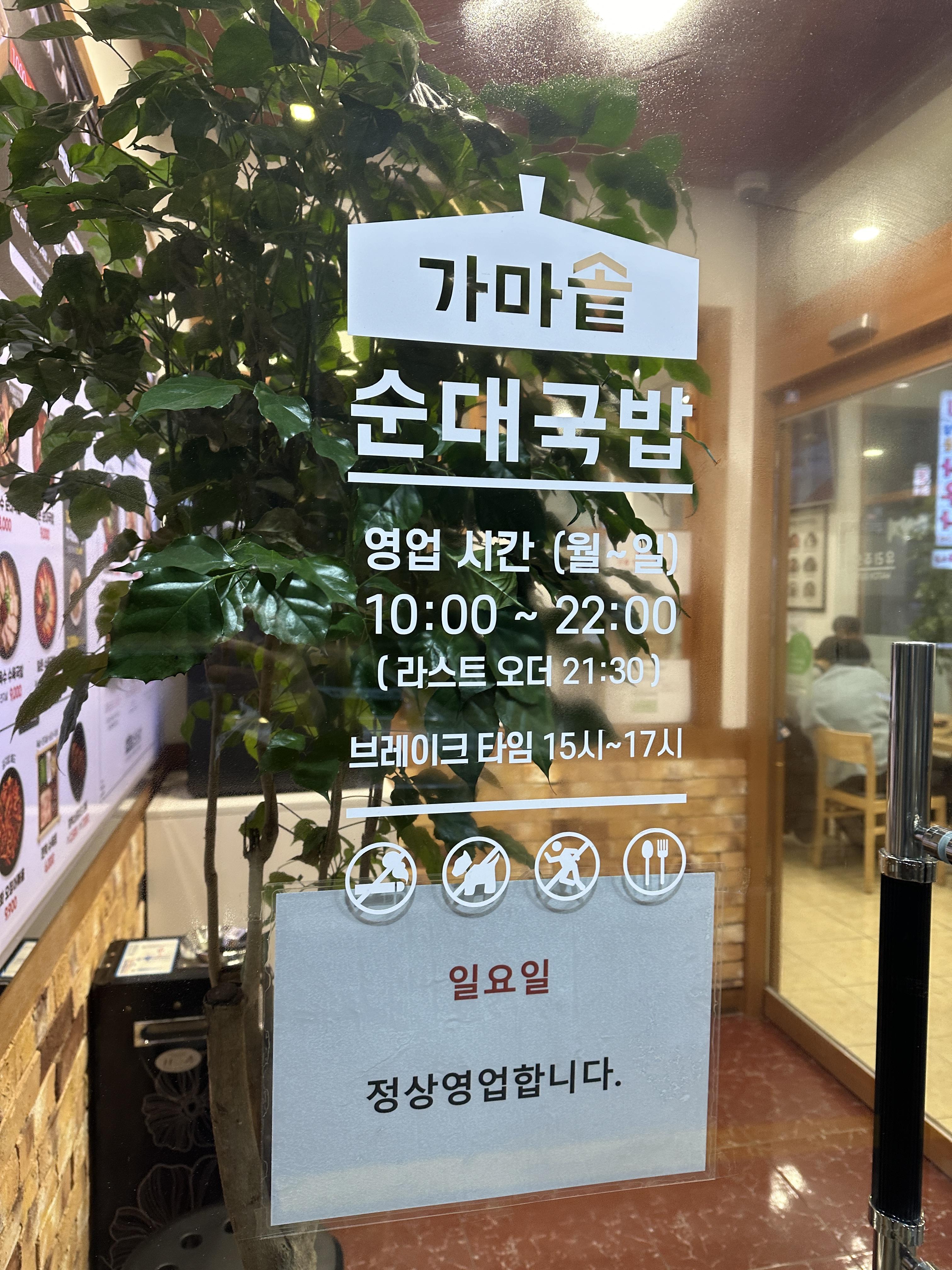 가마솥순대국밥 신사점의 영업시간은 일요일까지 정상영업 하며, 10시 ~ 22시까지 운영합니다. 브레이크 타임은 15시 ~ 17시이며, 화장실은 식당 내에 없고, 돌아 나가서 건물 화장실을 이용합니다.