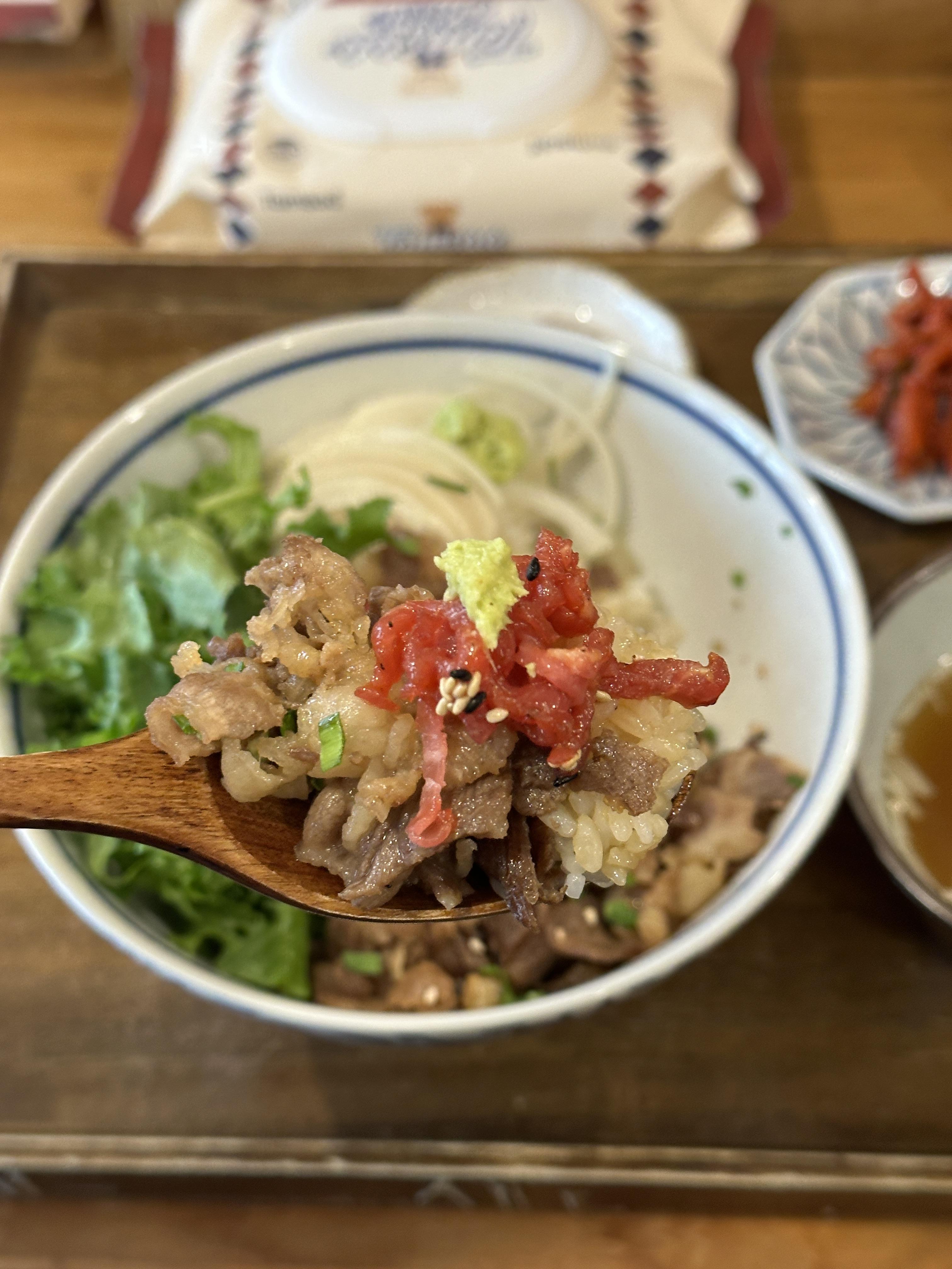 육회와 차돌의 조화가 의외로 괜찮은 느낌입니다. 편하게 비벼 먹기 전에, 맛있게 먹는 법대로 한 번 먹어봅니다. 와사비 덕분에 알싸하게 먹으니 더 기분이 좋네요.